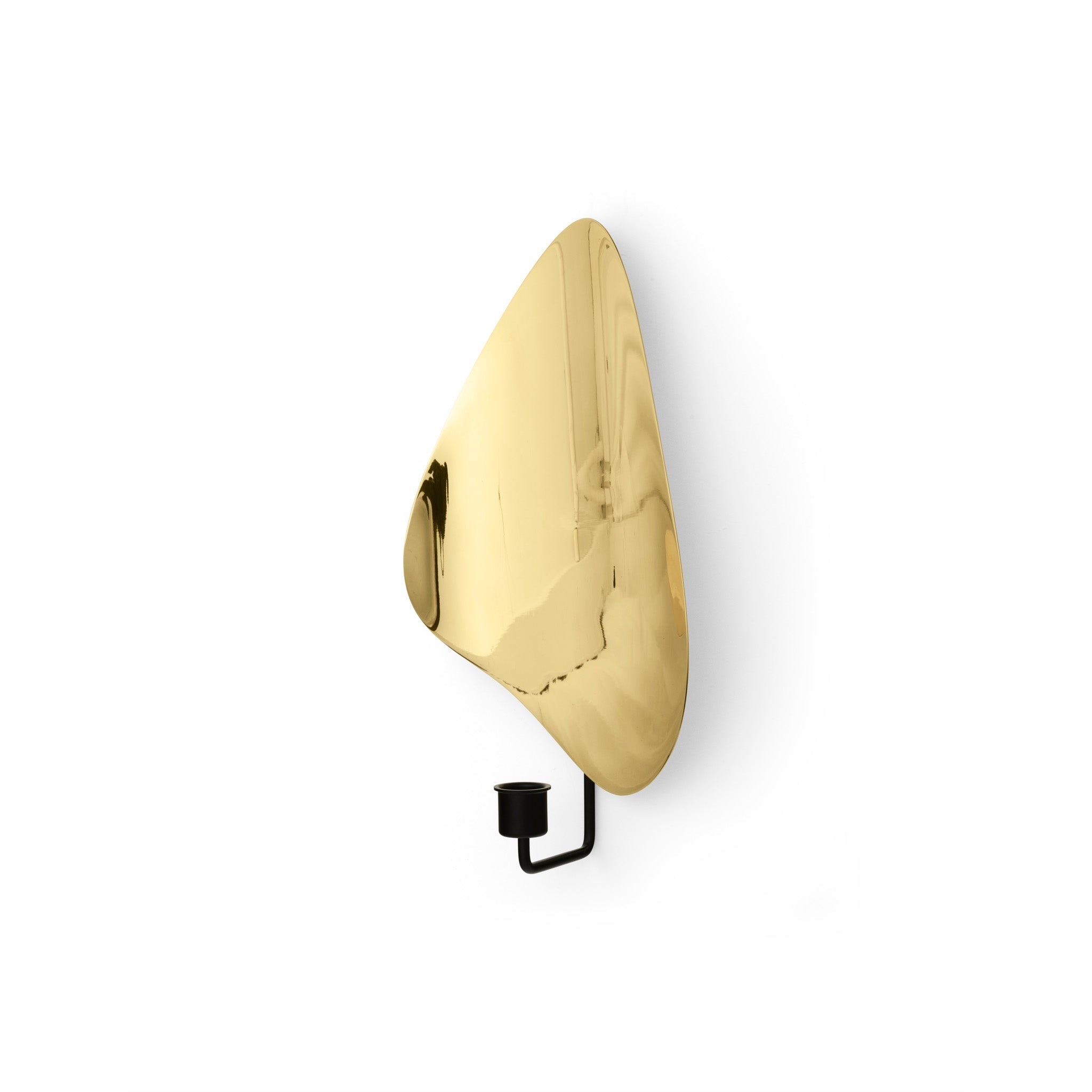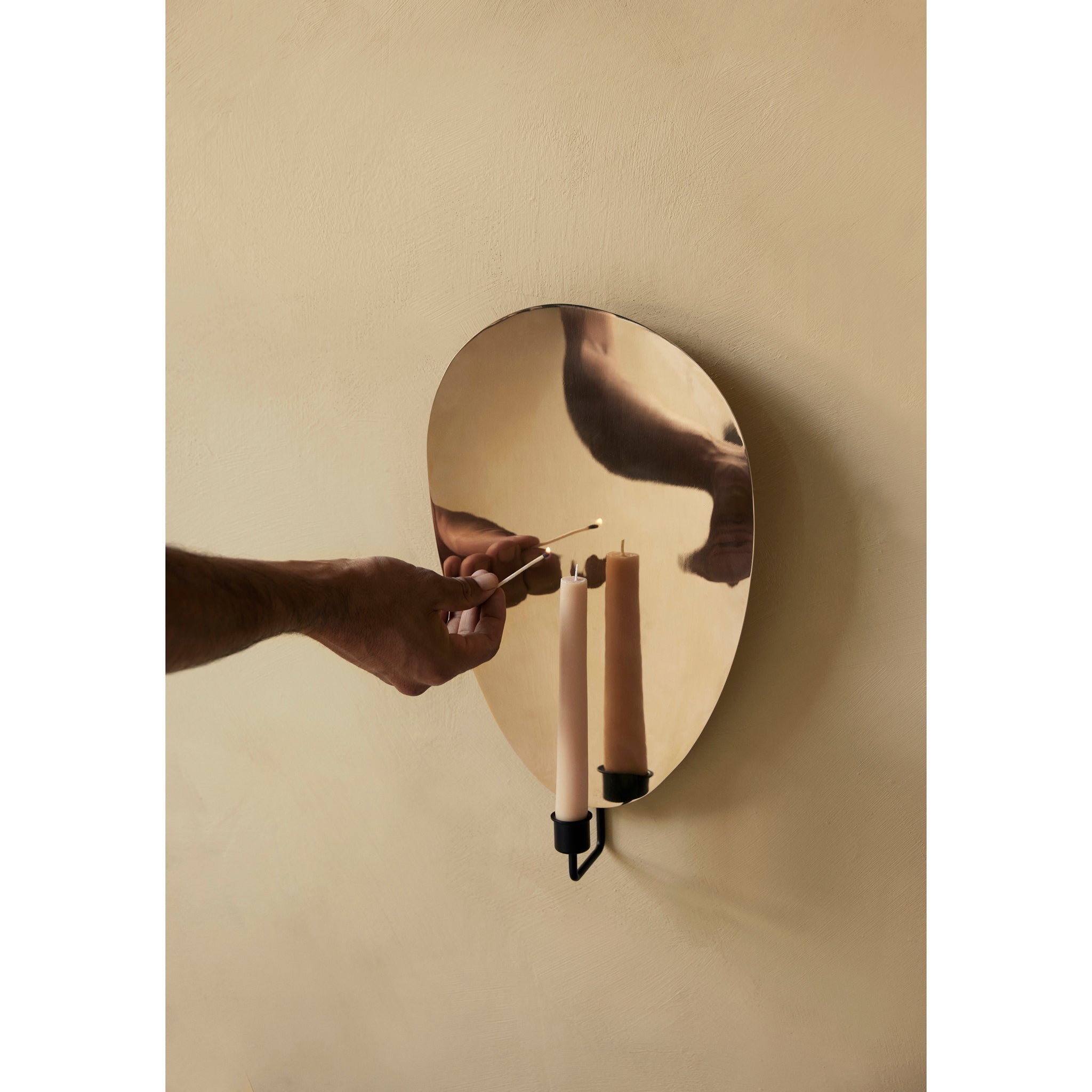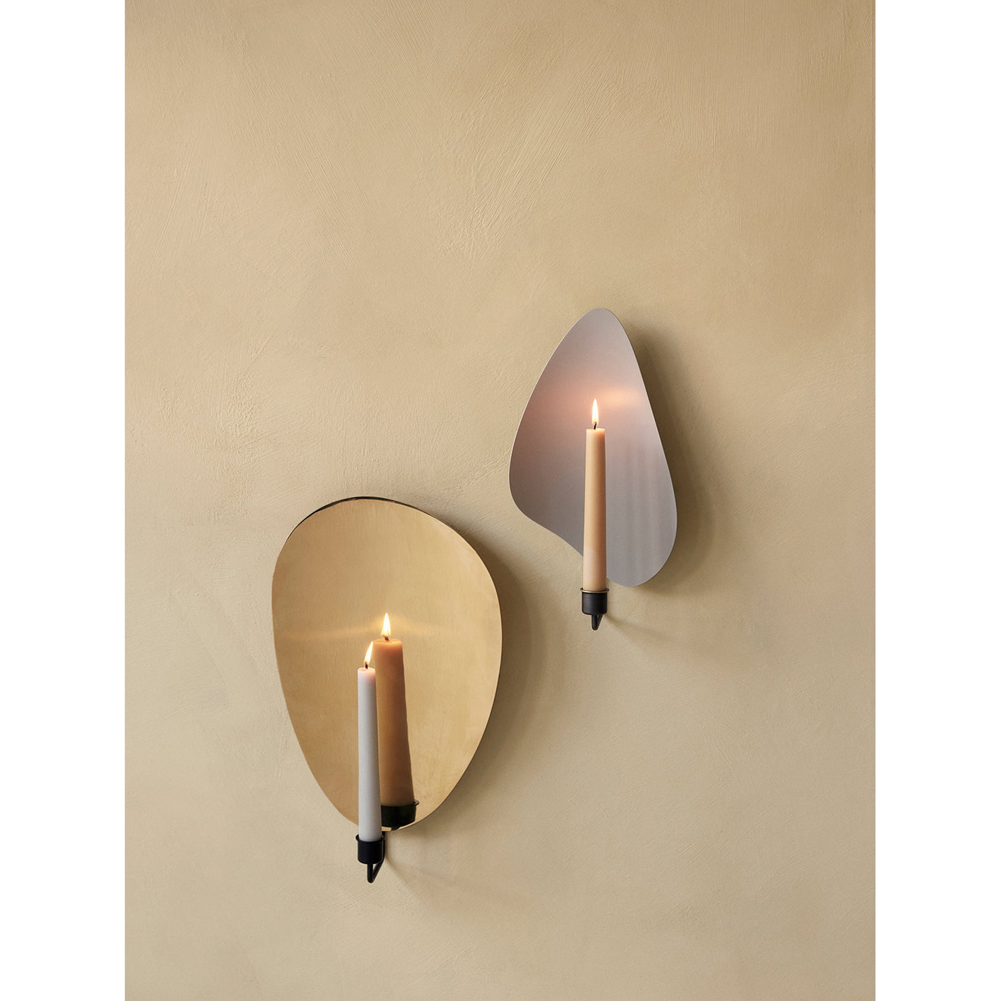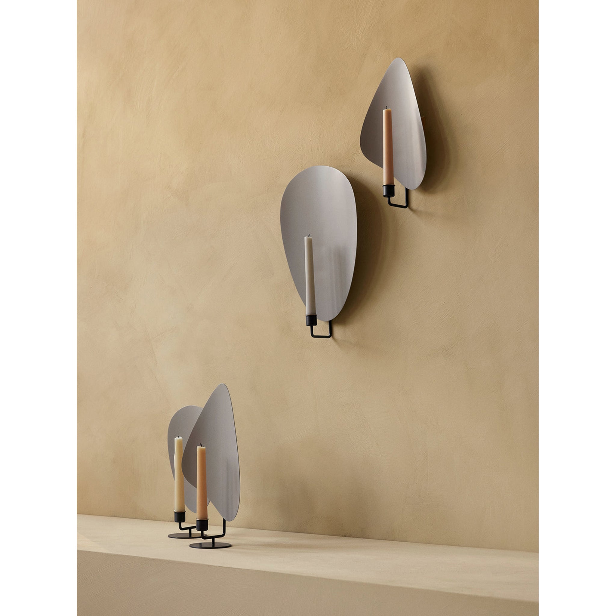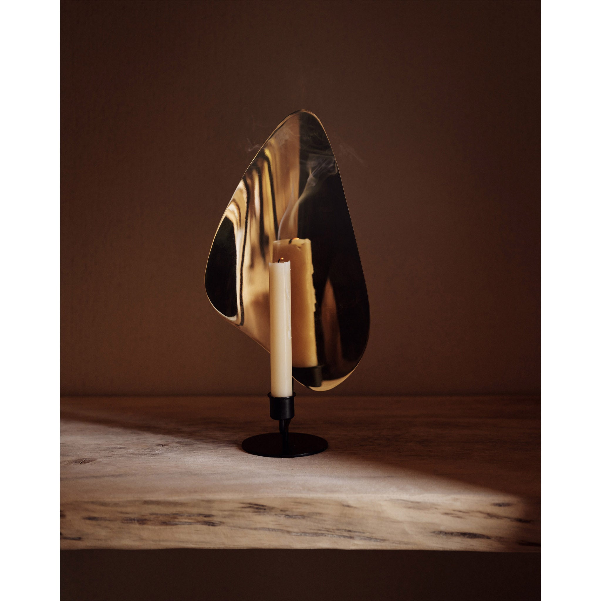 Inspired by French modernist lighting fixtures and designed to resemble a flickering flame, Flambeau is a sculptural design with playful presence. The metal backplate magnifies and reflects candlelight to create intriguing shadows and beautiful ambience.