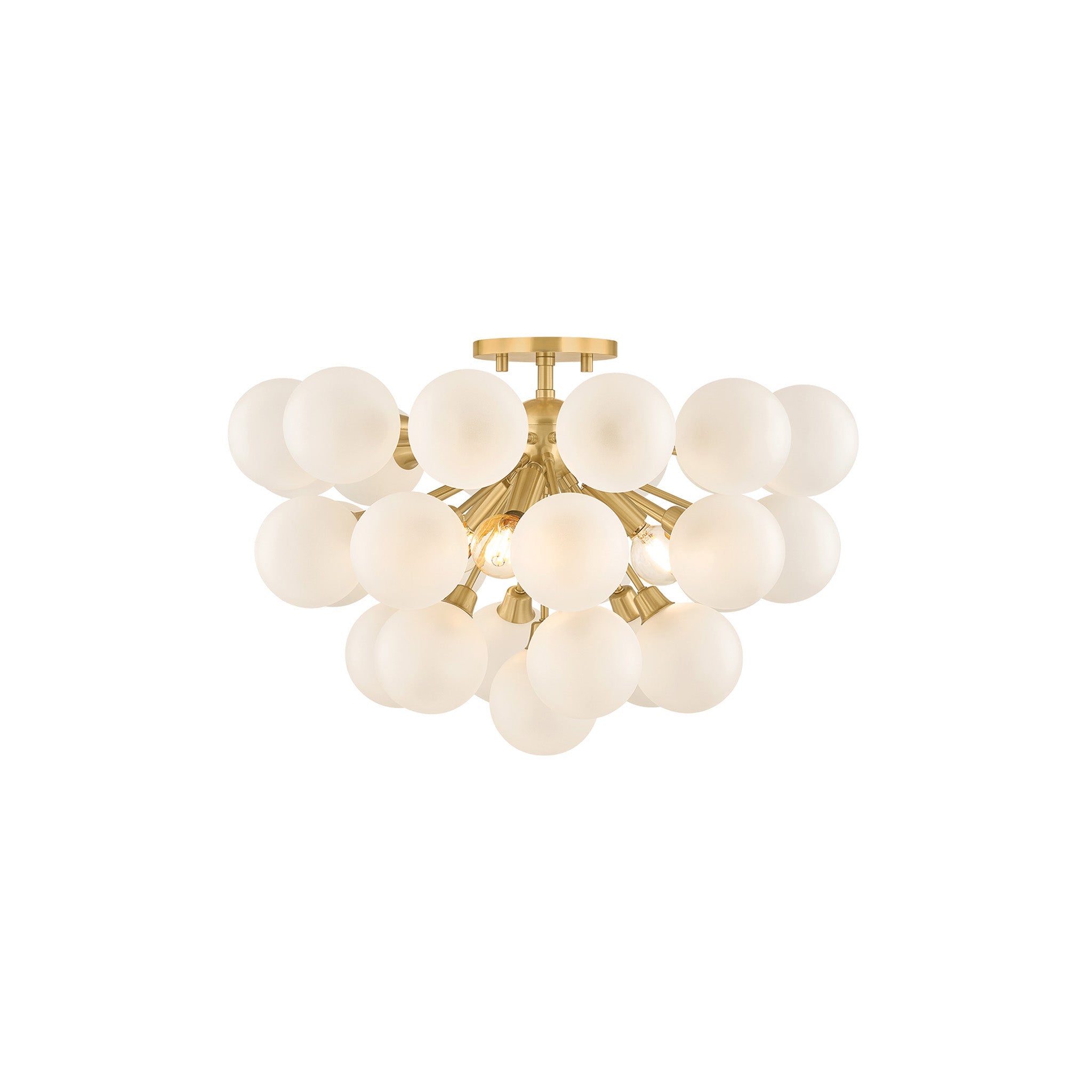 Antoneta reimagines a classic Sputnik chandelier with a modern twist. Clear etched glass globes form a dense, bubbly silhouette of light and geometry. The clear etched glass shades soften the ambience, while the Aged Brass finish adds visual warmth. Available as a 3-light semi-flush or a 6-light chandelier, this celestial centerpiece is worth celebrating.