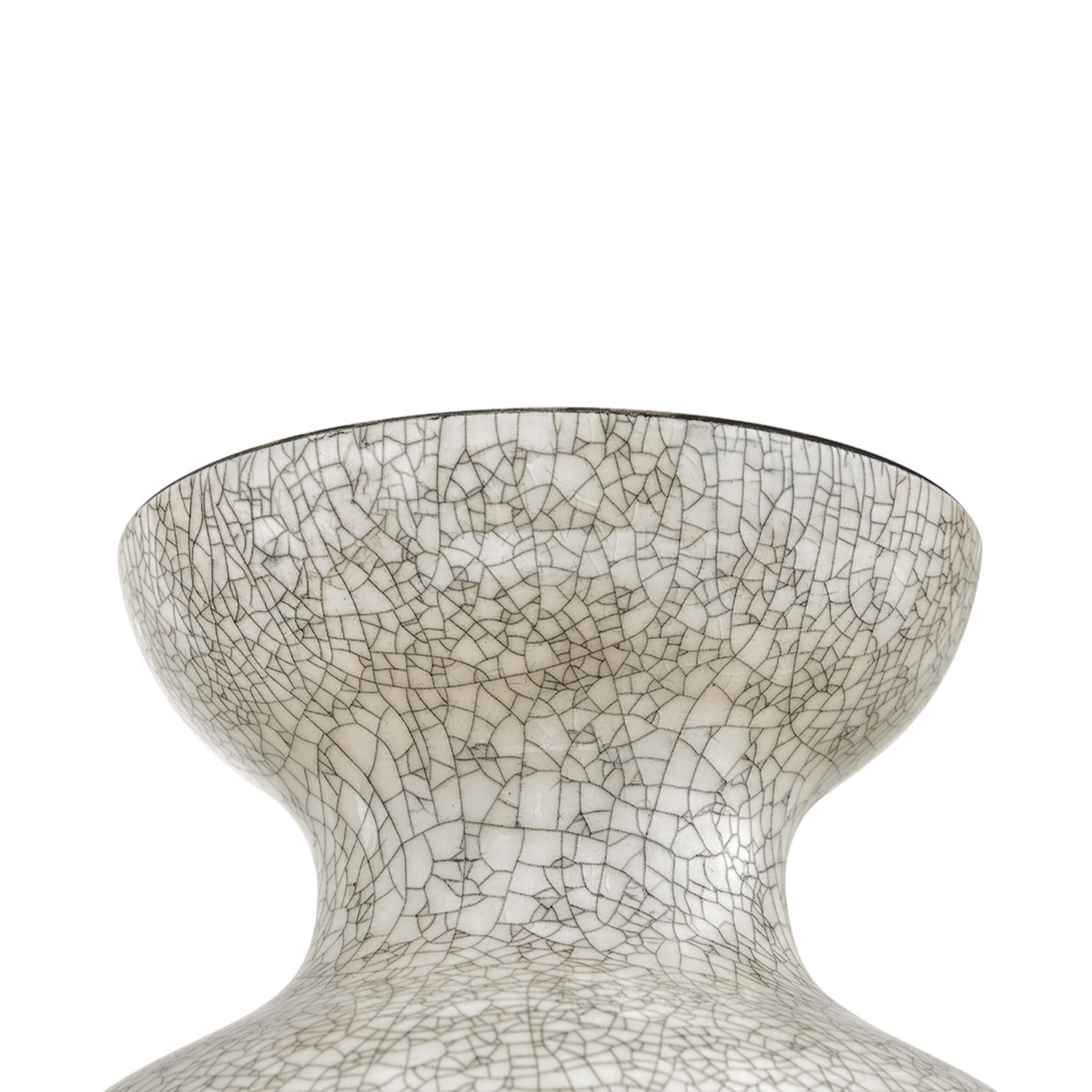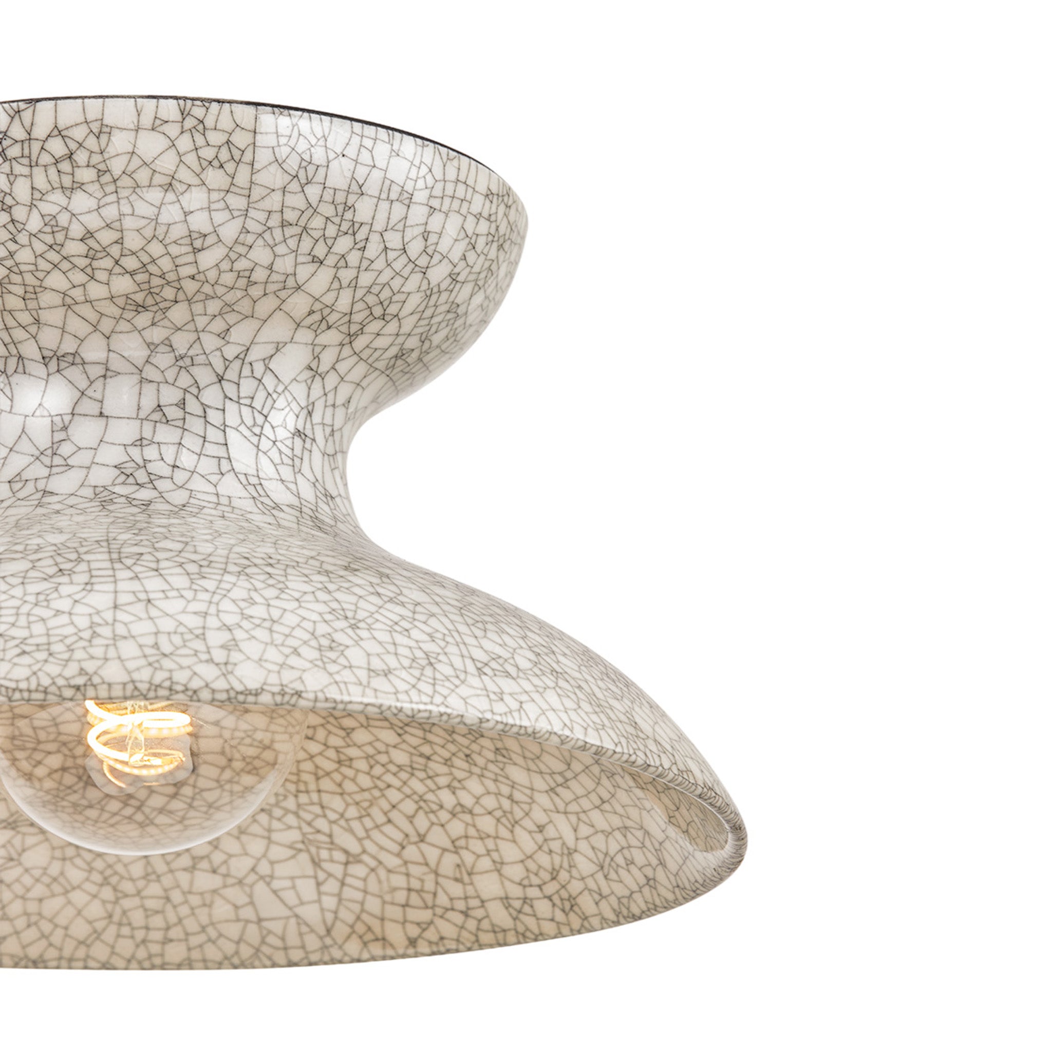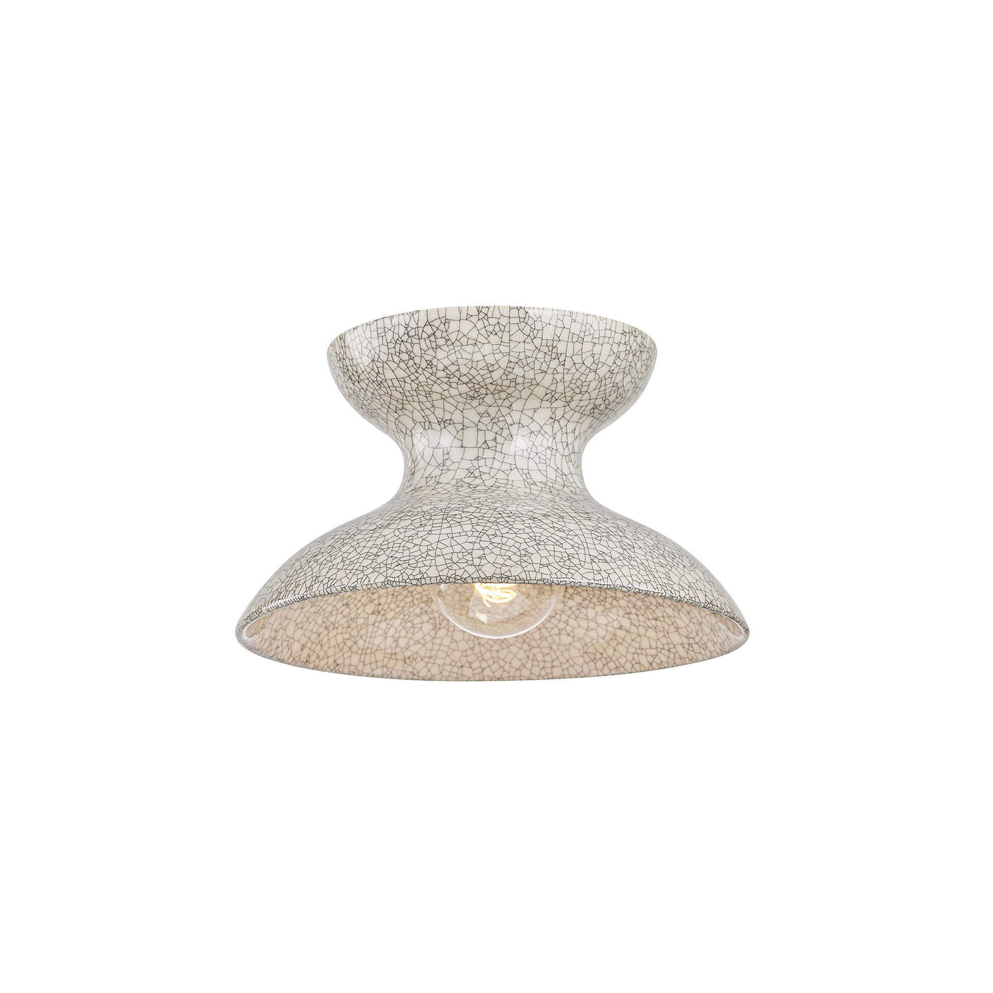 A contemporary take on a 1960s design, the Carina flush mount features a subtly organic shade shape with hidden Aged Brass-finished hardware. The glossy glazed Belgian Crackle ceramic finish softens the minimalist silhouette, making it feel warm and approachable. A perfect modern essential, this utilitarian, yet elevated fixture works well in a kitchen or dining space.