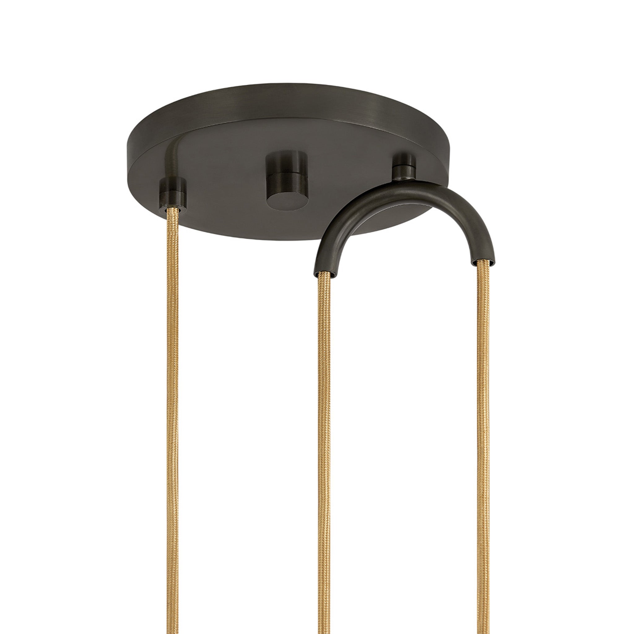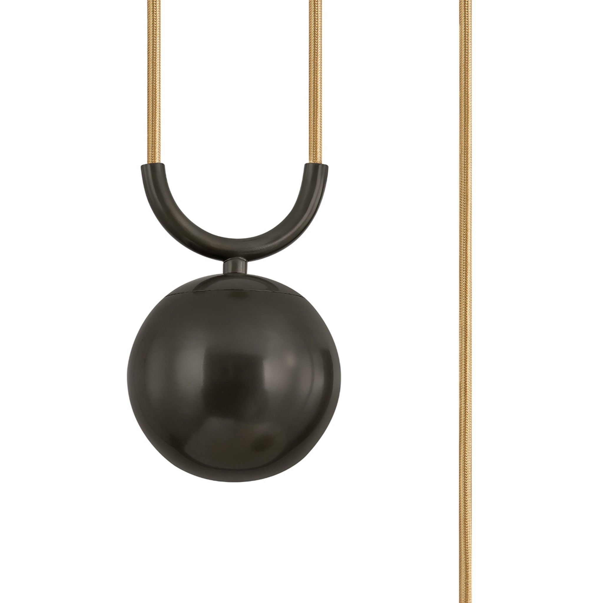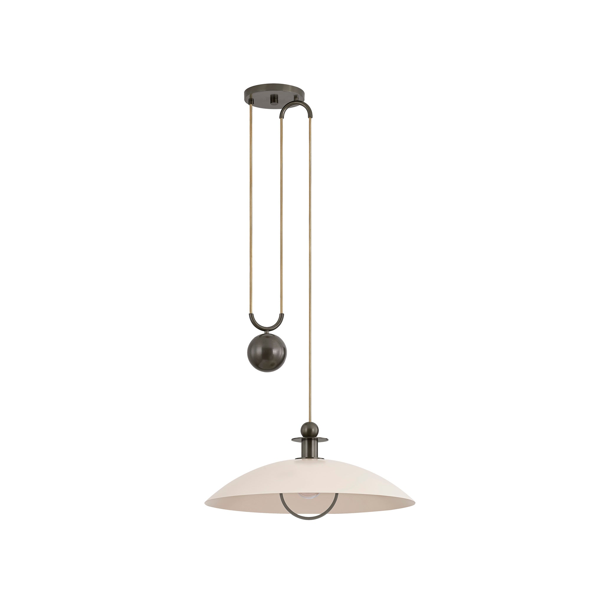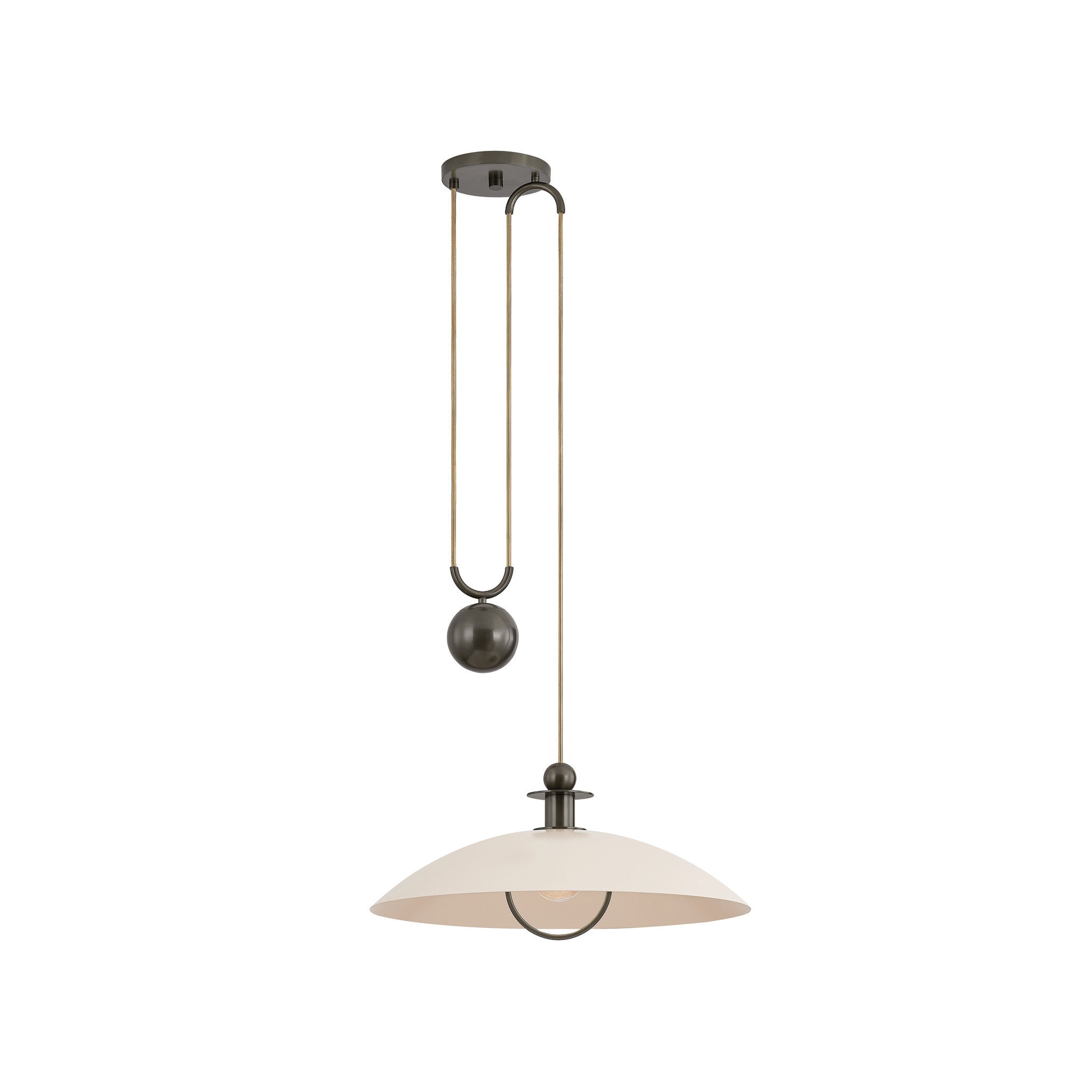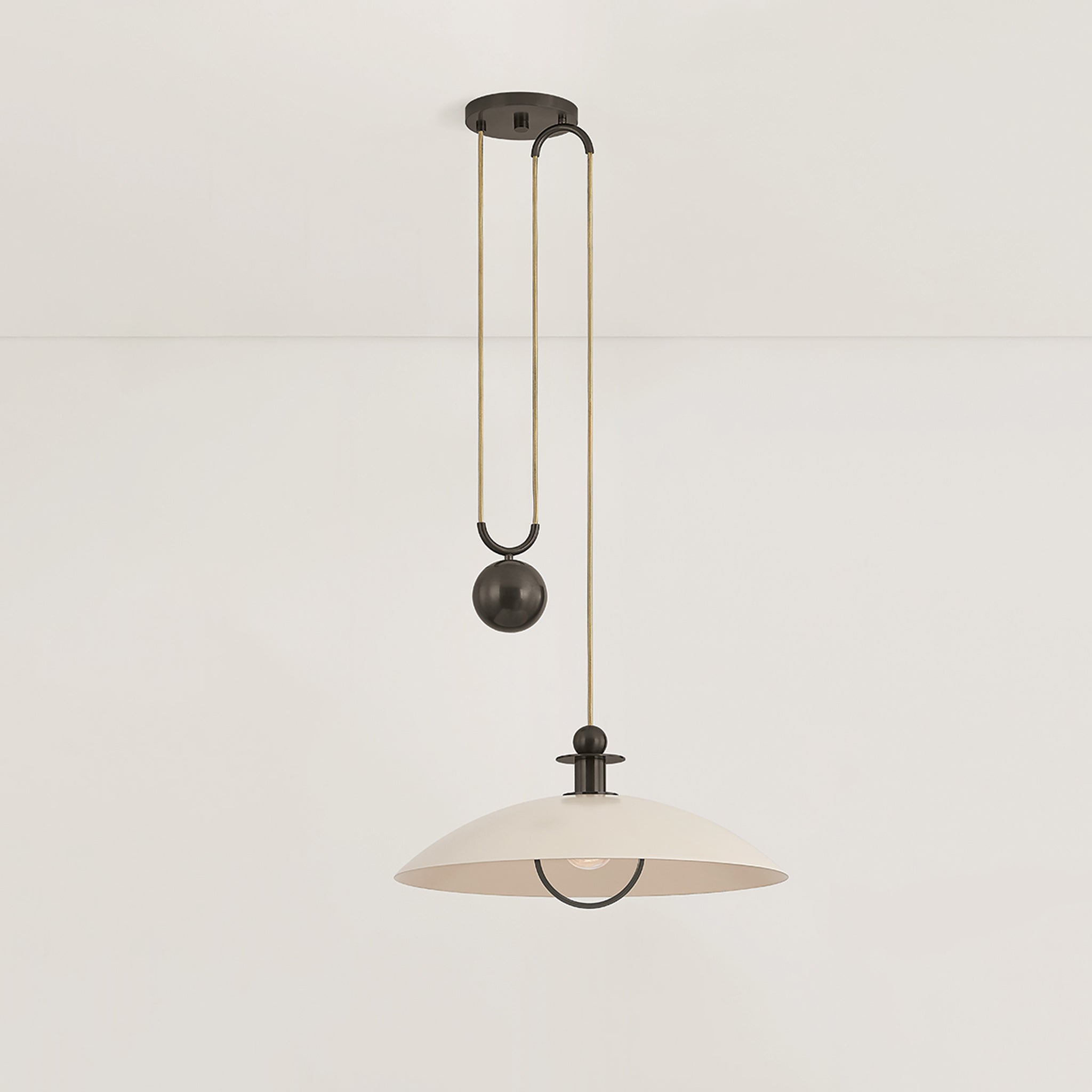 Loops, spheres, and cylinders converge to create the artful composition of this rise-and-fall pendant. Beyond adding style, the collage of geometric hardware elements is also integral to the height-adjustable suspension. A Soft Bisque shade serves as the focal point of Dottie, while the Aged Brass counterweight ball completes the fixture with a striking jewelry-like detail.