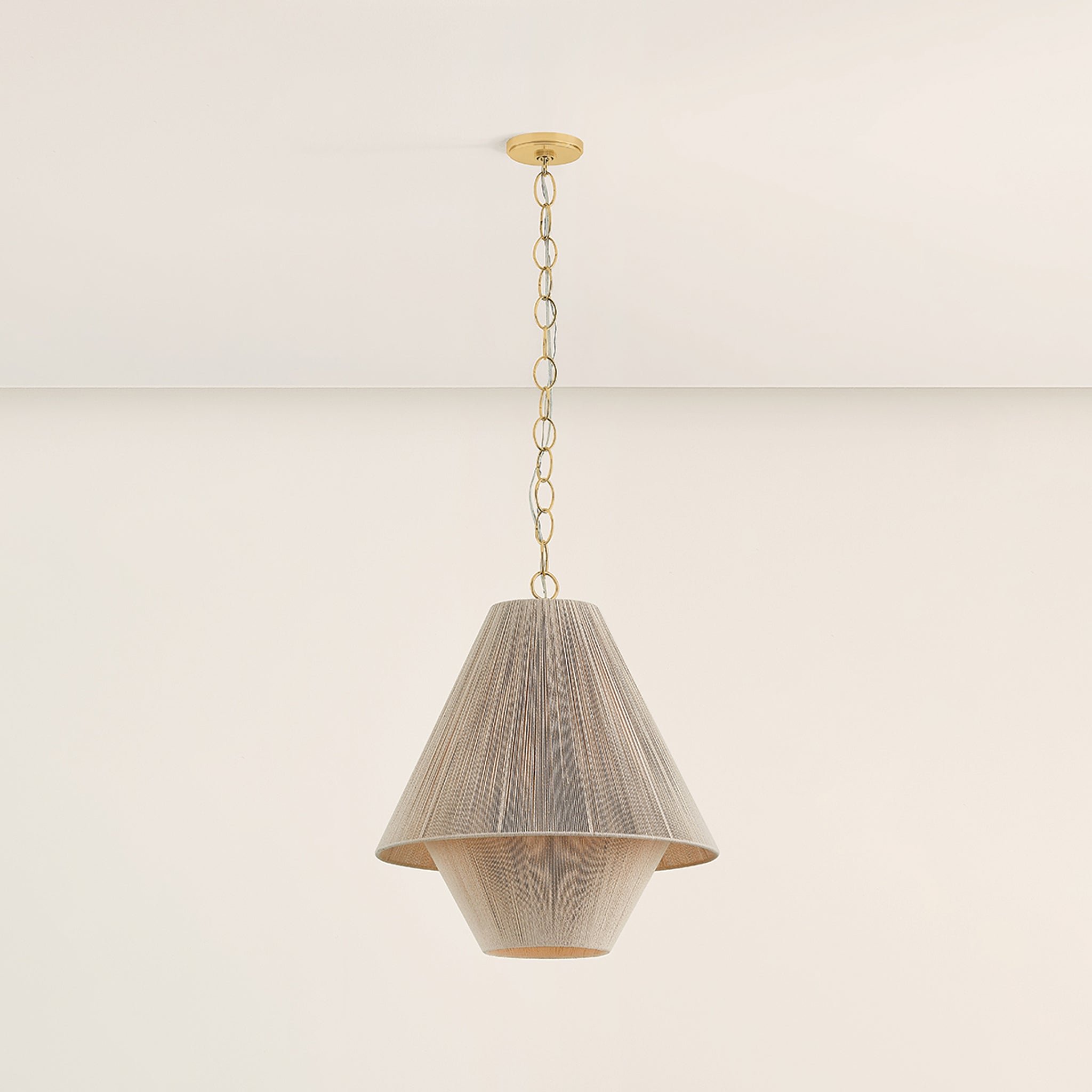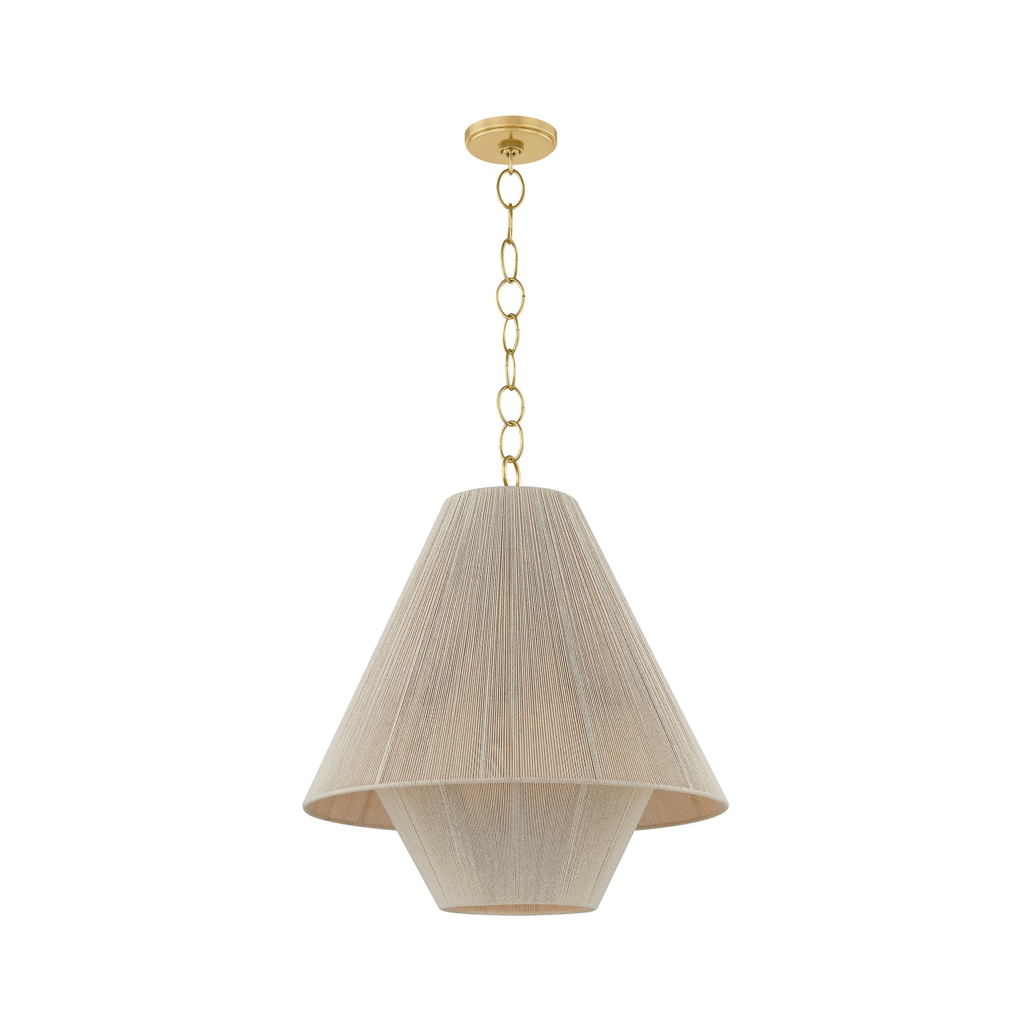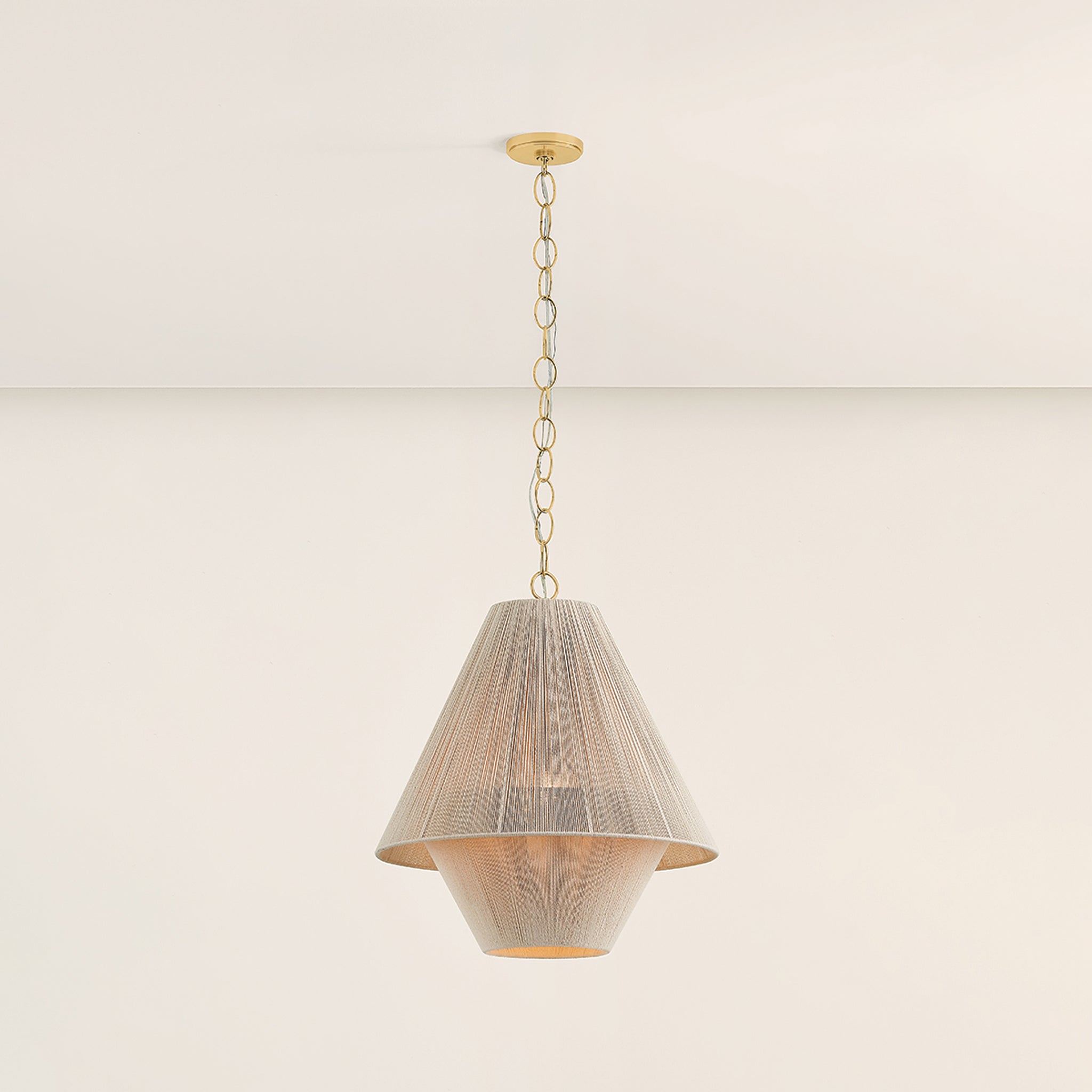To create the casual elegance of the Eleanor pendant, two light and airy string shades are nested around a central light source. The overlapping of the conical shades creates a subtle moire effect, adding depth to the dynamic silhouette. Suspended by a simple, yet refined Aged Brass chain, Eleanor is perfect over a dining table or in a bedroom.
