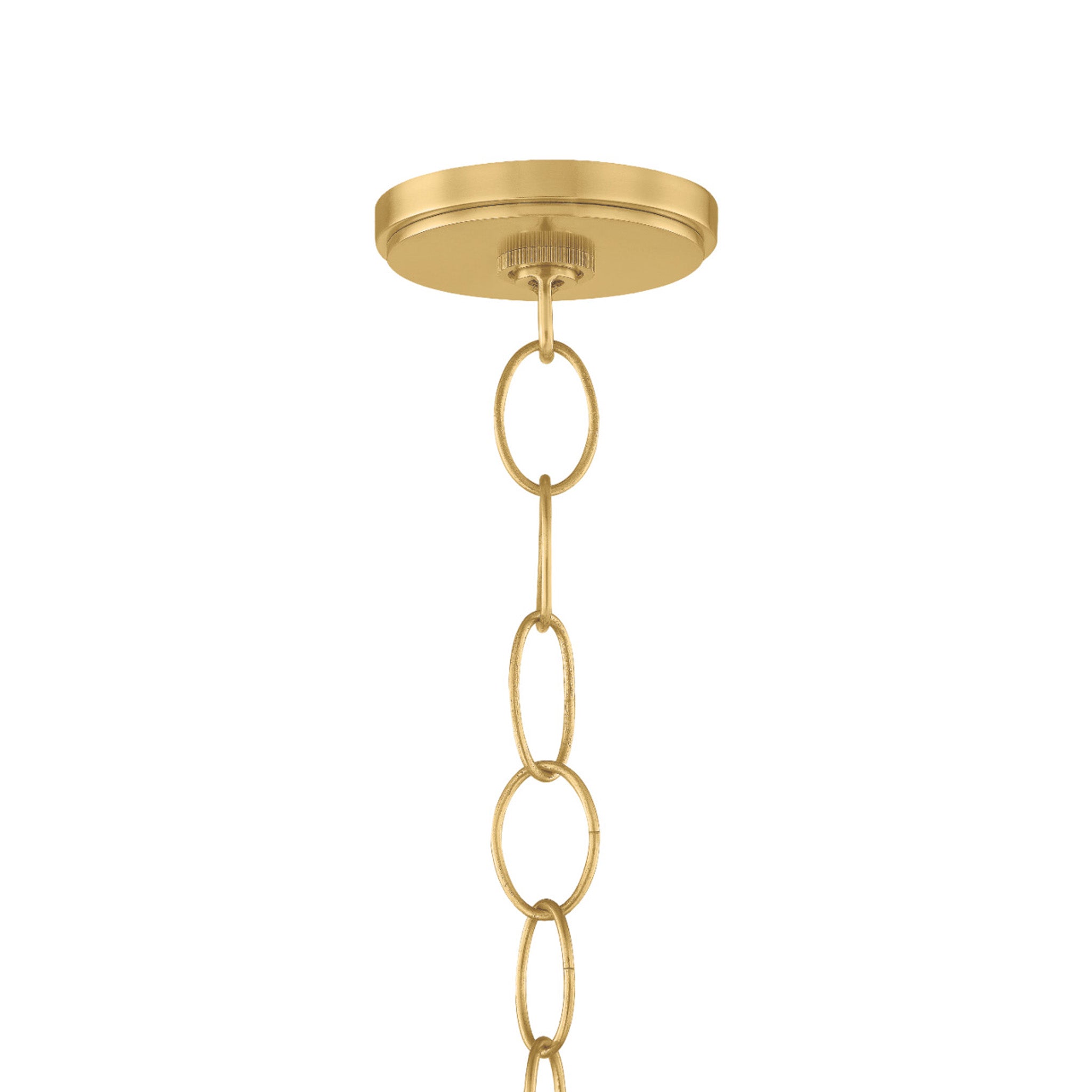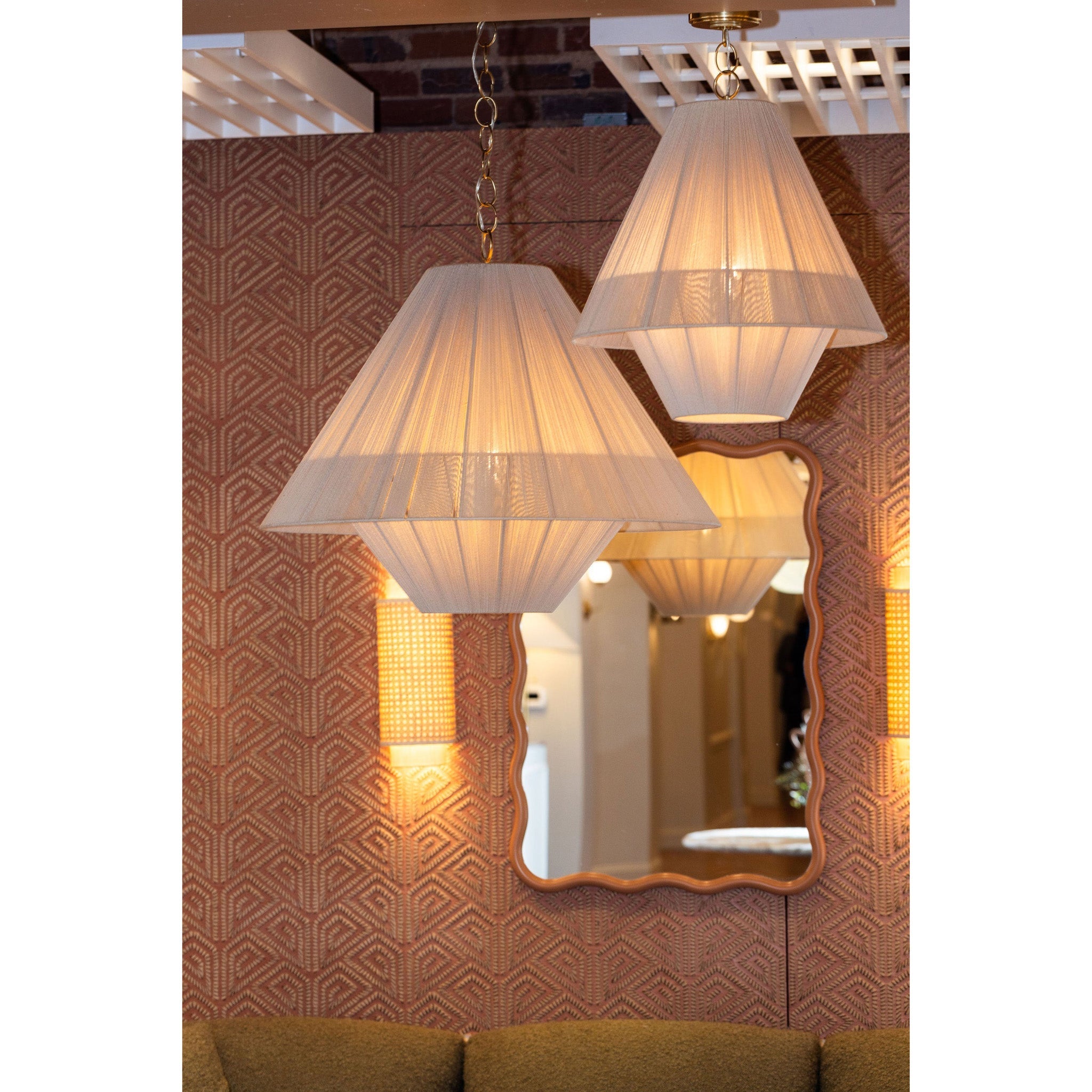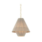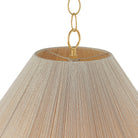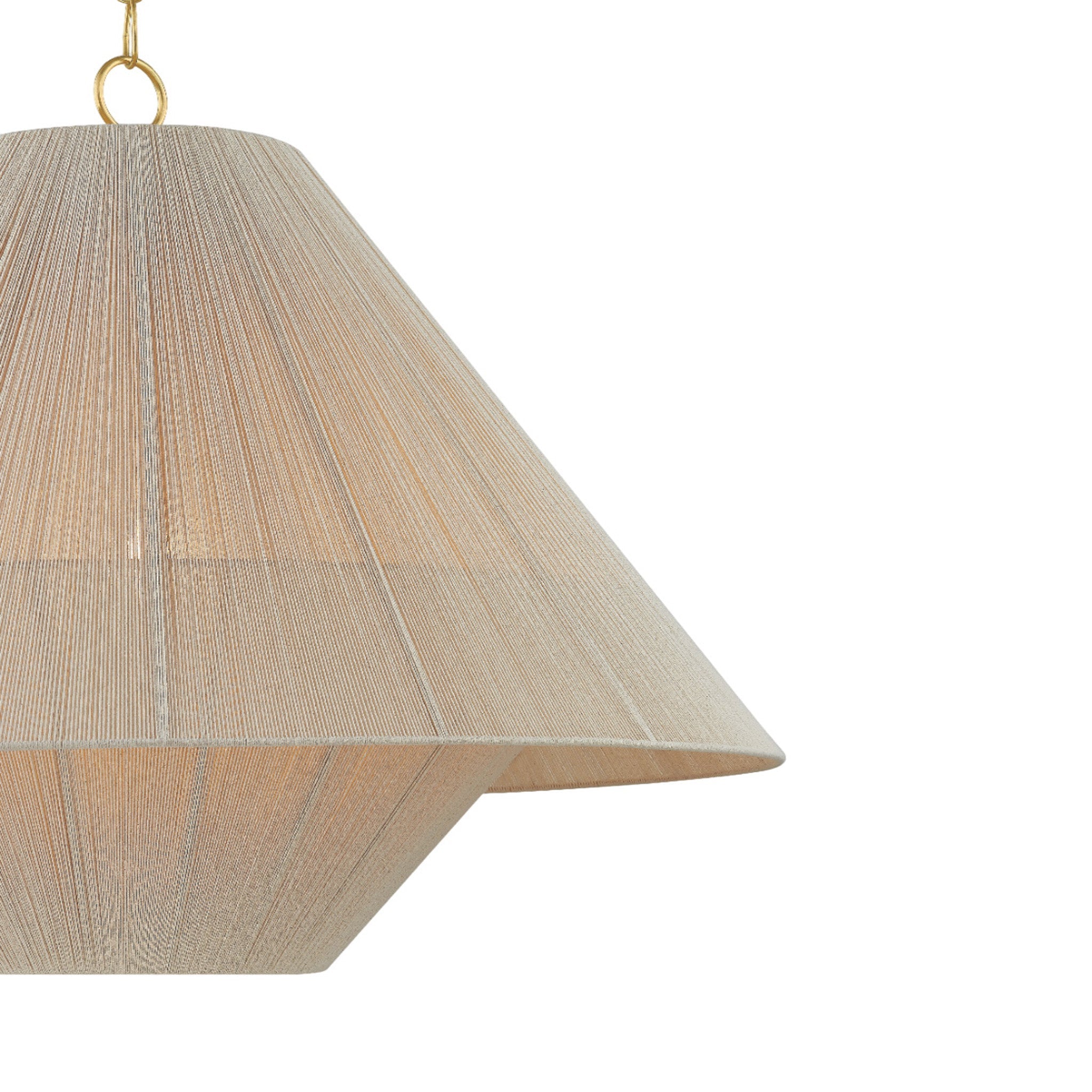 To create the casual elegance of the Eleanor pendant, two light and airy string shades are nested around a central light source. The overlapping of the conical shades creates a subtle moire effect, adding depth to the dynamic silhouette. Suspended by a simple, yet refined Aged Brass chain, Eleanor is perfect over a dining table or in a bedroom.