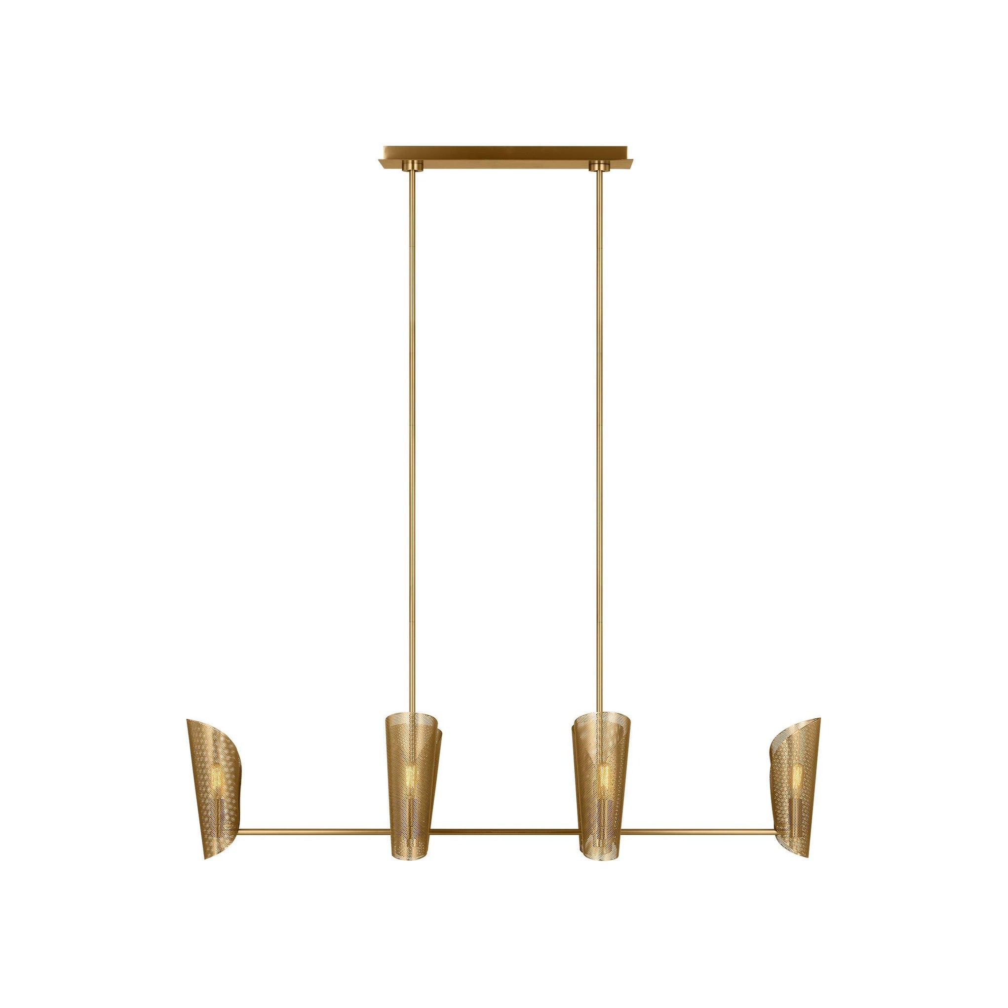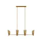 Grand lustre linéaire d'intérieur contemporain Plivot à 6 lumières, à intensité variable, en laiton bruni et finition dorée, avec abat-jour en acier et laiton bruni. Inspiré des maîtres français des années 40 et 50, tels que Mouille, Mategot et Lacroix, Plivot présente des abat-jour coniques classiques rehaussés d'une élégante fluidité incurvée.