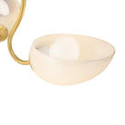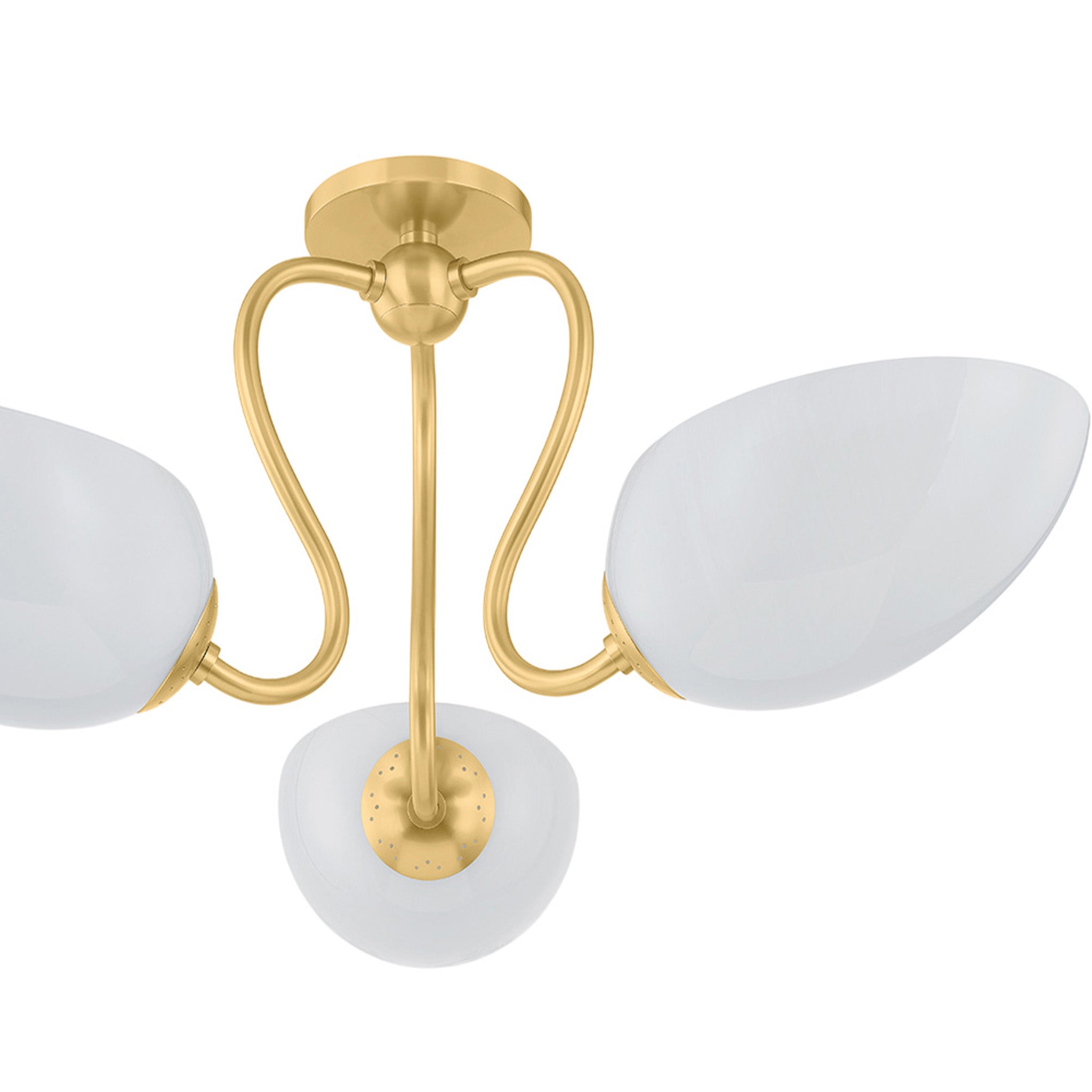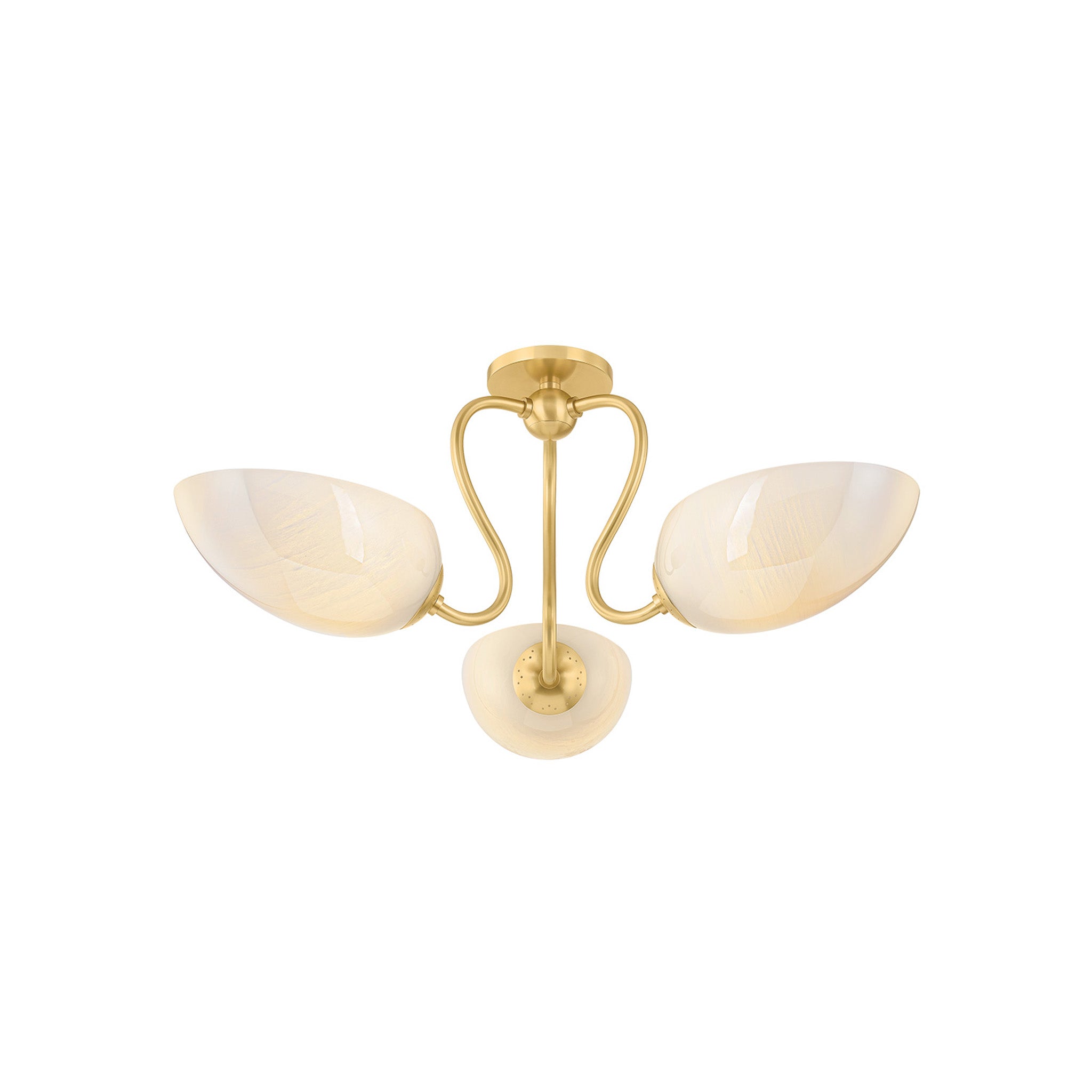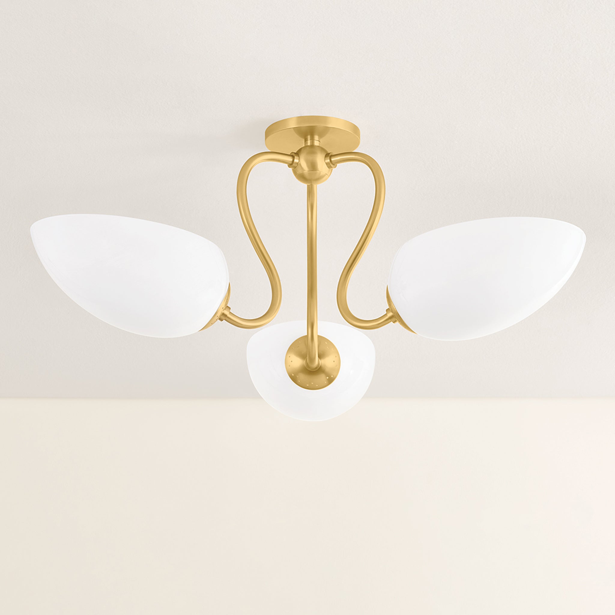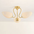 The Reva family leans into a sense of vintage nostalgia. Drawing on a botanical motif, the silhouette's stem-like arms swoop dramatically into an S-curve to support each leaf-shaped uplight. The elongated cloud glass shades feature inner etching, diffusing light softly across a space. In both the semi-flush mount and chandelier, the classical design lines of Reva shine with a warm Aged Brass finish.