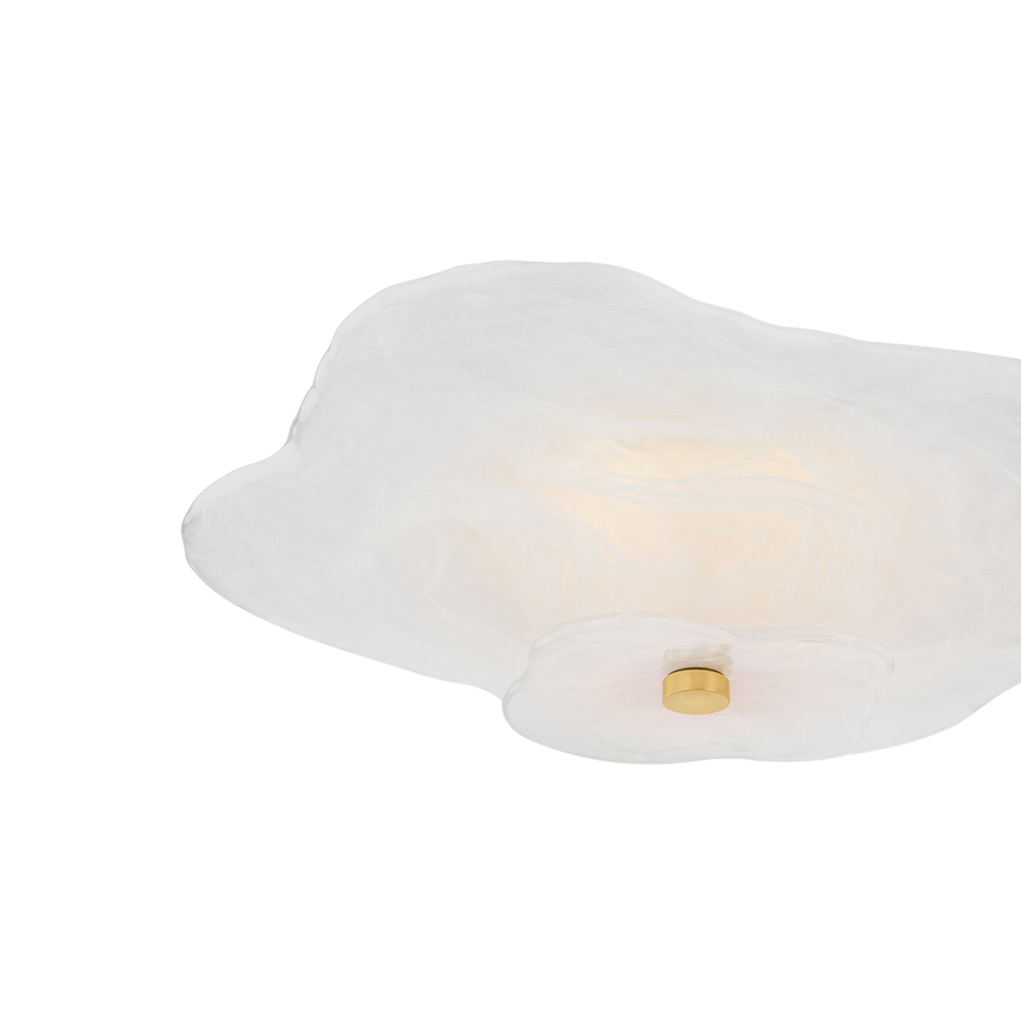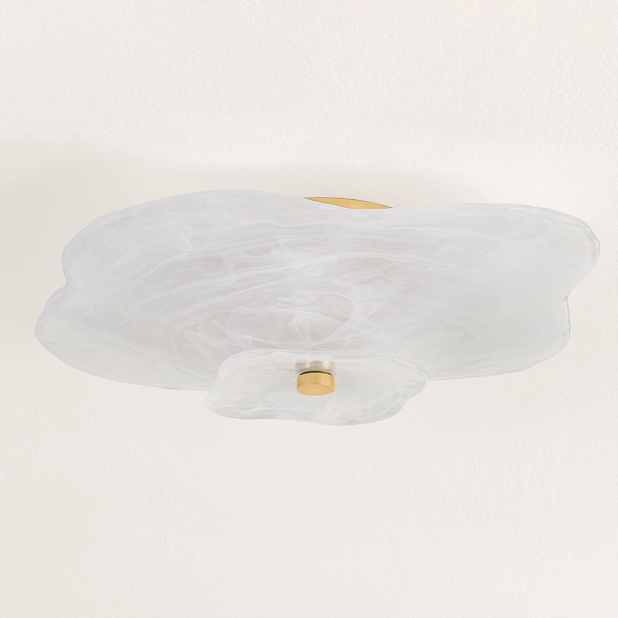 Soft, organic, floral. The petal-like layers of the Starlie flush mount create a stunning cloud-like bloom from below. Made of beautiful swirled Piastra glass, this ethereal fixture diffuses light through its layered curves. An ornamental finial in Aged Brass adds a luxurious accent to the floaty silhouette.
