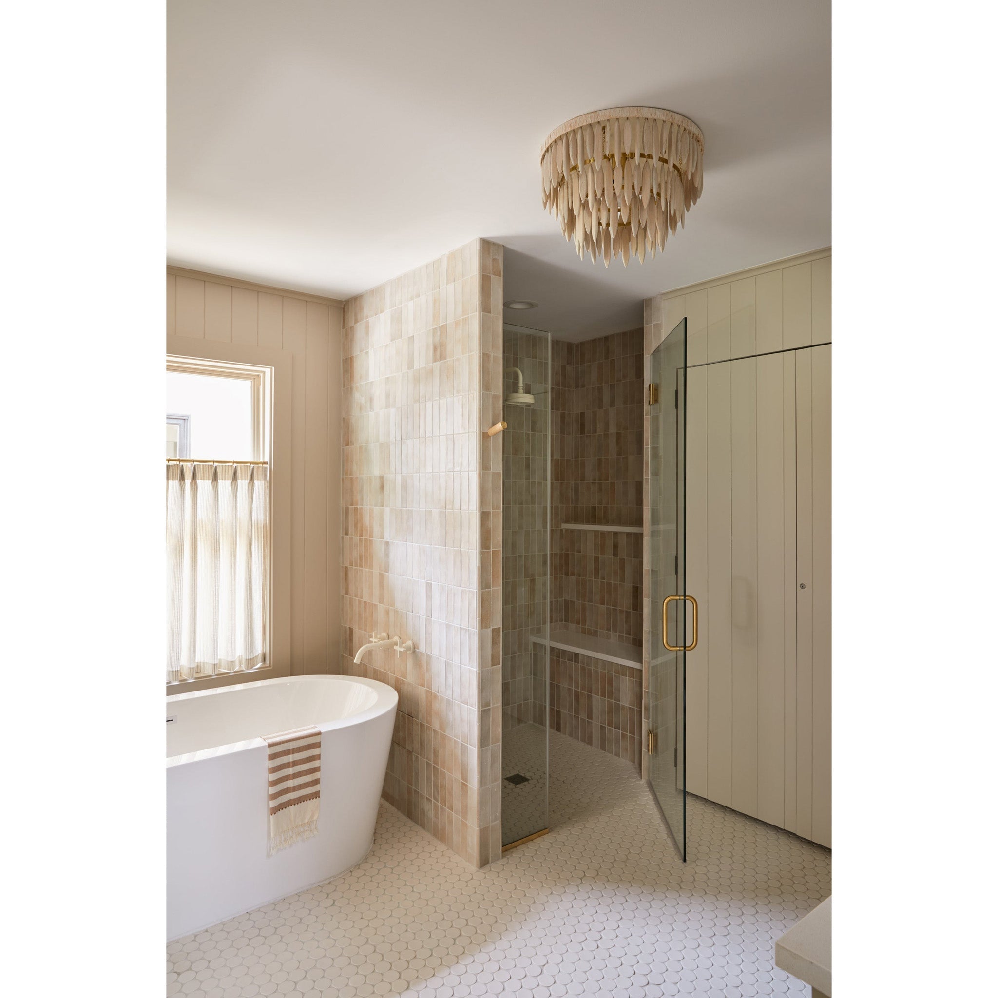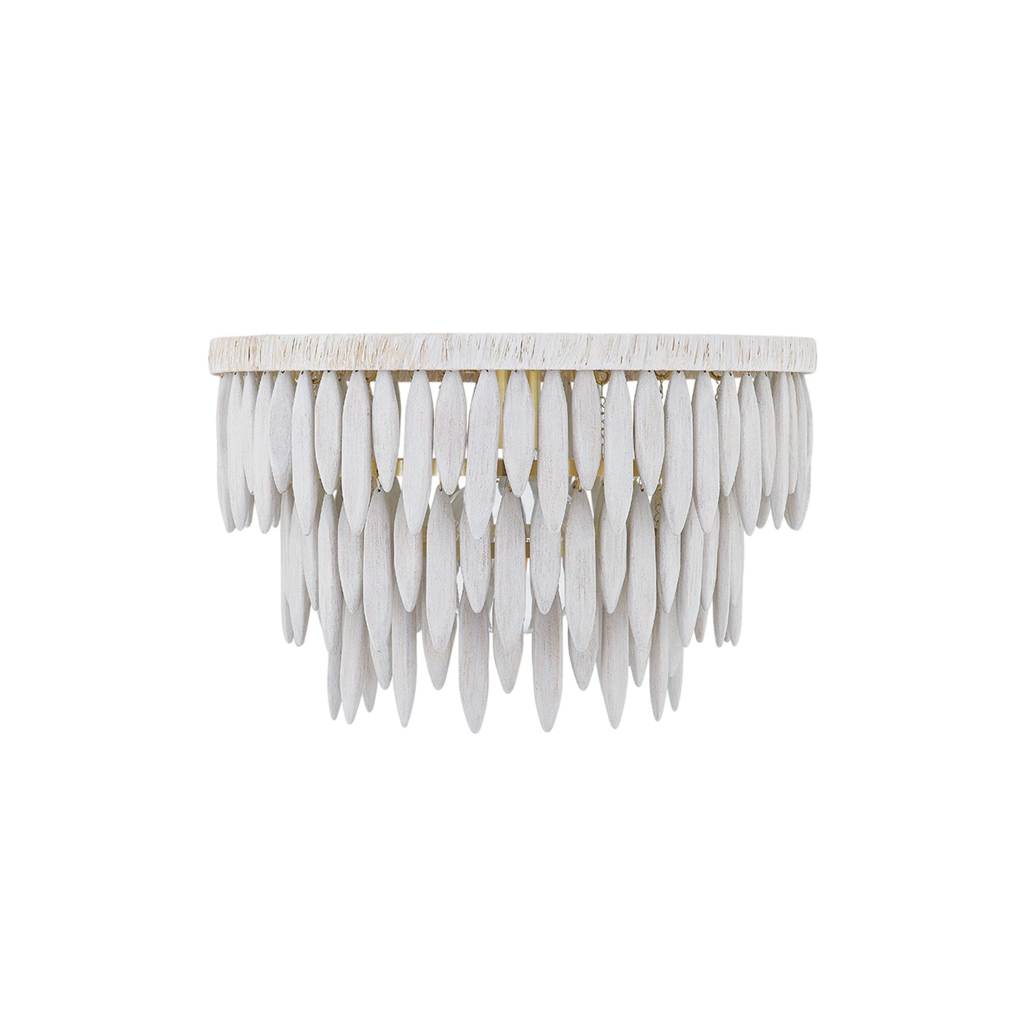 This elevated organic design blends soft natural elements with an elegant, sculptural form. A series of elongated white-washed wood beads are arrayed in tiers around an Aged Brass framework. The top ring of the frame is wrapped in white raffia adding to the clean, fresh feel. The neutral tone makes it the perfect way to add an organic, coastal vibe to a space. Available as a semi-flush, pendant, and chandelier.