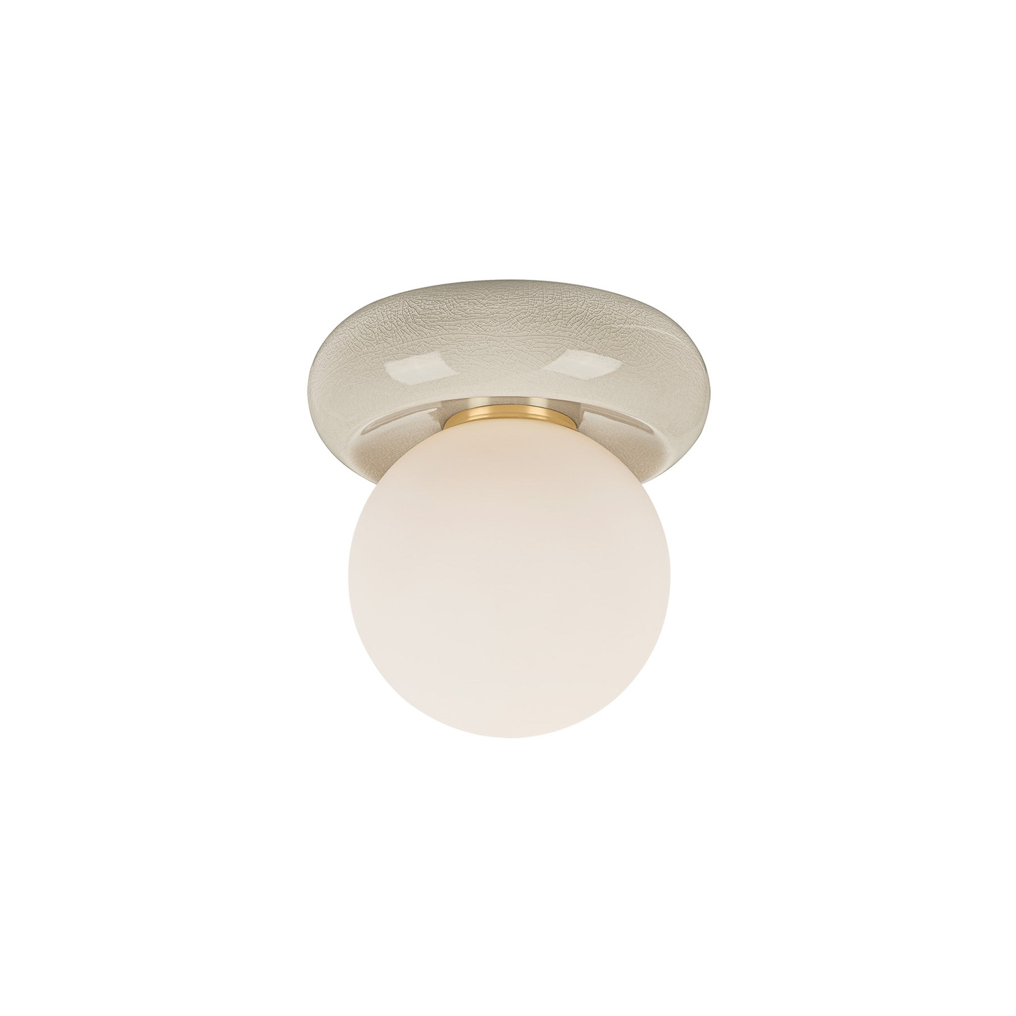 The soft, pillowy form of the Tyra flush mount turns illumination into contemporary sculpture. A spherical matte opal glass shade is paired with a sculptural ceramic cap, glazed in either Ivory Crackle or Frost Crackle. With a compact 8.75-inch diameter, this petite fixture is flexible for many environments. Mount it on the ceiling or wall to serve as either a flush mount or sconce.