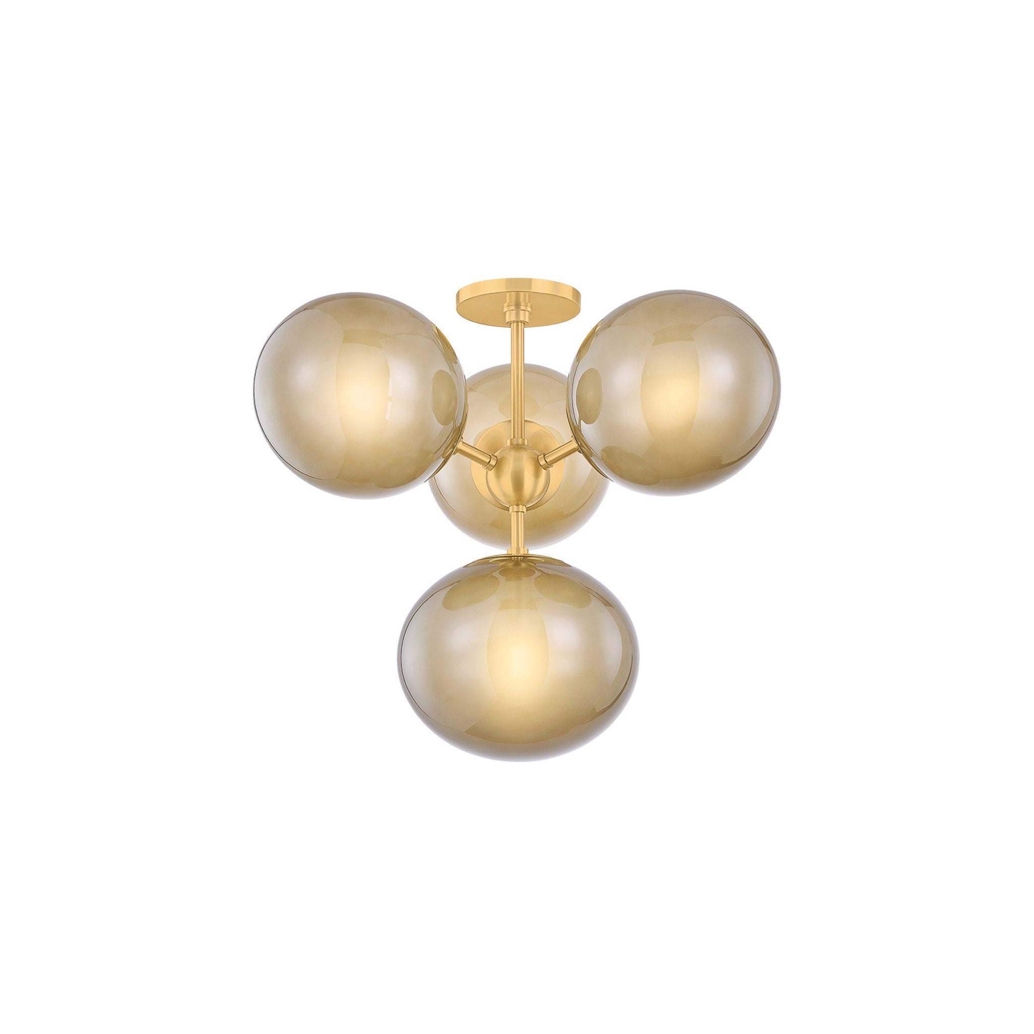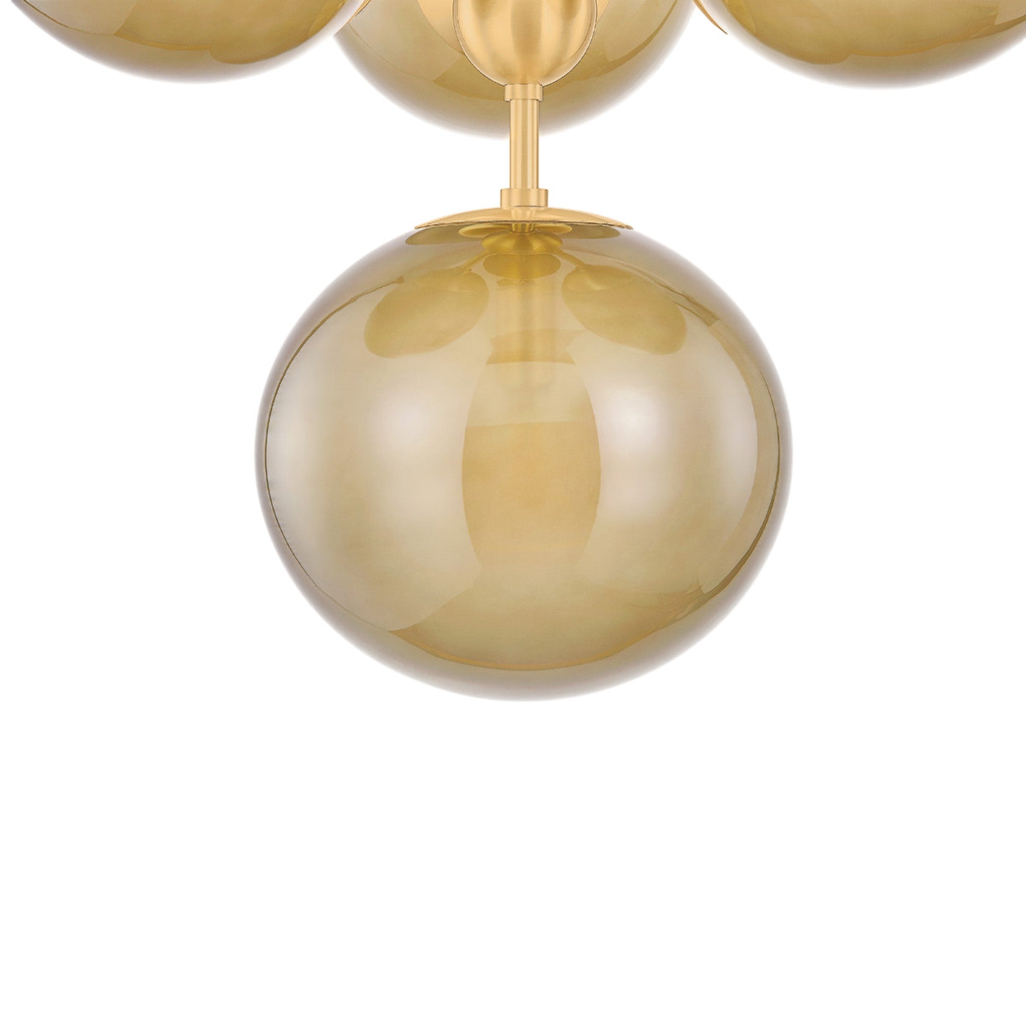 A mid-century modern Sputnik silhouette gets an artful update in the Zaley pendant. Slightly irregular light bronze glass globes radiate from a central sphere finished in Aged Brass. The moody mix of form and tone creates an electric conversation starter. Available with 4 or 7 lights.