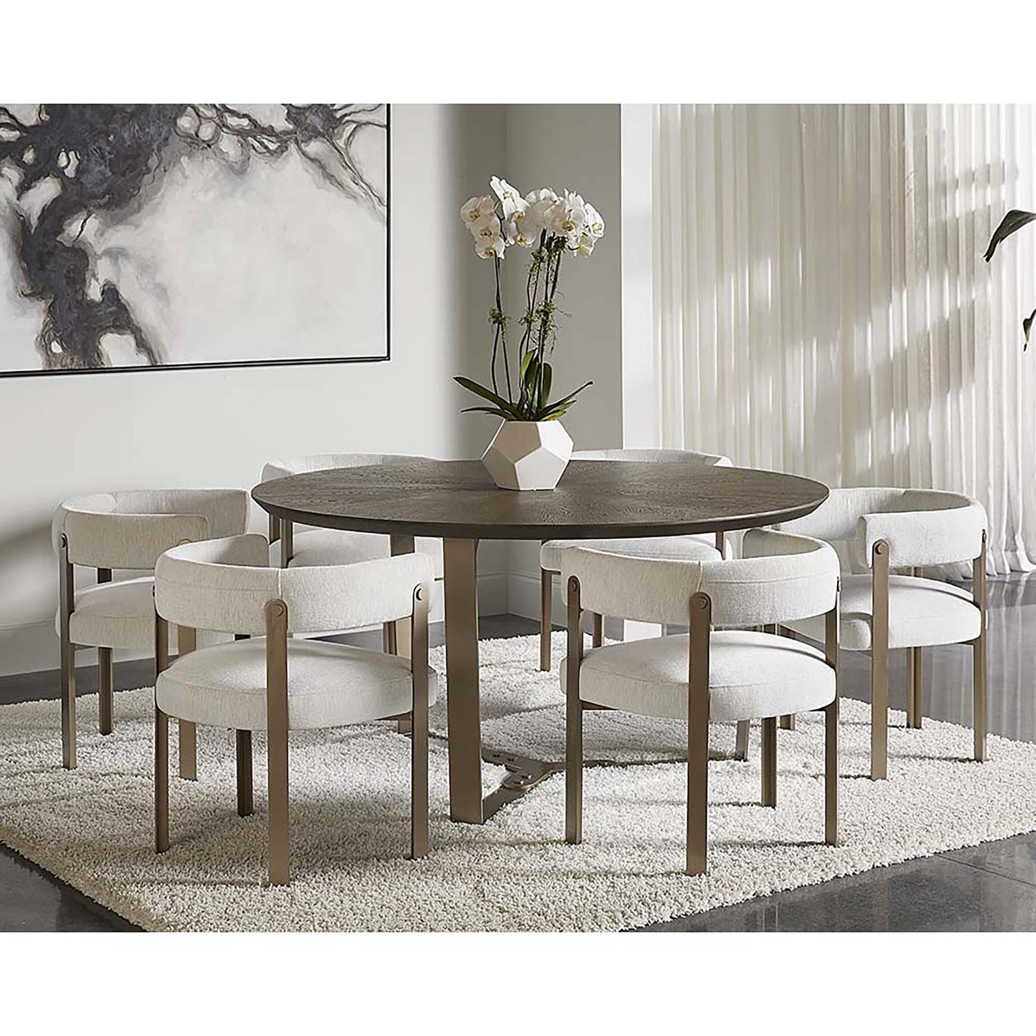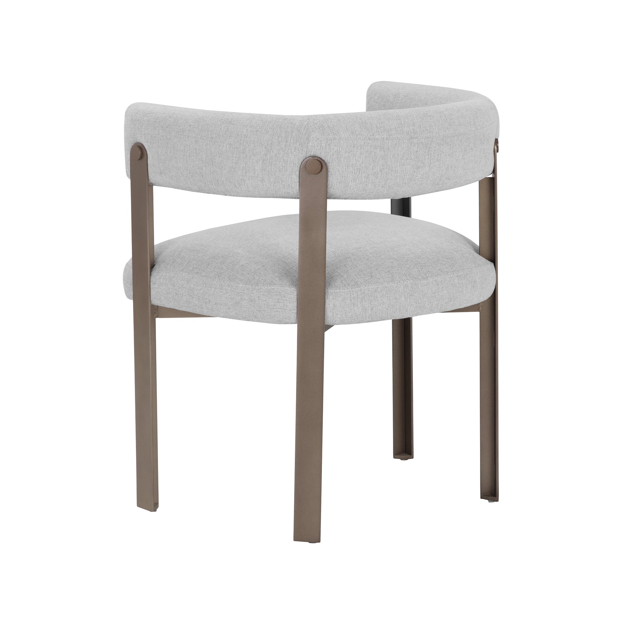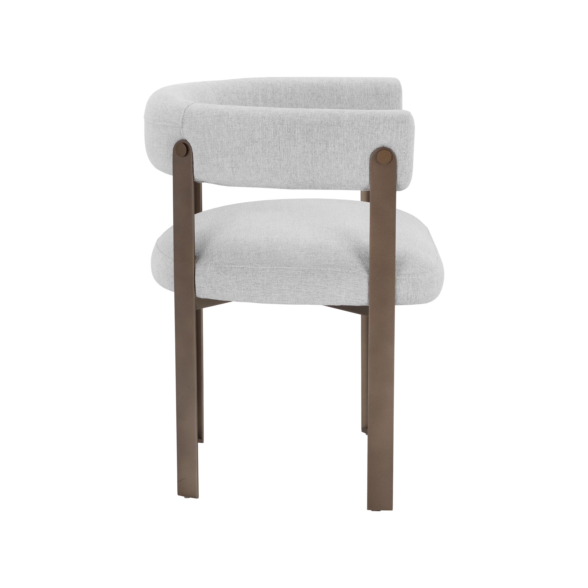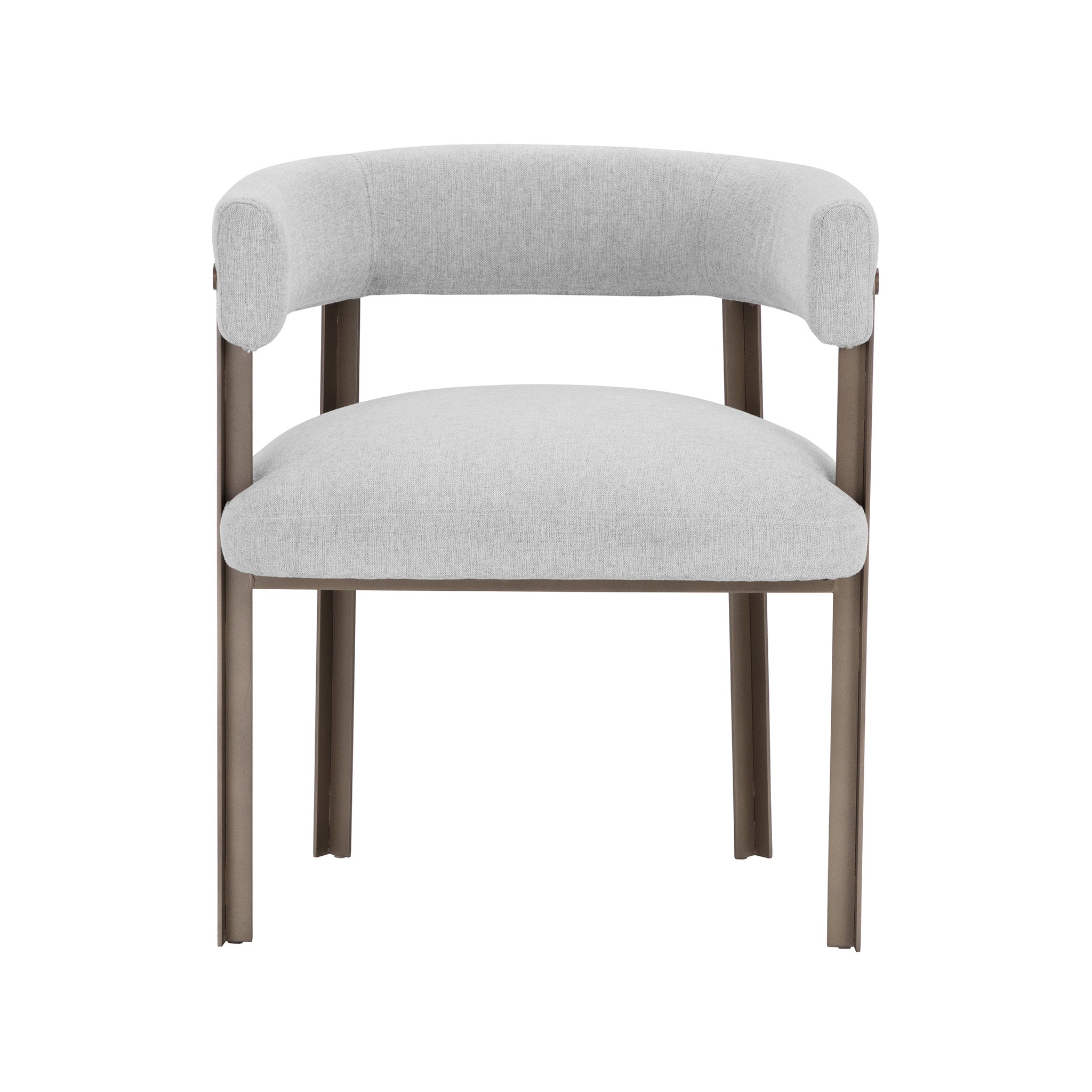 Ce magnifique fauteuil de salle à manger allie style et élégance. Il présente une assise contemporaine à dossier arrondi revêtue de tissu Ernst Silverstone et un piètement en acier thermolaqué finition dorée.