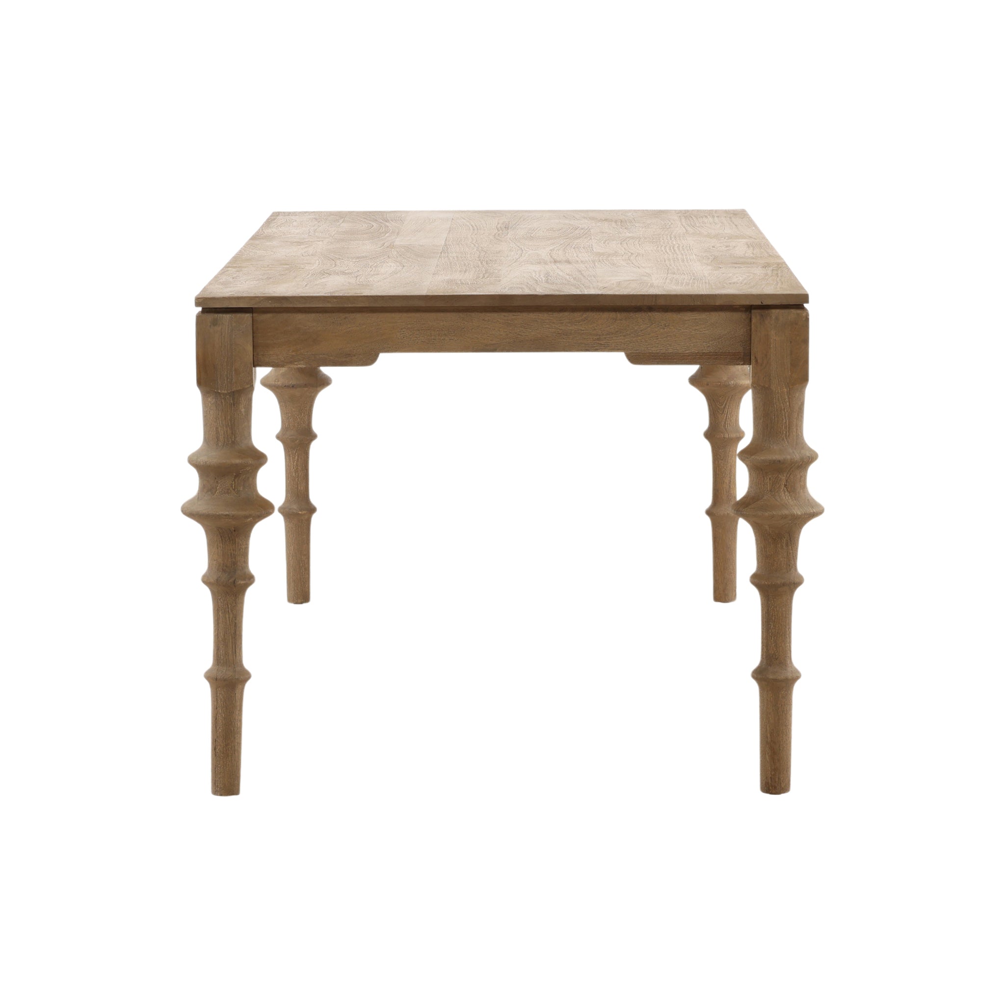 Cette charmante table à manger apporte une touche d'élégance rustique à votre intérieur. Son plateau rectangulaire et sobre repose avec élégance sur six pieds tournés originaux, évoquant des bobines, ce qui lui confère un caractère artisanal unique. Fabriquée en bois massif avec une finition naturelle claire, cette pièce met en valeur la beauté de son grain apparent et offre un espace convivial et chaleureux pour recevoir famille et amis.