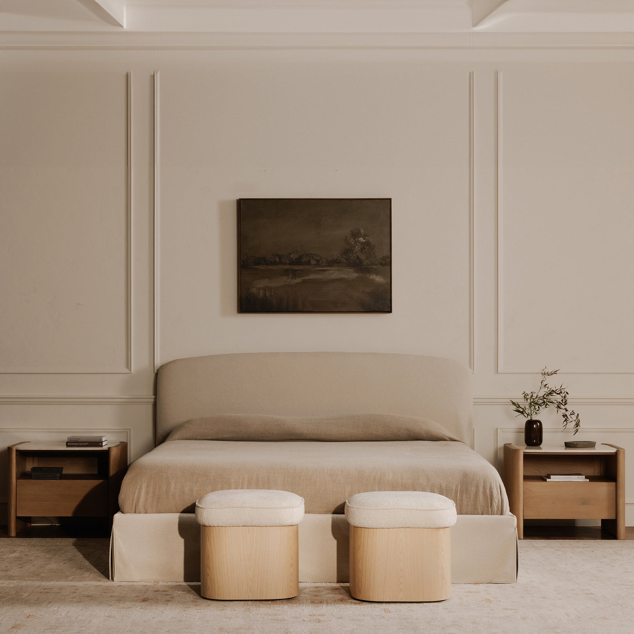 Le tabouret Senna incarne avec élégance le luxe de la simplicité grâce à son piètement en placage et son plateau relevable qui dévoile un espace de rangement discret. Recouverte d'un tissu avoine moucheté, son assise moelleuse contraste avec la solidité du bois et les passepoils qui dessinent ses contours. Les angles arrondis adoucissent la silhouette du tabouret, créant une pièce à la fois sereine et fonctionnelle.