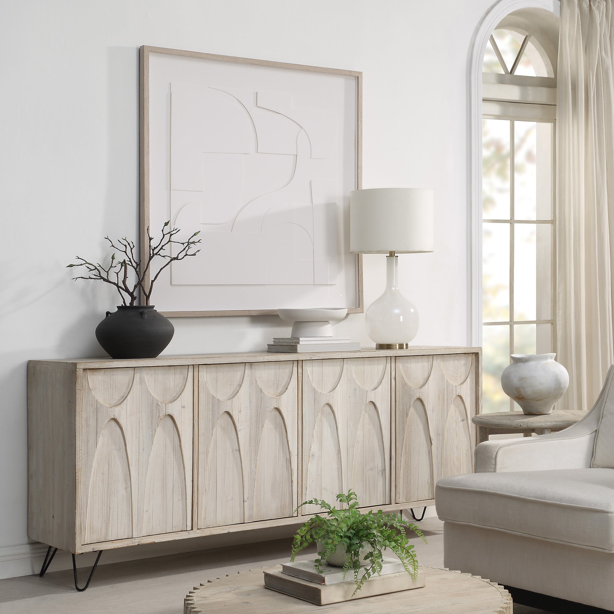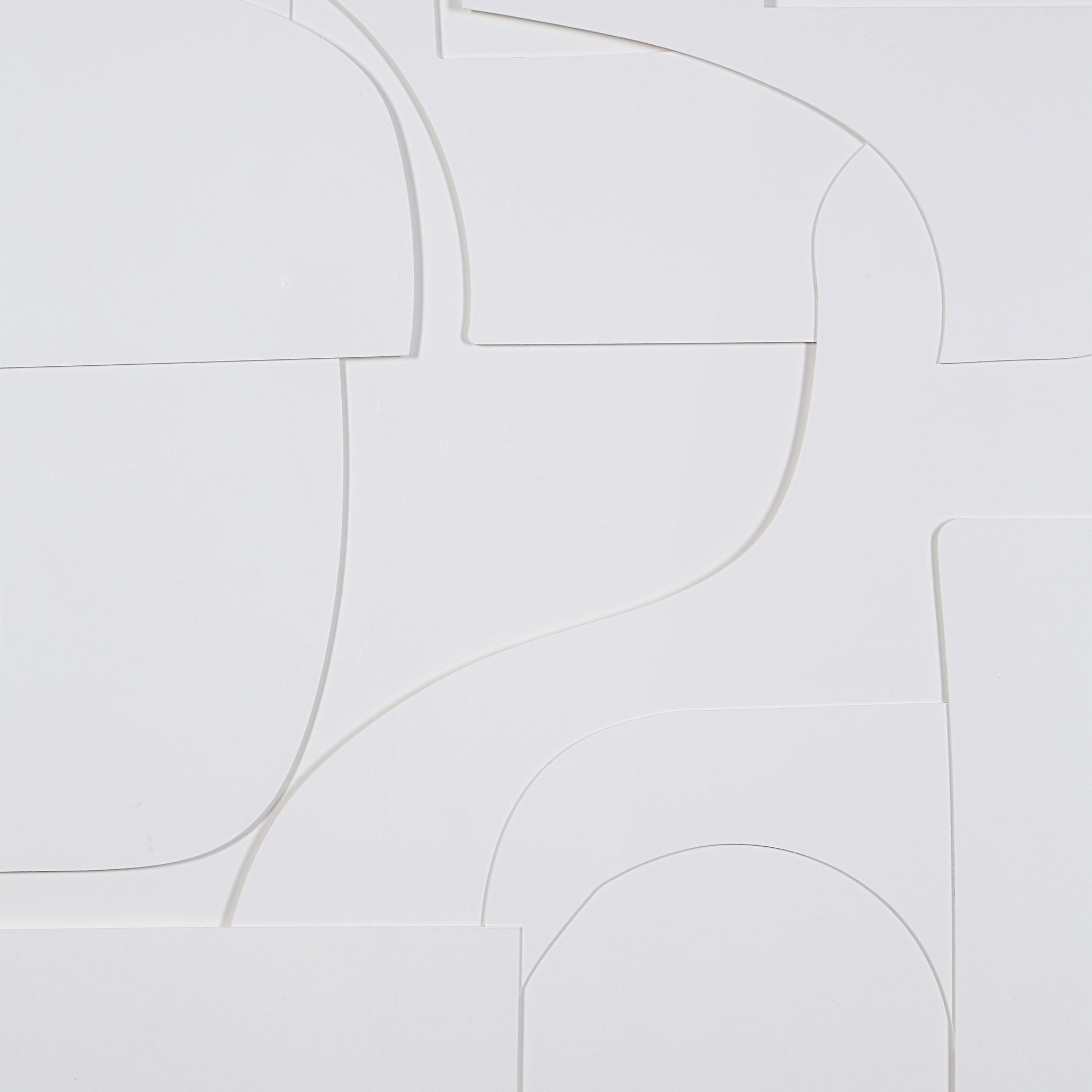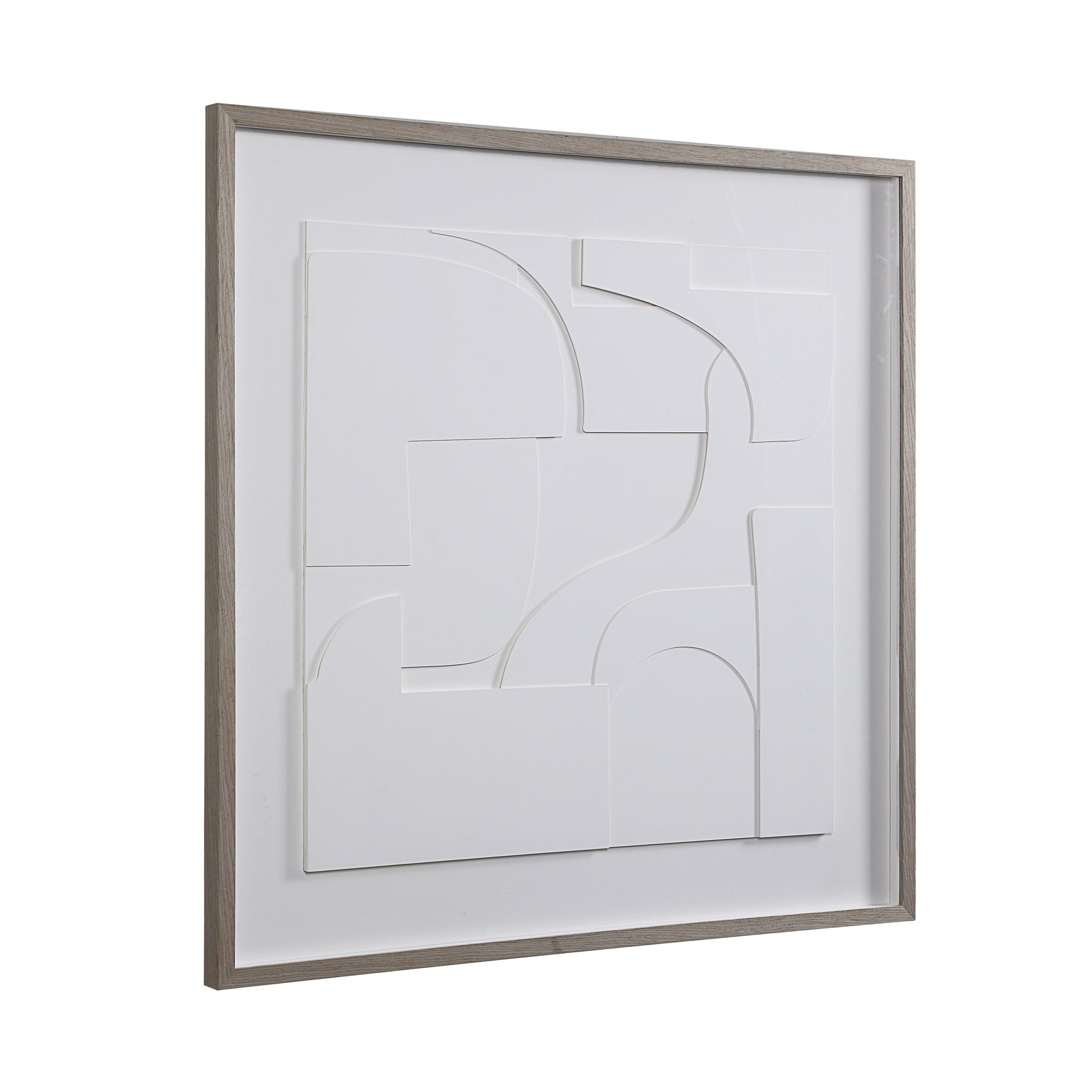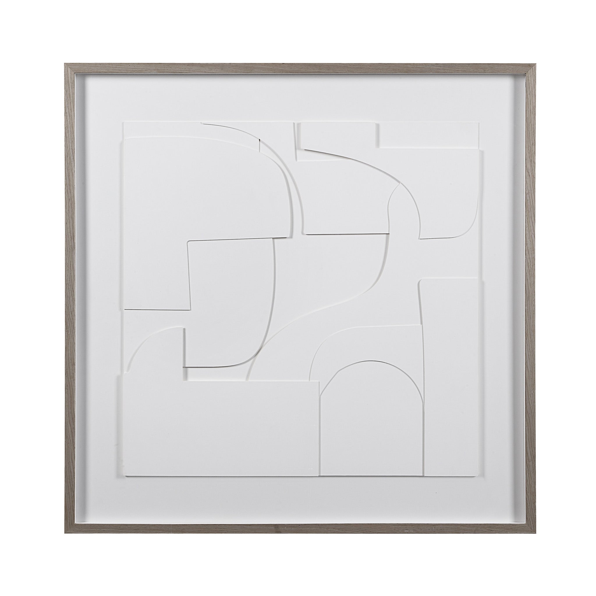 Apportant modernité et originalité à tout espace, cette œuvre d'art unique est un choix idéal pour une maison ou un bureau avant-gardiste. Des superpositions de formes géométriques à la finition blanc mat sont encadrées d'un placage de bois crème, créant ainsi une œuvre d'art moderne incroyablement attrayante. Accrochez-la au-dessus d'une cheminée, d'un buffet ou d'une console pour une touche d'élégance intemporelle dans n'importe quel intérieur.