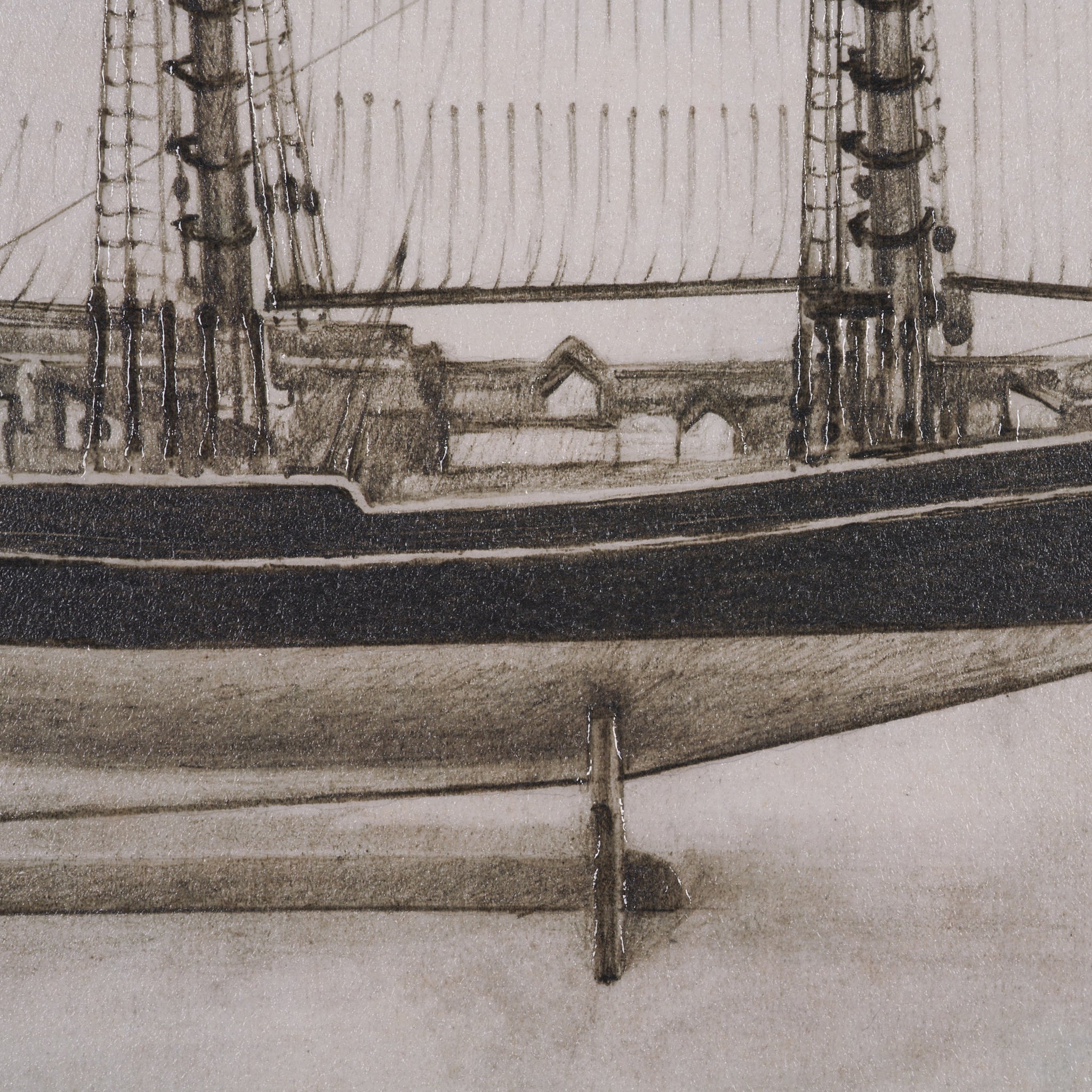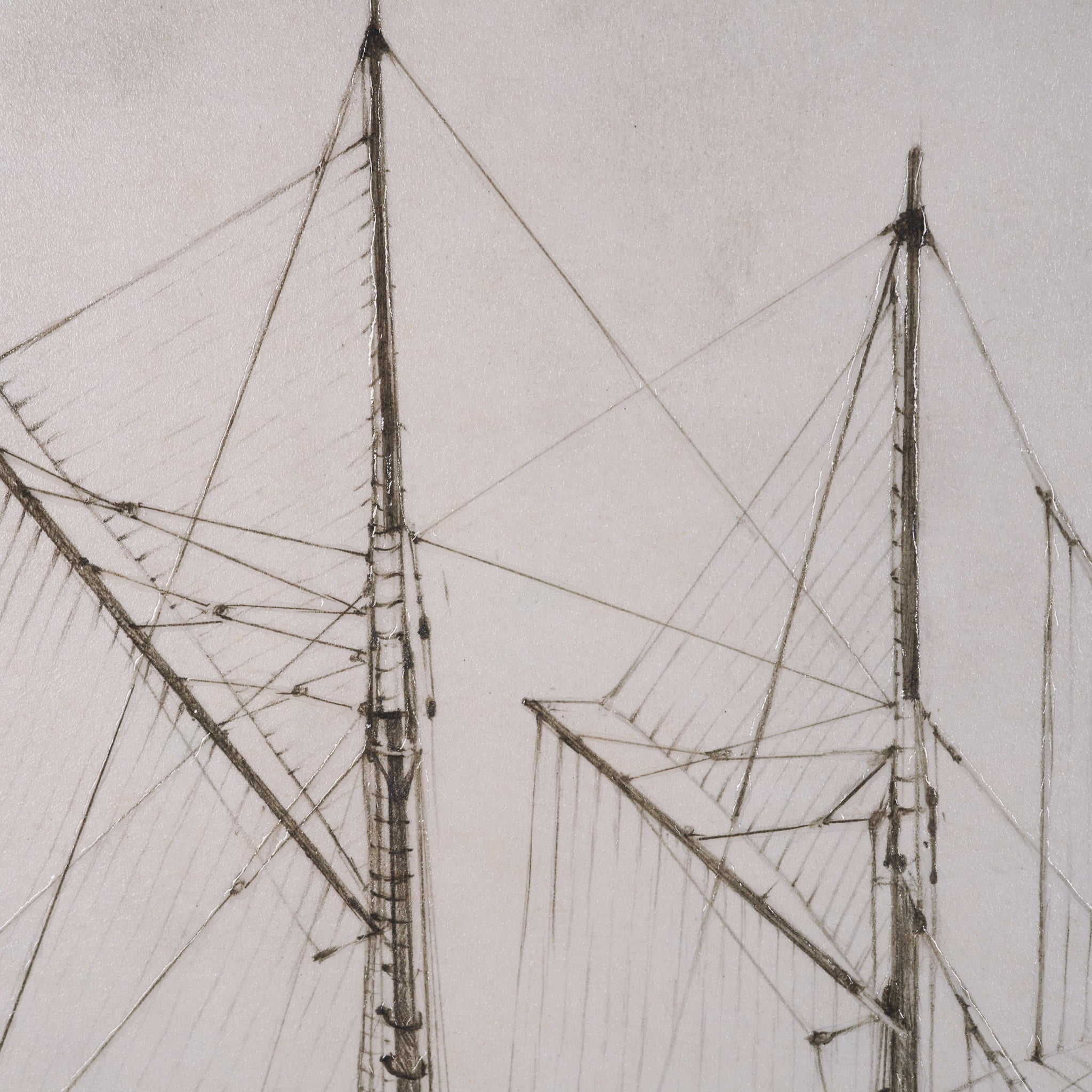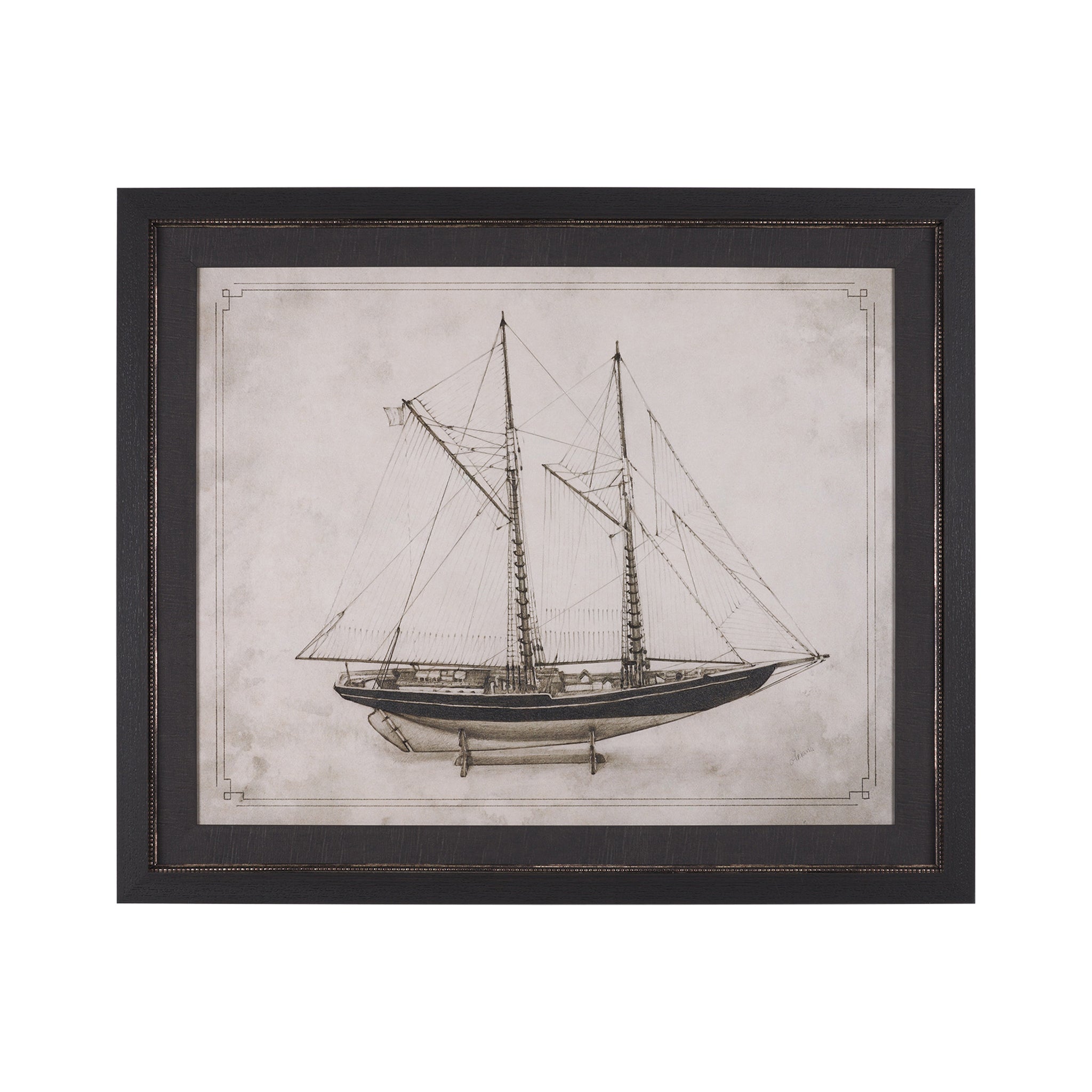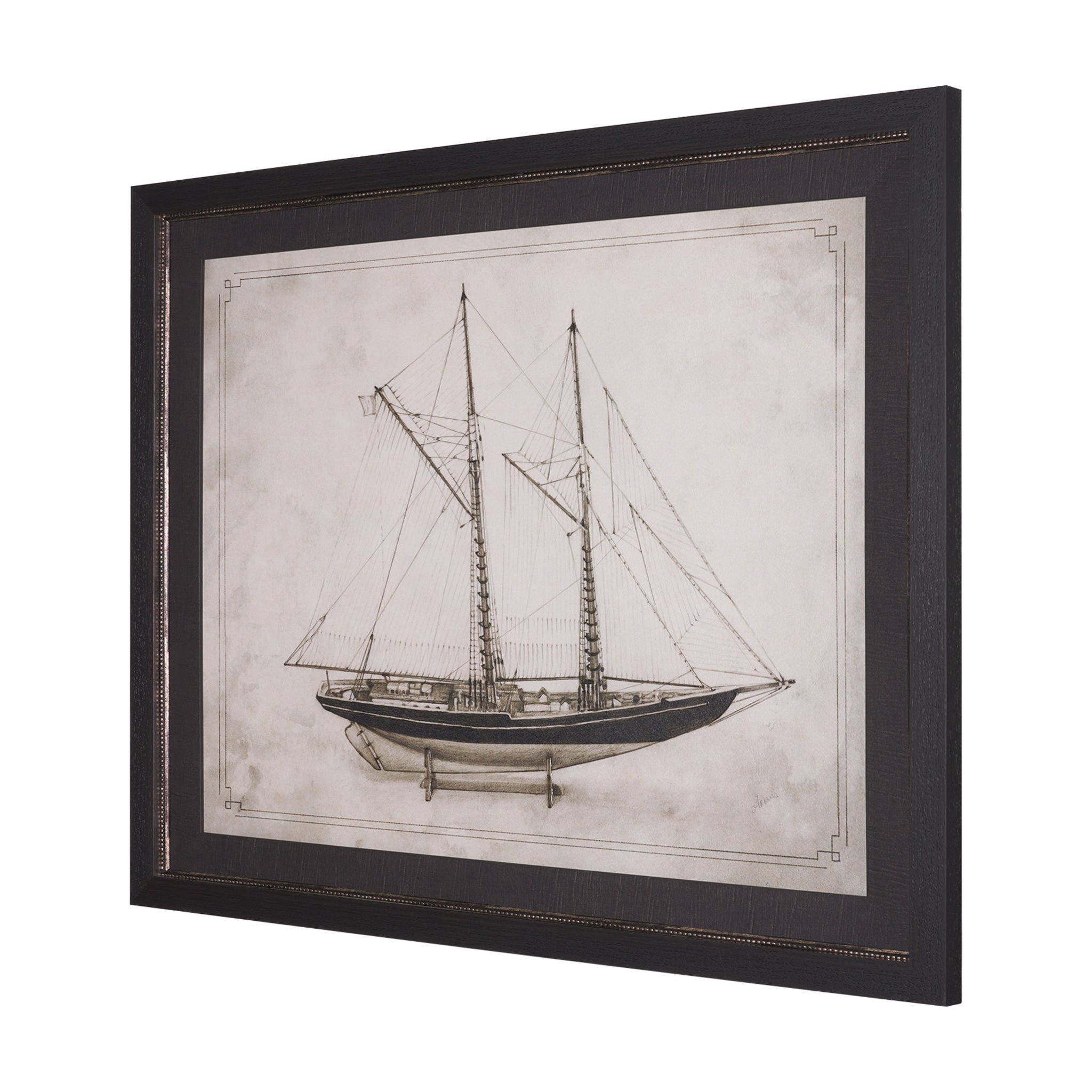 Embarquez pour un voyage à travers l'histoire maritime avec cette œuvre encadrée aux détails minutieux. Une goélette classique à deux mâts est représentée dans un croquis captivant, façon plan d'architecte, sur un fond de papier vieilli orné d'élégantes bordures décoratives. Encadrée dans un cadre sombre et riche, cette pièce est idéale pour les passionnés de navigation ou pour quiconque souhaite ajouter une touche d'aventure raffinée et de charme intemporel à son bureau, son salon ou sa salle de séjour.