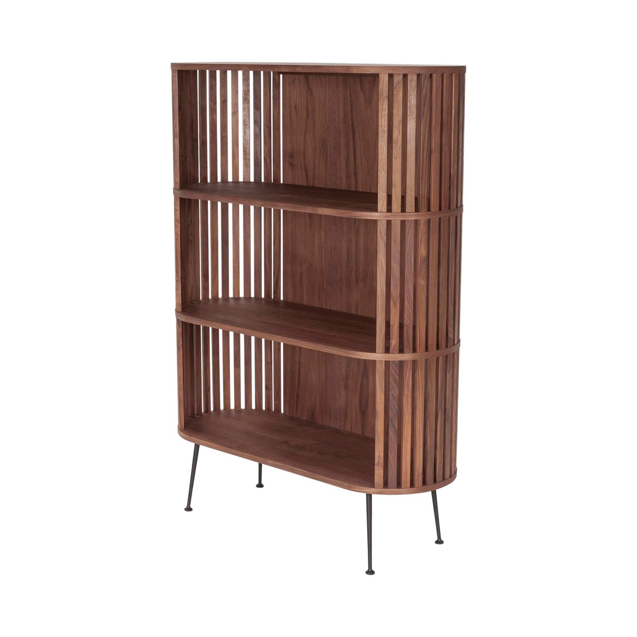 Idéale pour vos livres et objets de collection, cette étagère en noyer massif richement plaqué est dotée de tablettes plus profondes. Son style moderne du milieu du siècle se distingue par sa forme légèrement arrondie et ses panneaux latéraux et arrière ornés de grilles, ainsi que par ses pieds en acier légèrement évasés. Pratiquement parfaite, cette bibliothèque est un modèle polyvalent qui s'adapte à toutes les pièces.