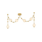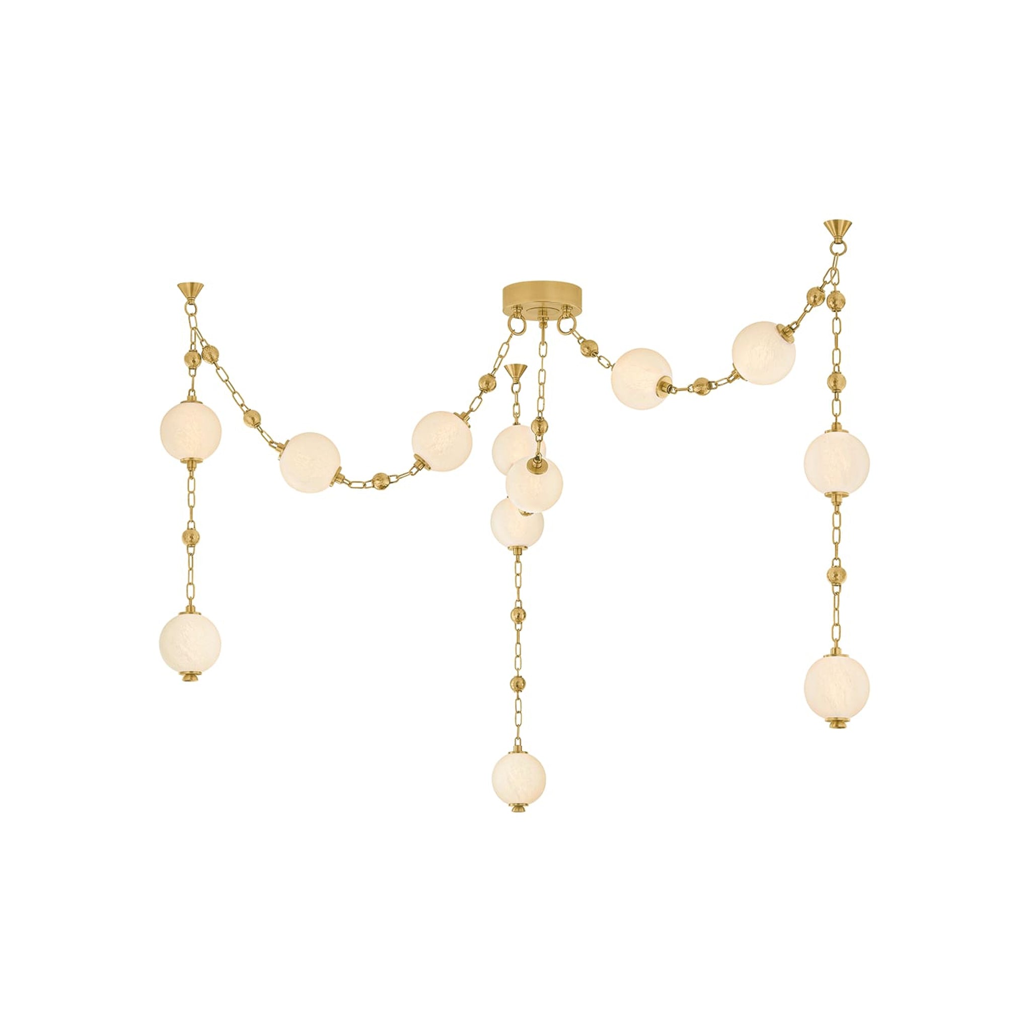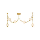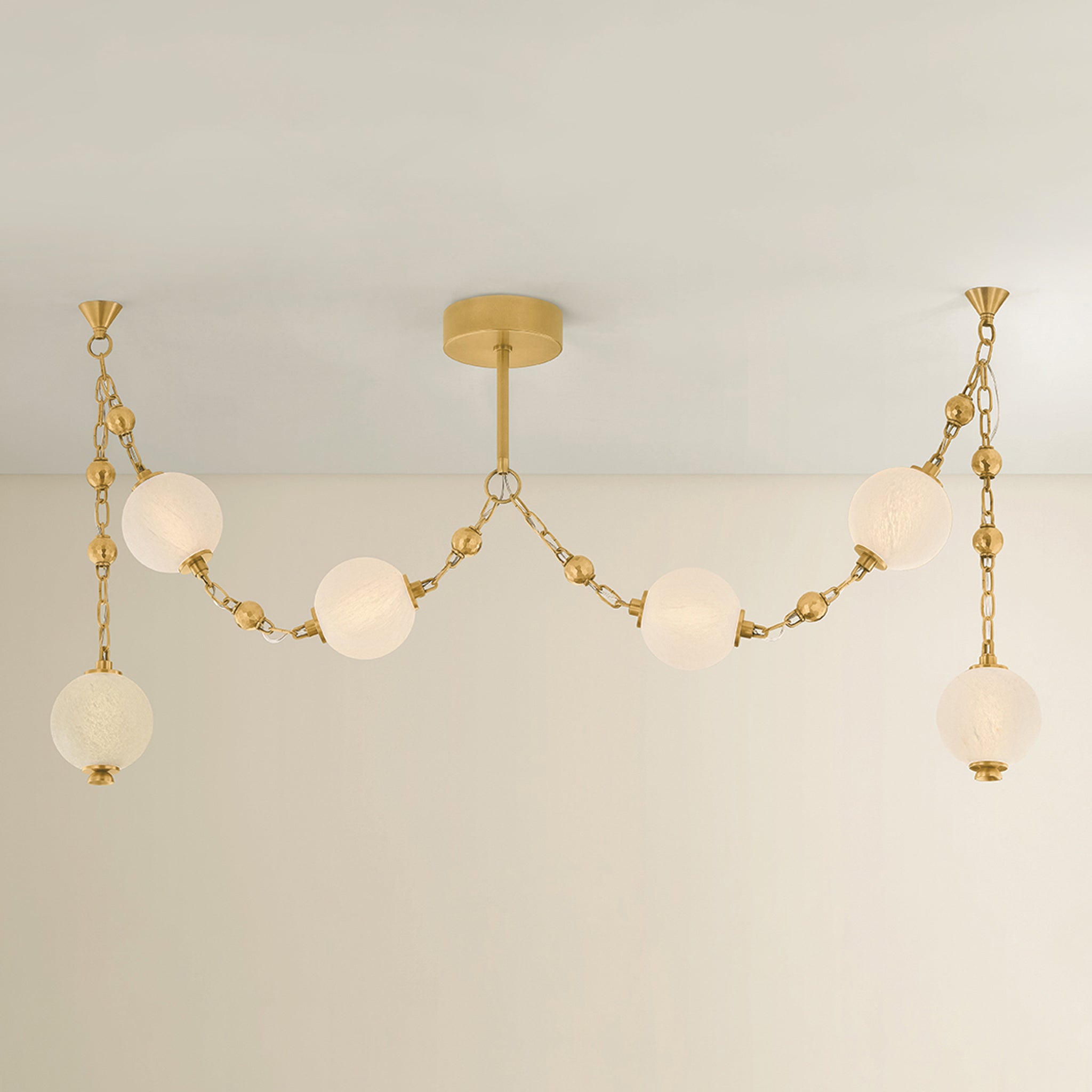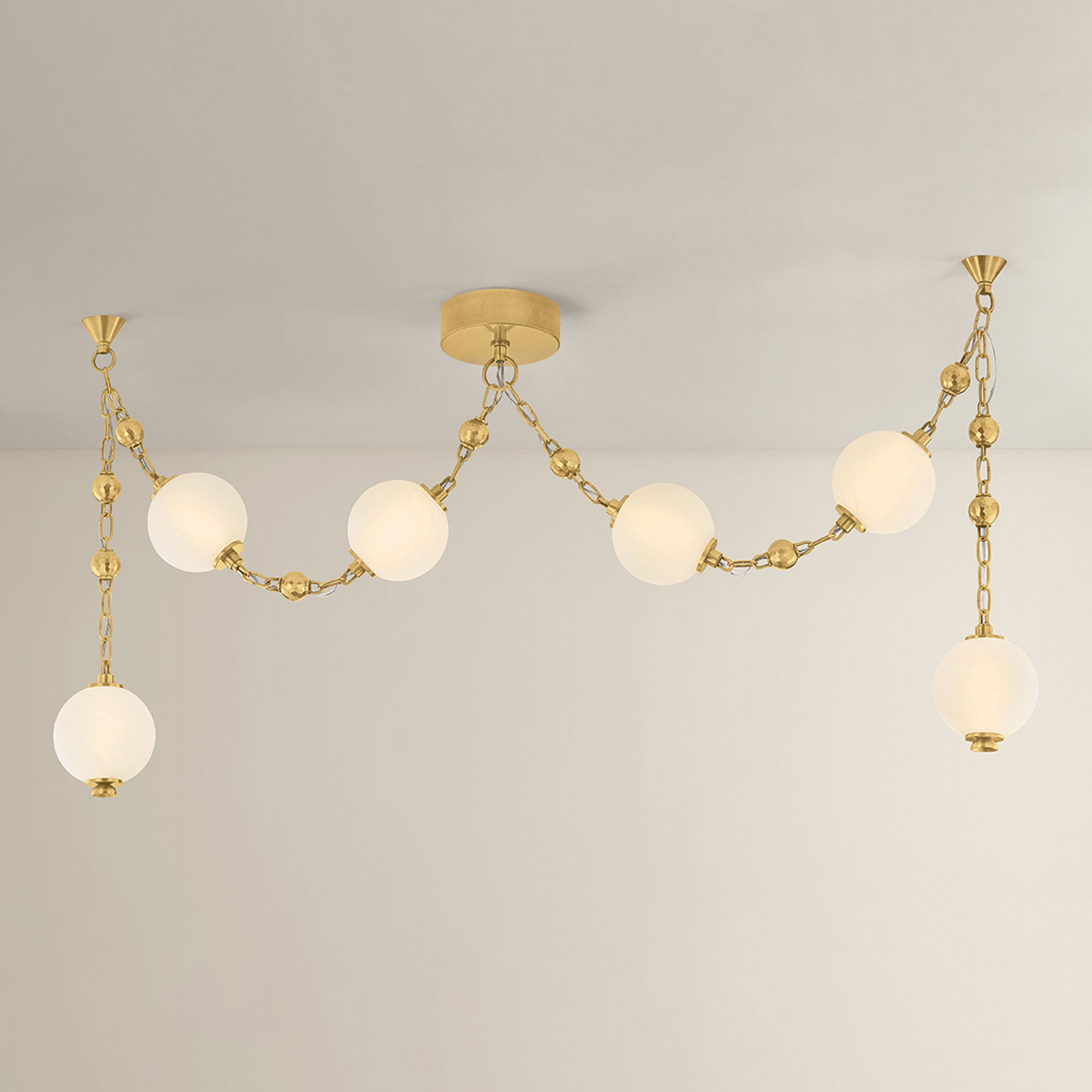 Corda puise son inspiration dans l'élégance des bijoux anciens, où la lumière devient ornement et la structure raconte une histoire. Des sphères en verre nuage mat soufflé à la main sont suspendues à des chaînes en laiton vieilli brillant, rehaussées de délicats détails de chaînettes à billes, évoquant la richesse des colliers de perles et de breloques superposés. Disponible en applique à 2 lumières, en luminaire linéaire à 6 lumières et en lustre spectaculaire à 12 lumières, le système de suspension à plusieurs niveaux de Corda permet des options d'installation personnalisables, introduisant une sensation de mouvement et de personnalisation inattendue. Il apporte une touche d'intimité et d'élégance à un espace, diffusant une lueur chaleureuse et glamour, à la fois délicate et intentionnelle. Moniomi pour Corbett Lighting.