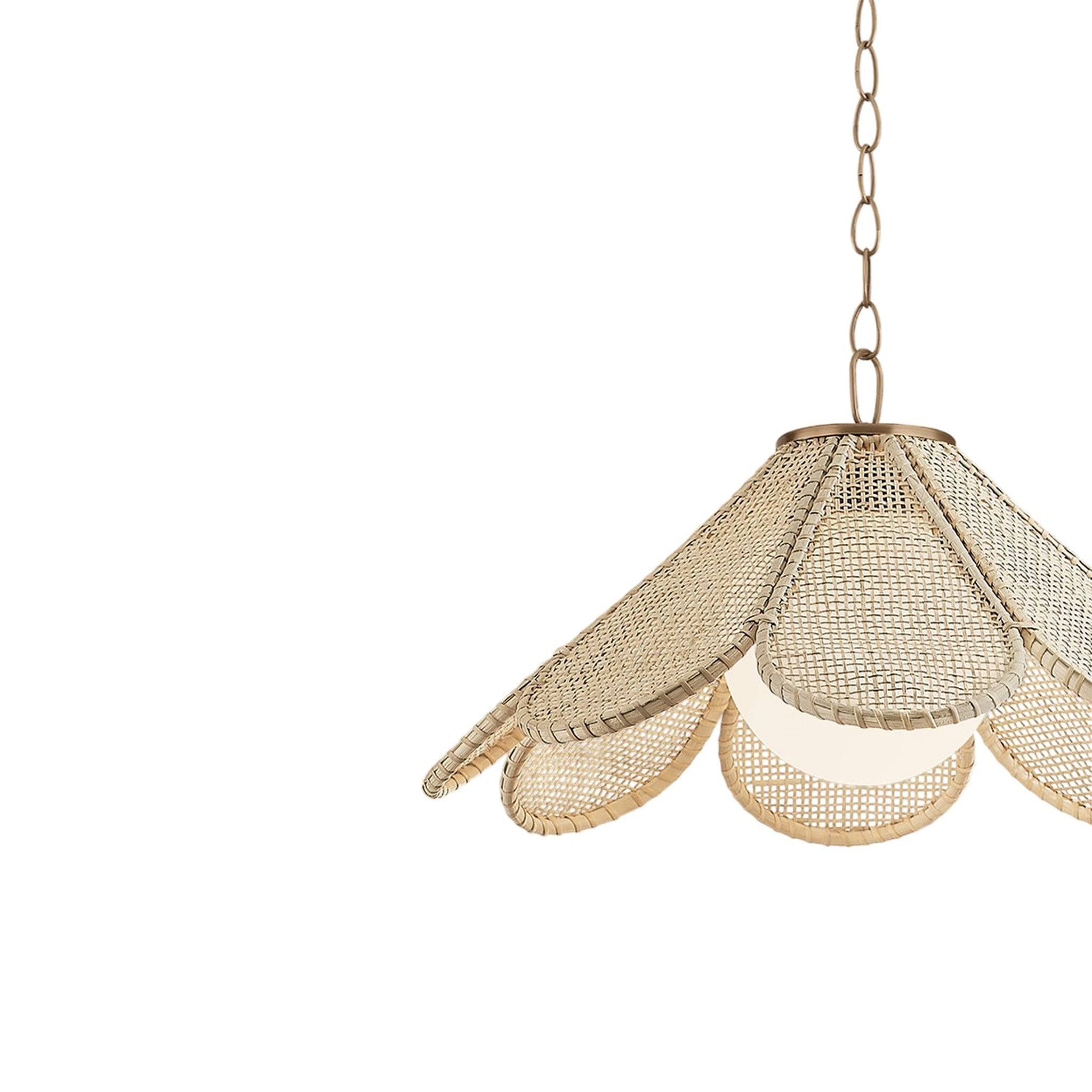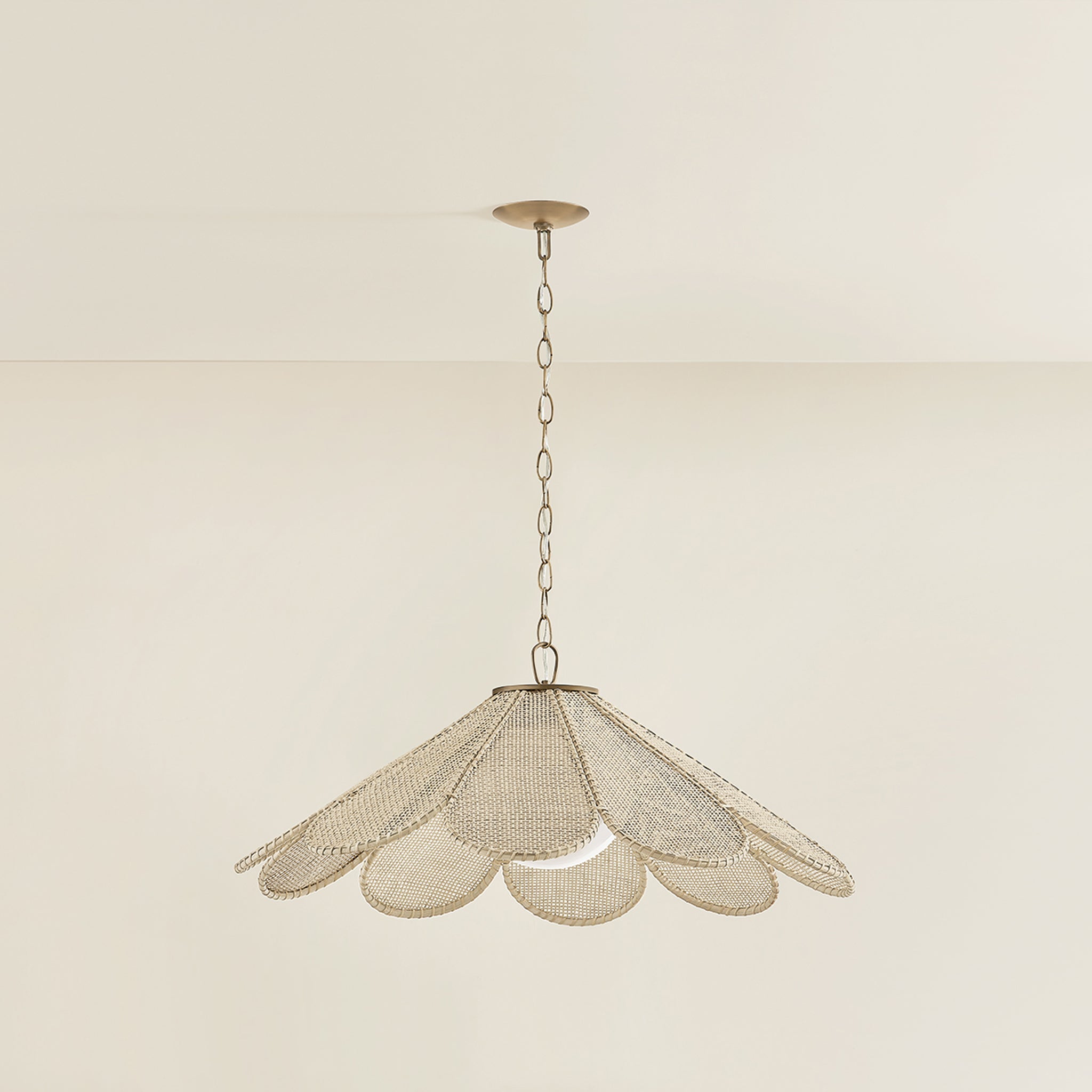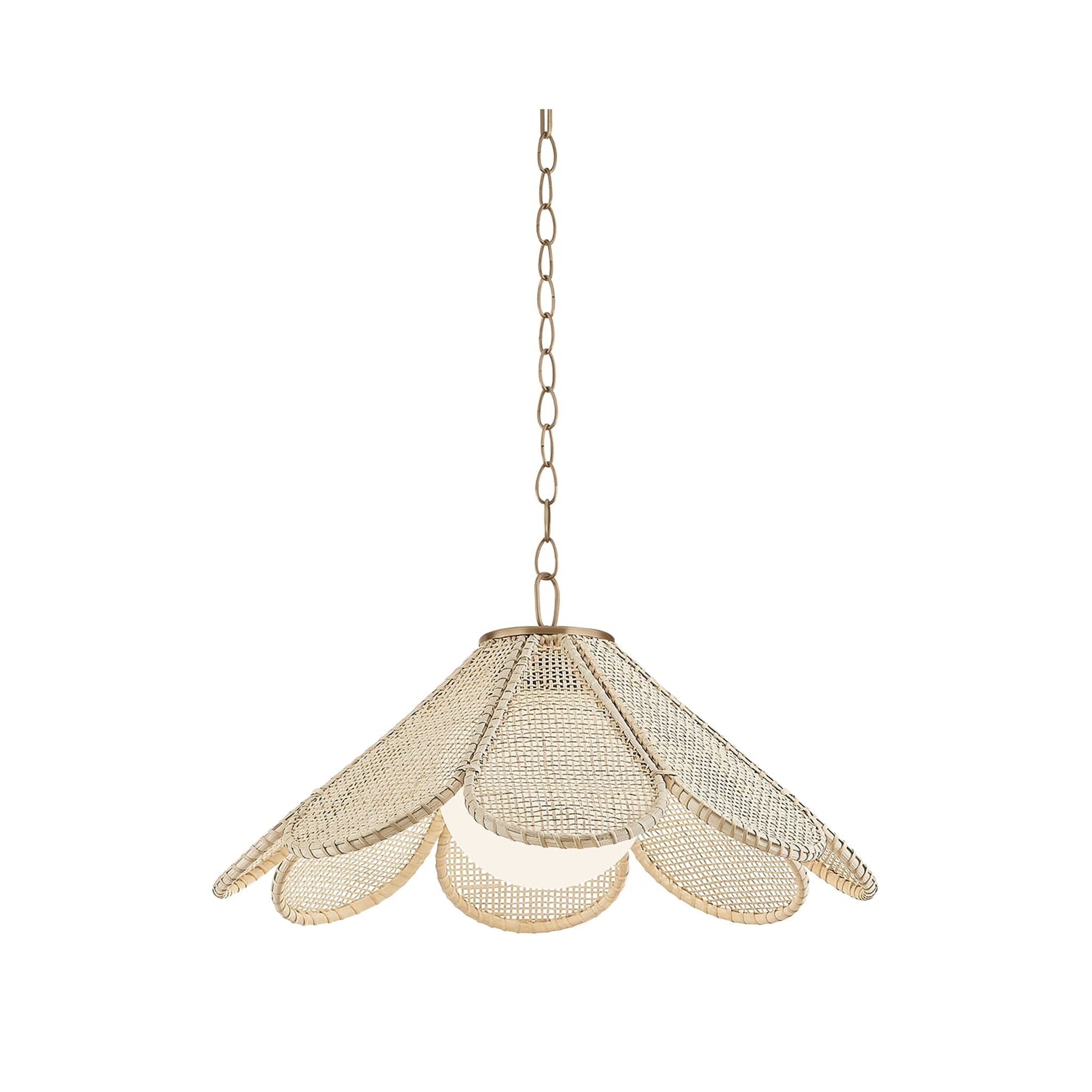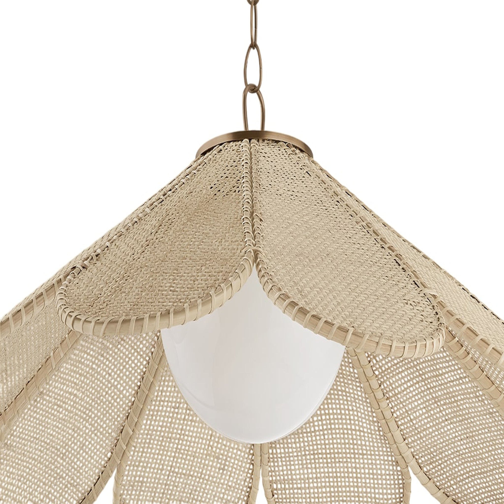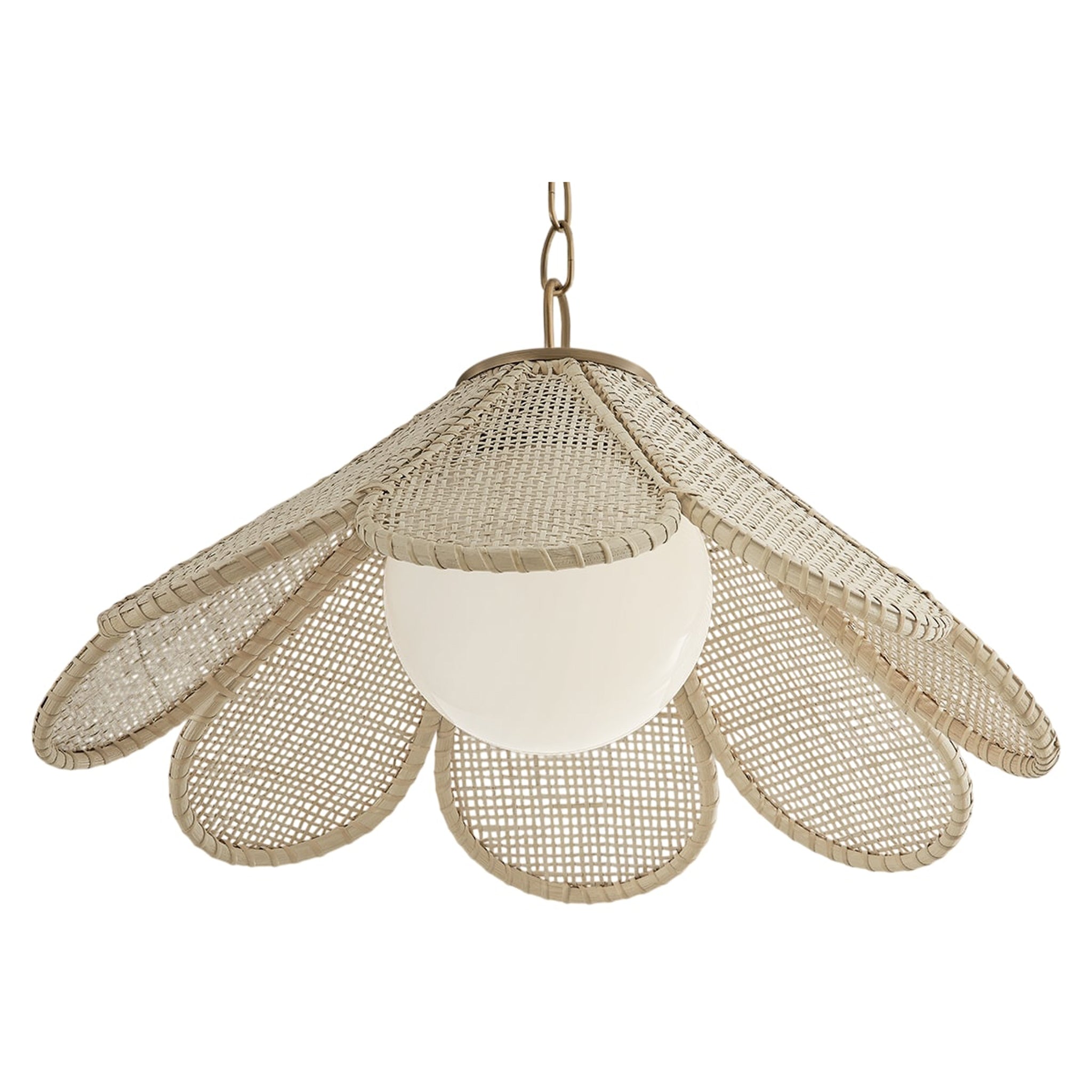 Inspirée par la beauté discrète de la nature, la suspension Petal présente des cannes de rotin tressées à la main, façonnées en délicats pétales qui entourent un globe en verre opale brillant. Sa silhouette organique, à la fois rustique et raffinée, est suspendue par une boucle et une chaîne en laiton patiné (PBR). Disponible en deux tailles, elle apportera une touche de charme au-dessus d'un îlot de cuisine ou d'un coin repas. Création de Lauren Liess pour Troy Lighting.