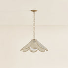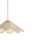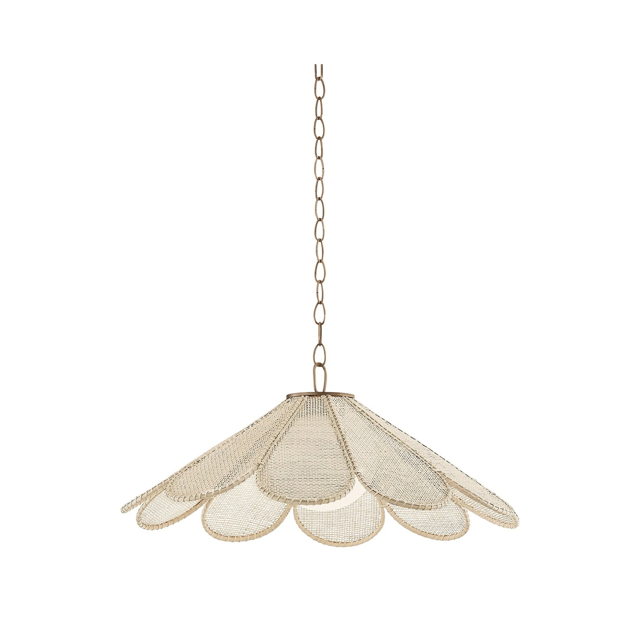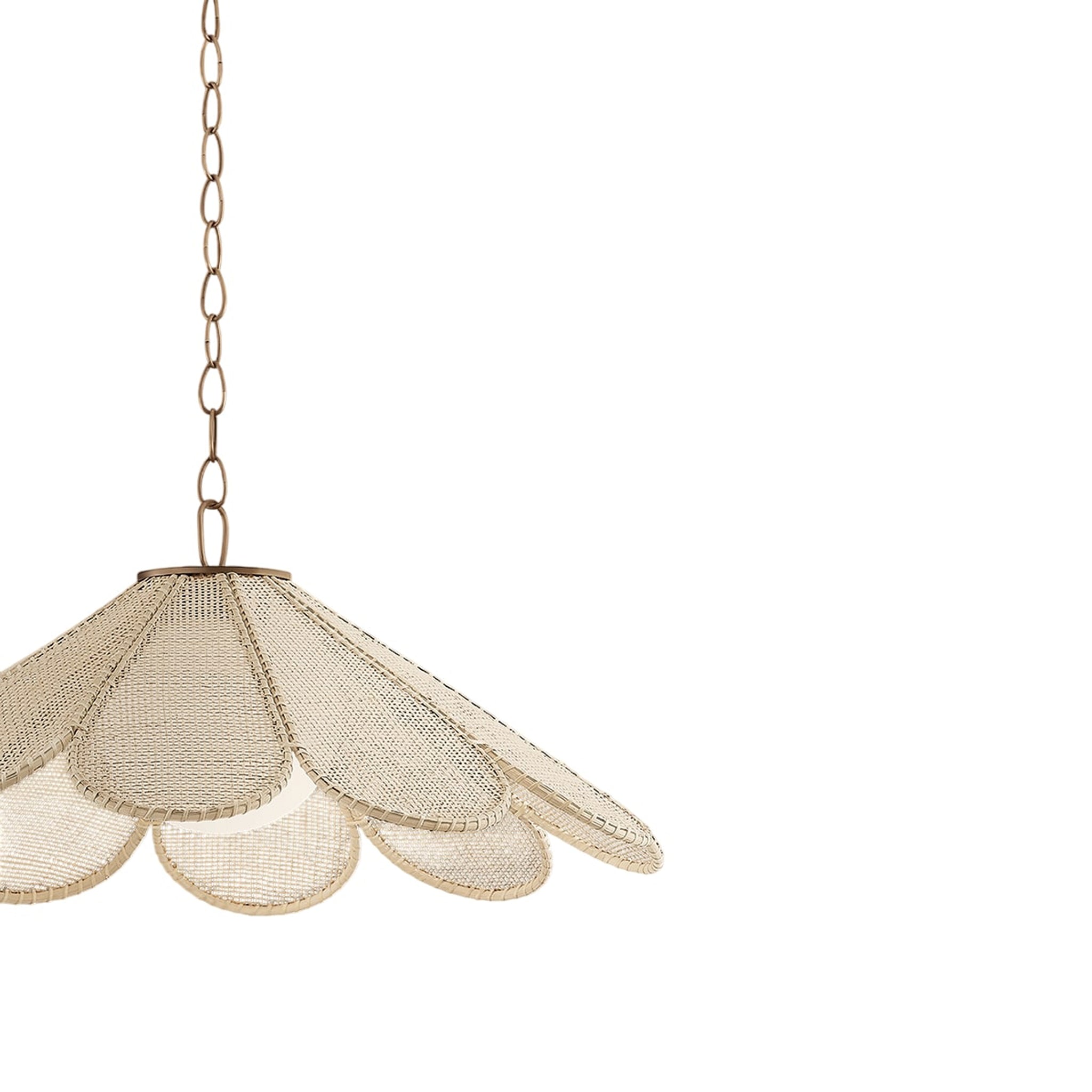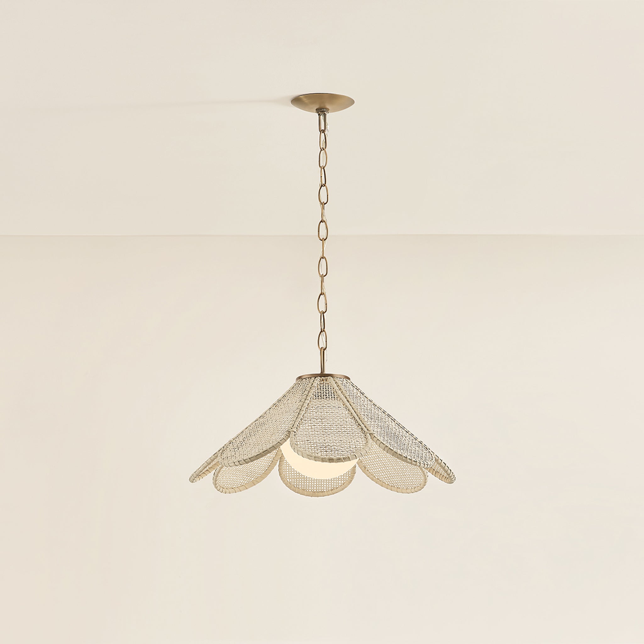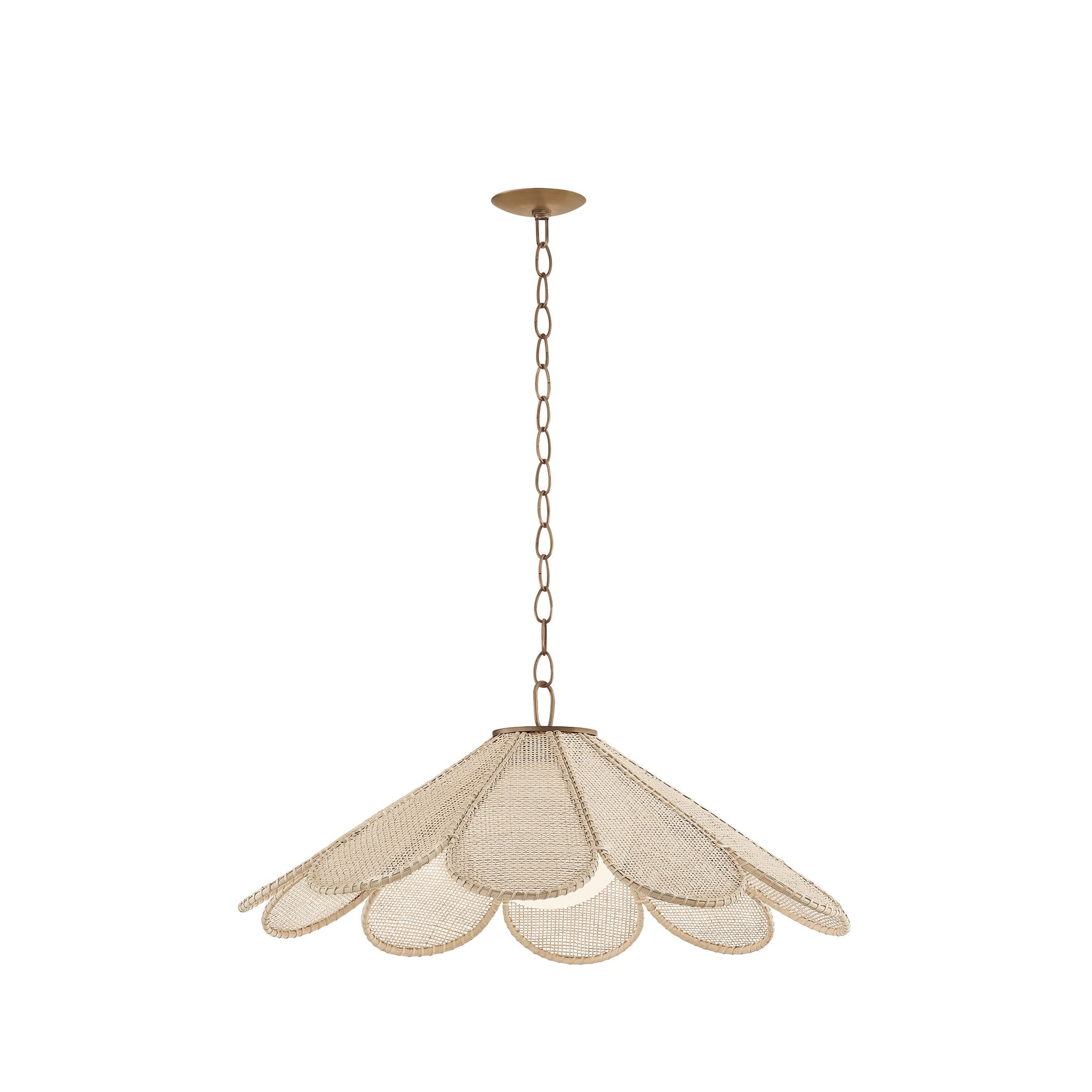 Inspirée par la beauté discrète de la nature, la suspension Petal présente des cannes de rotin tressées à la main, façonnées en délicats pétales qui entourent un globe en verre opale brillant. Sa silhouette organique, à la fois rustique et raffinée, est suspendue par une boucle et une chaîne en laiton patiné (PBR). Disponible en deux tailles, elle apportera une touche de charme au-dessus d'un îlot de cuisine ou d'un coin repas. Création de Lauren Liess pour Troy Lighting.