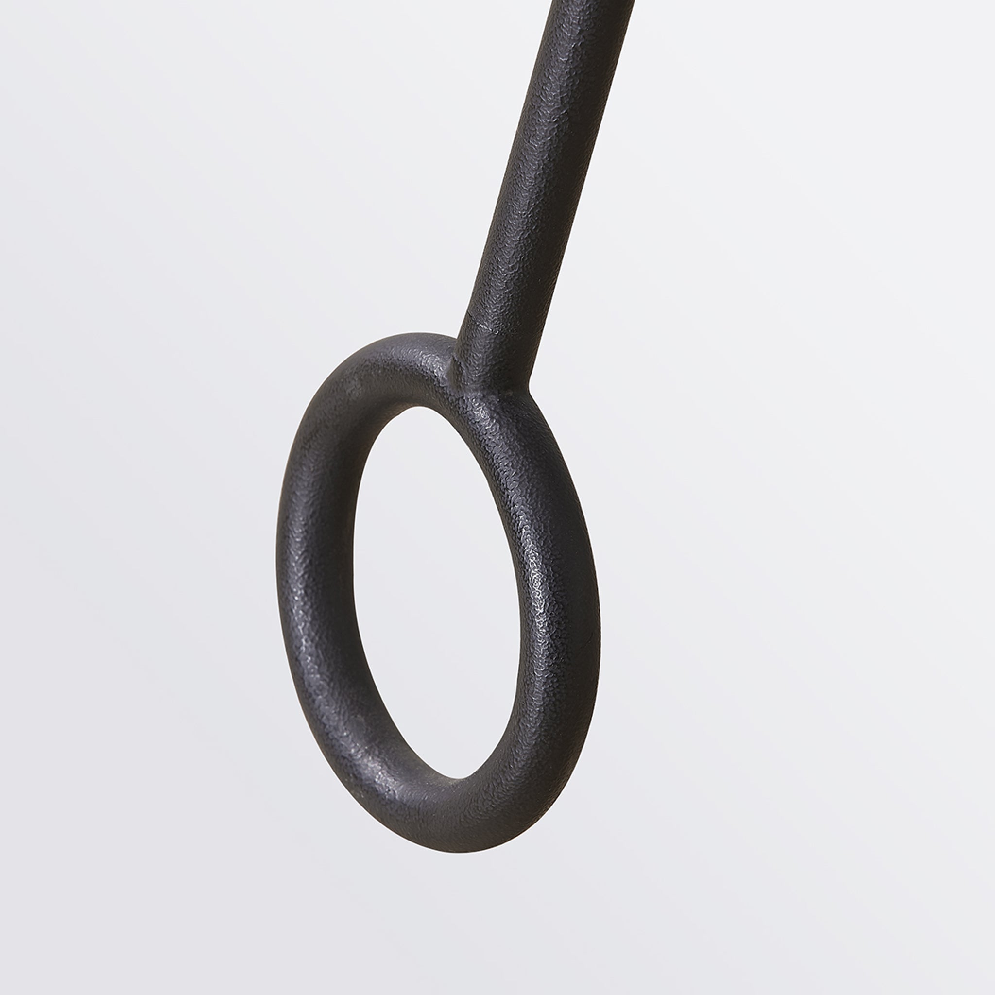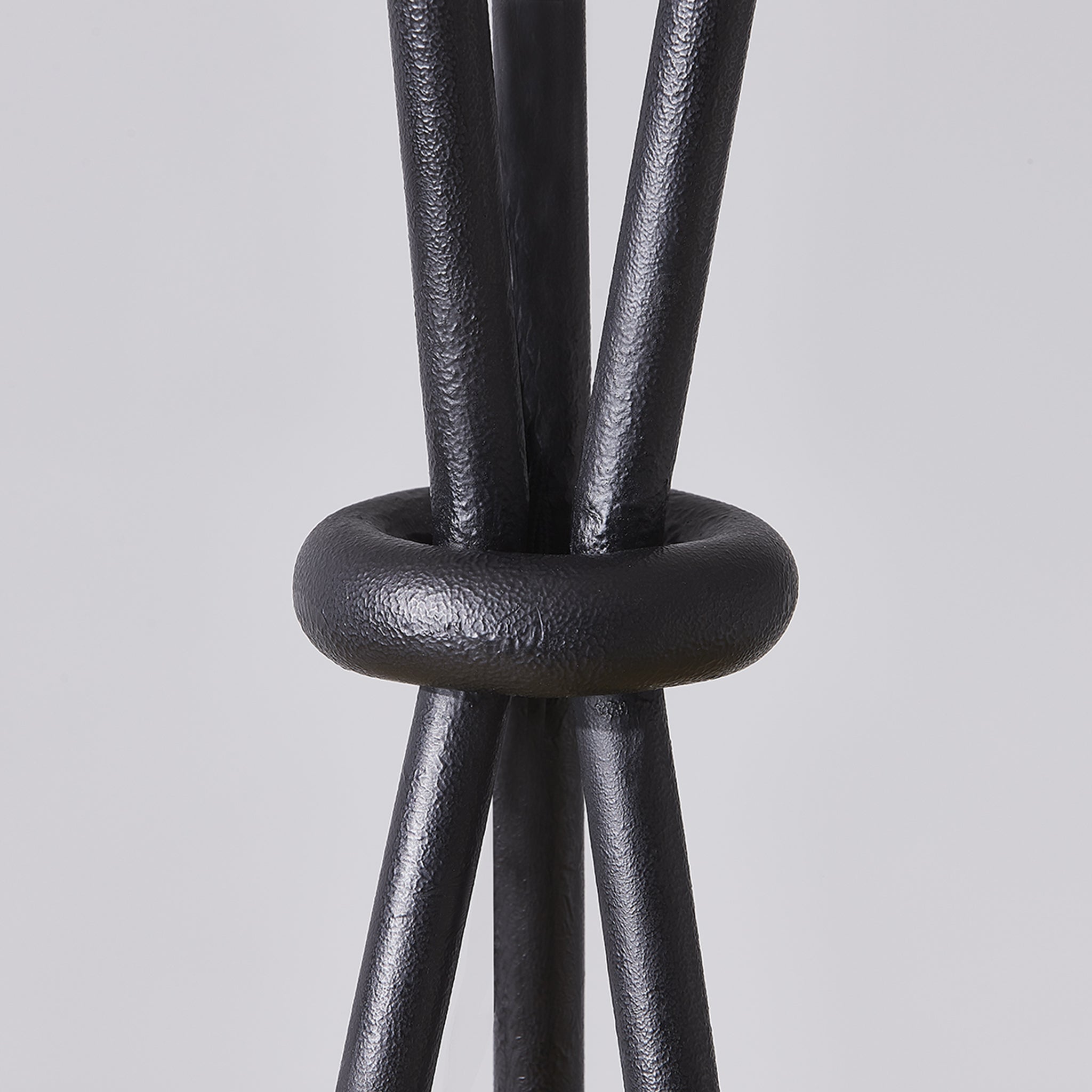 Des anneaux métalliques et de longs pieds fins, tous en fer forgé, forment le trépied aérien et unique de ce lampadaire. Un anneau supplémentaire au-dessus de l'abat-jour tambour en lin blanc fait office de fleuron, tandis qu'un autre, au niveau du col, relie les pieds, créant ainsi une magnifique silhouette en sablier. Un cordon noir torsadé confère une touche intemporelle à ce design moderne.
