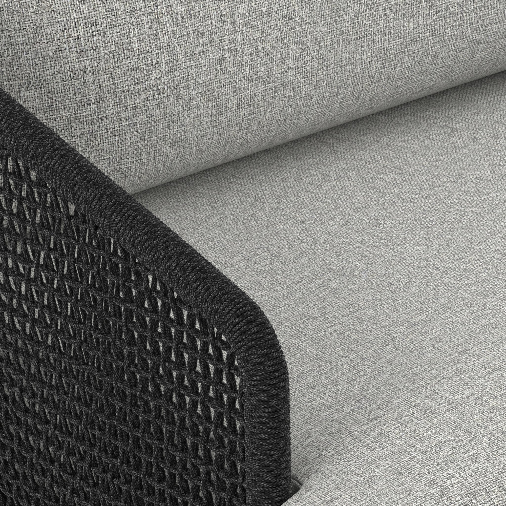 Matériaux : Bois de teck massif, aluminium thermolaqué, tressage gris foncé sur cadre en aluminium noir