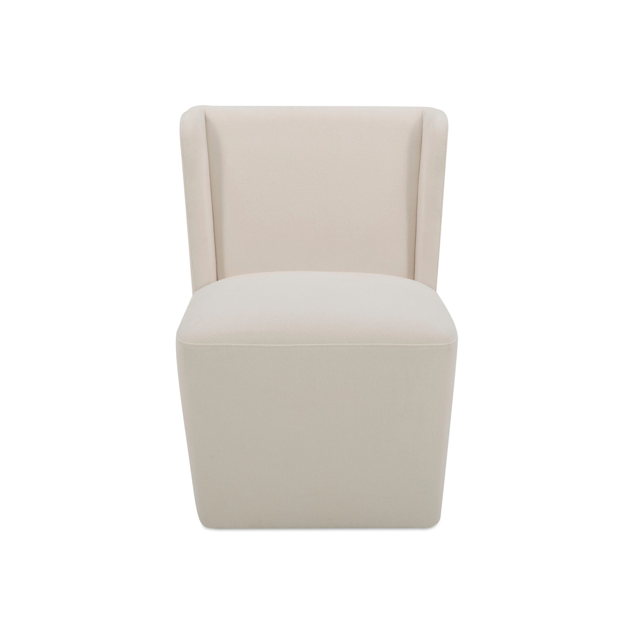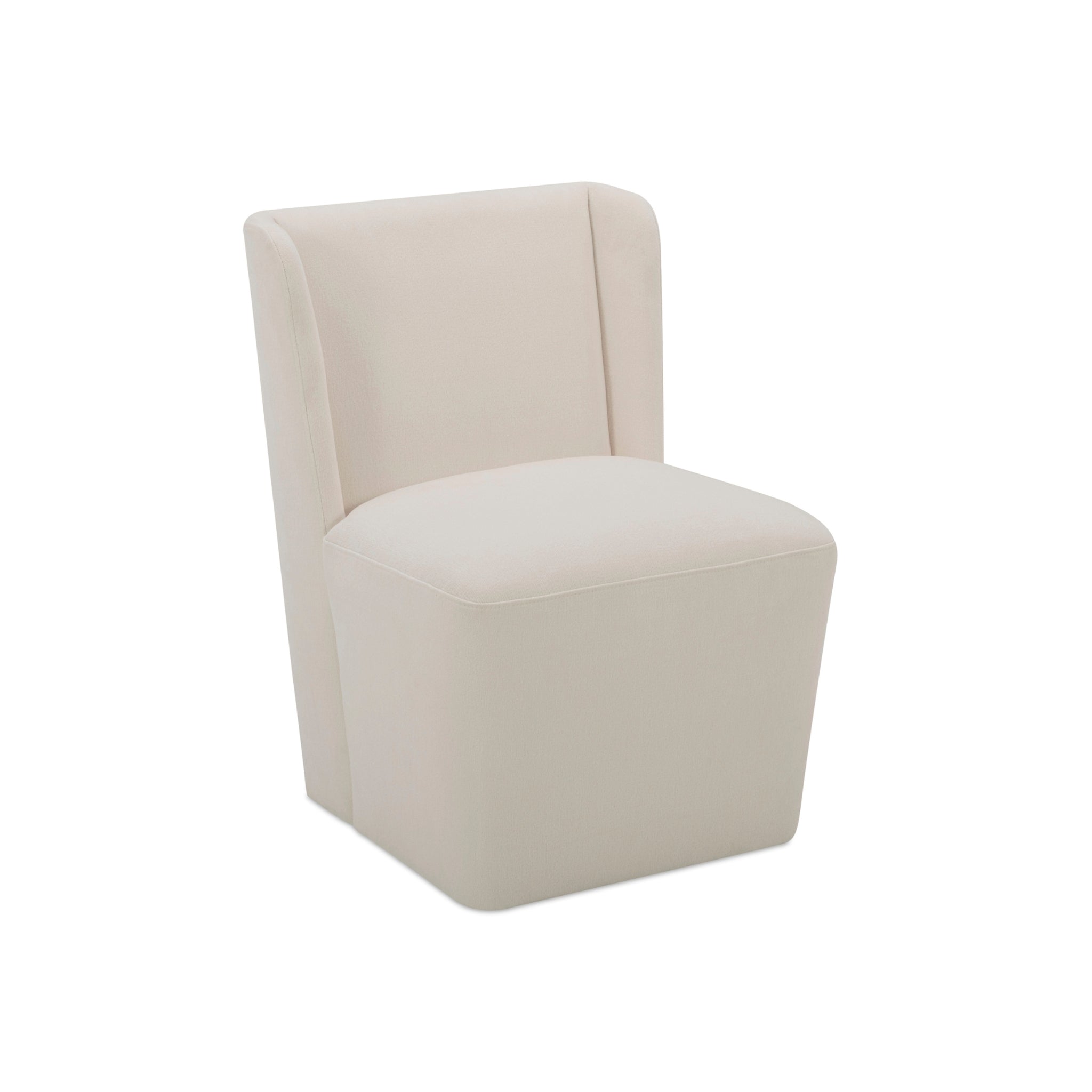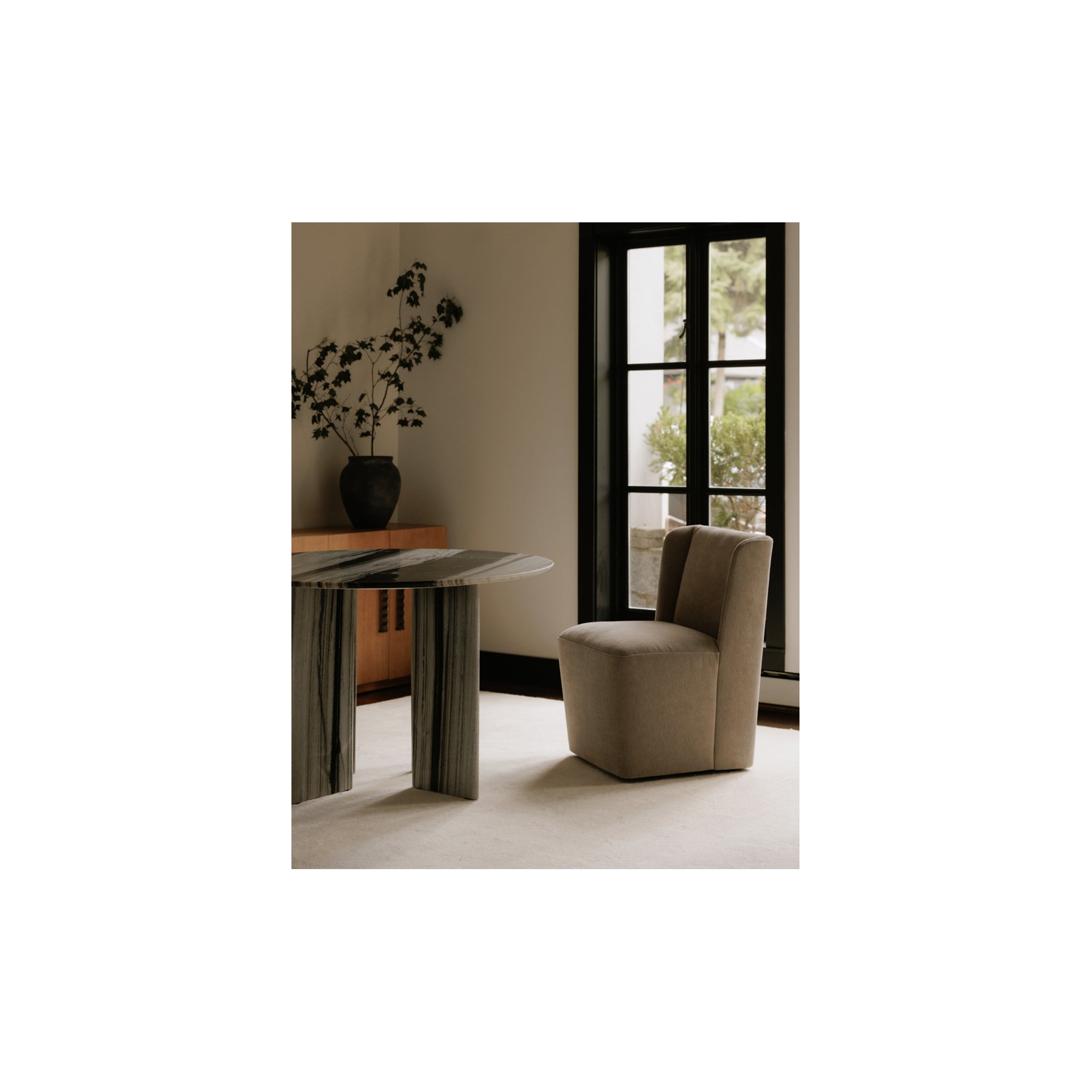 La chaise de salle à manger à roulettes Colette est synonyme de confort avec son assise et son dossier généreusement rembourrés, son dossier légèrement incurvé et ses roulettes qui glissent sans effort sur le sol. Fabriquée dans un tissu haute performance, doux au toucher et résistant aux taches, aux éclaboussures et à l'usure quotidienne.