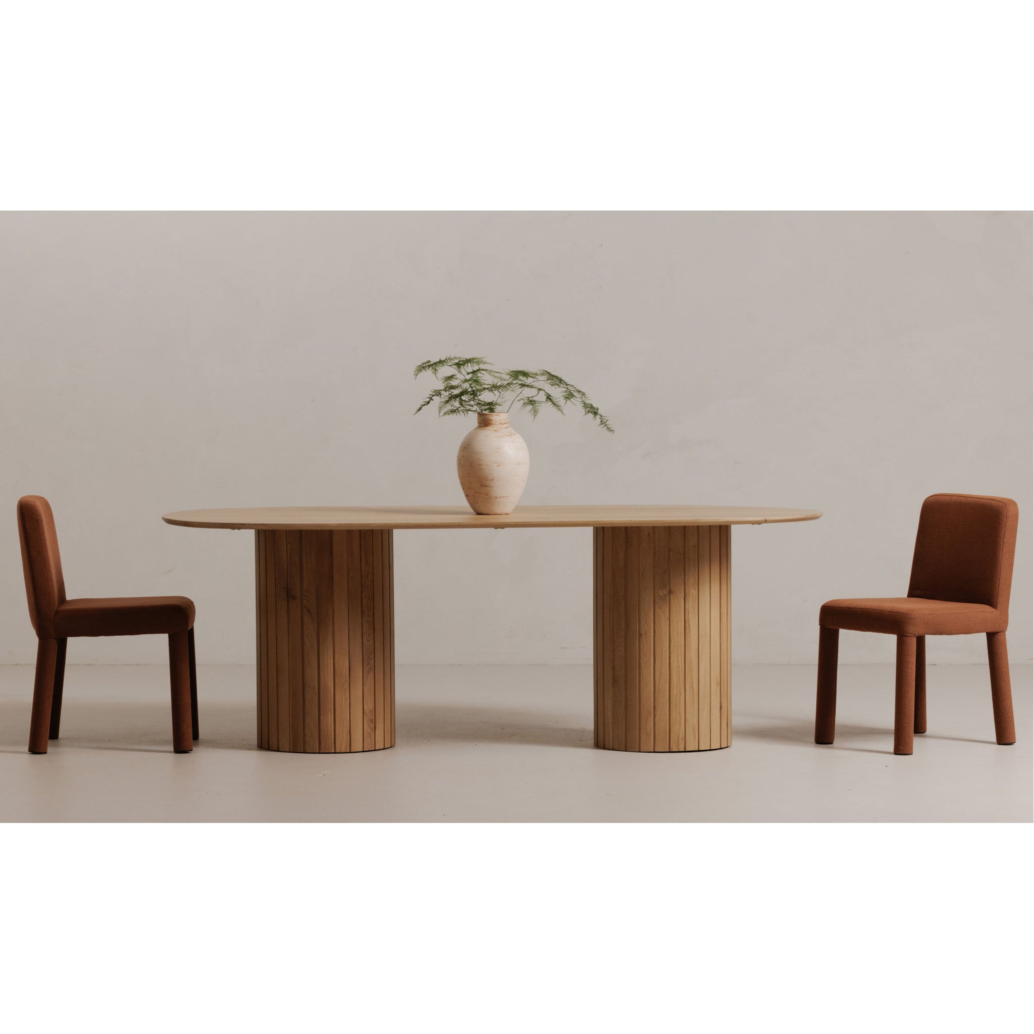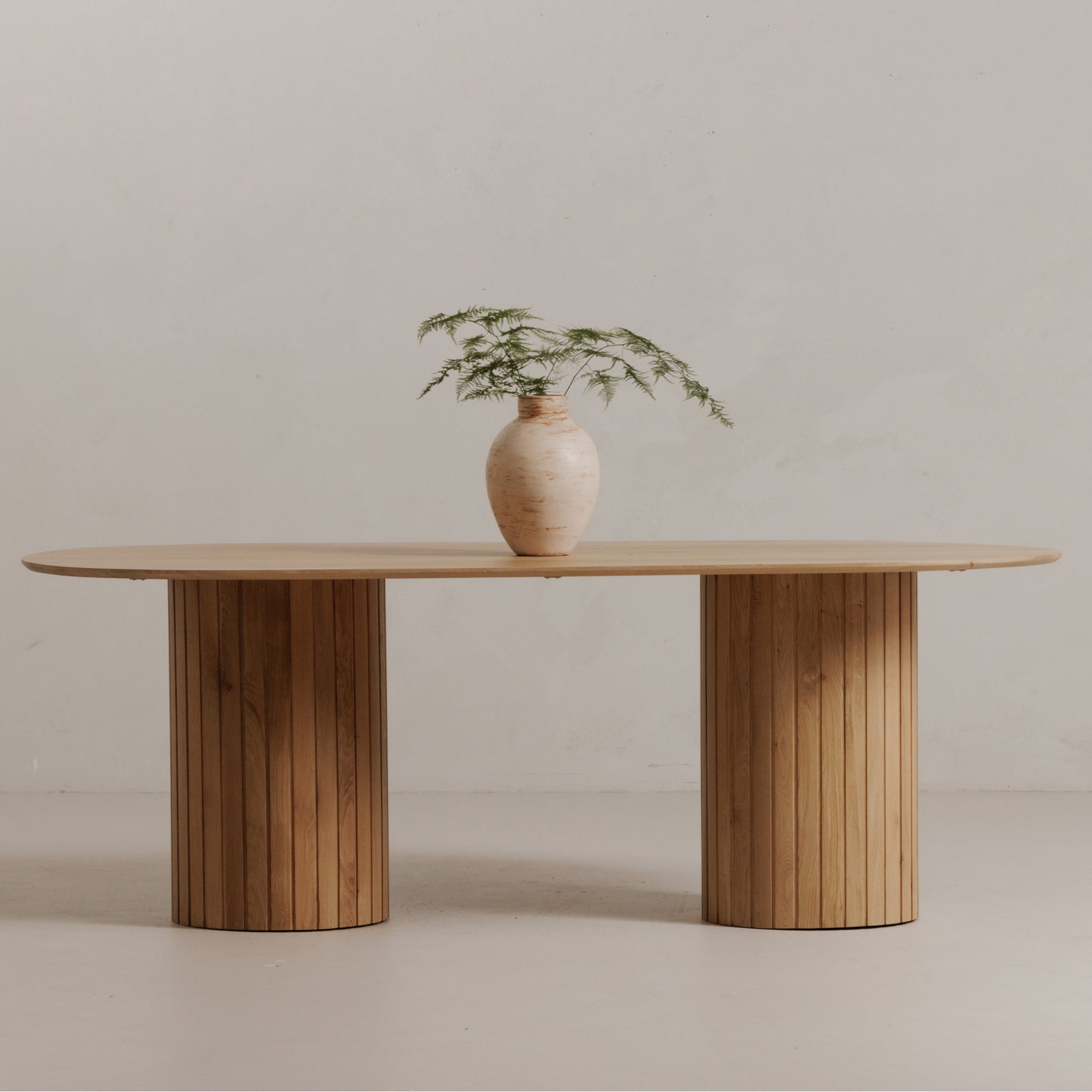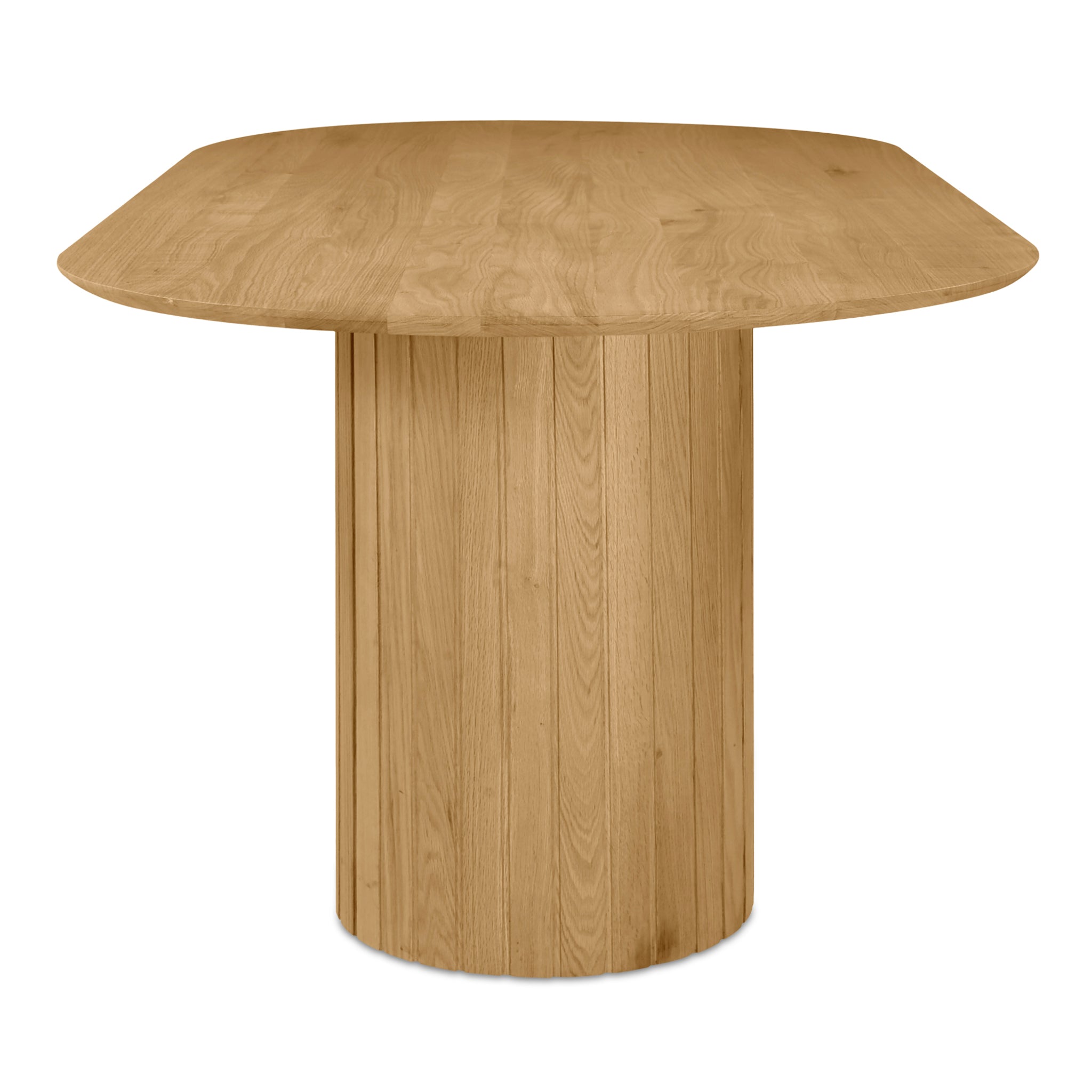 Convergence de formes et de lignes, la table à manger Pamela sera le pilier de votre salle à manger. Elle est composée de deux grandes colonnes soutenant un vaste plateau, dont les nervures délicates évoquent des ondulations et des vagues. Confectionnée en chêne massif, cette table à manger allie géométrie simple et matériaux naturels, incorporant l'élégance des proportions pour une allure audacieuse.