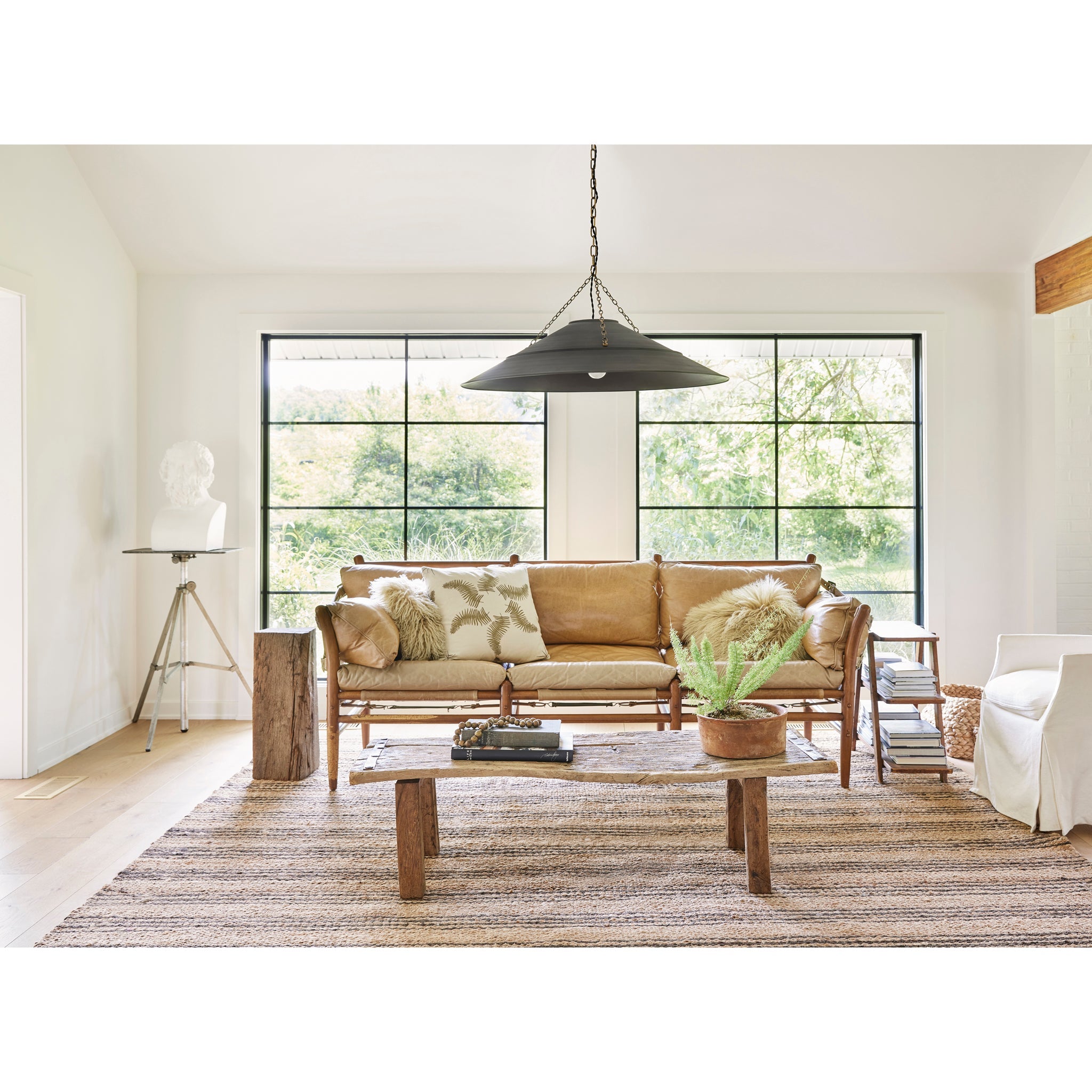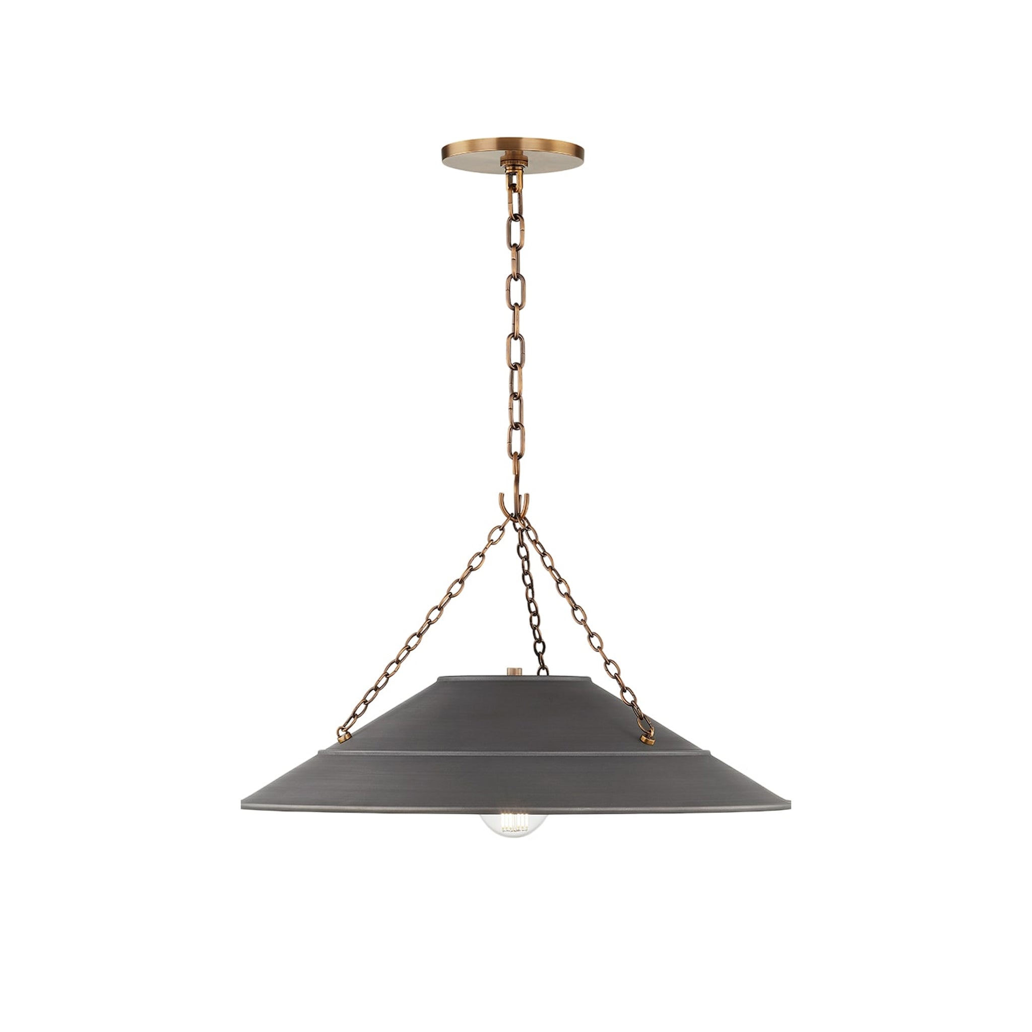 Avec sa structure métallique apparente, ses détails de chaîne et sa combinaison de finitions unique, Arcane dégage une allure industrielle raffinée. Son abat-jour graphite est chic et diffuse une lumière chaleureuse. Les éléments en laiton patiné, la chaîne et le pavillon apportent une touche d'éclat qui se marie à merveille avec le graphite. Le câble en tissu noir torsadé est un détail subtil qui confère à la suspension un charme vintage. Création de Lauren Liess pour Troy Lighting.