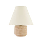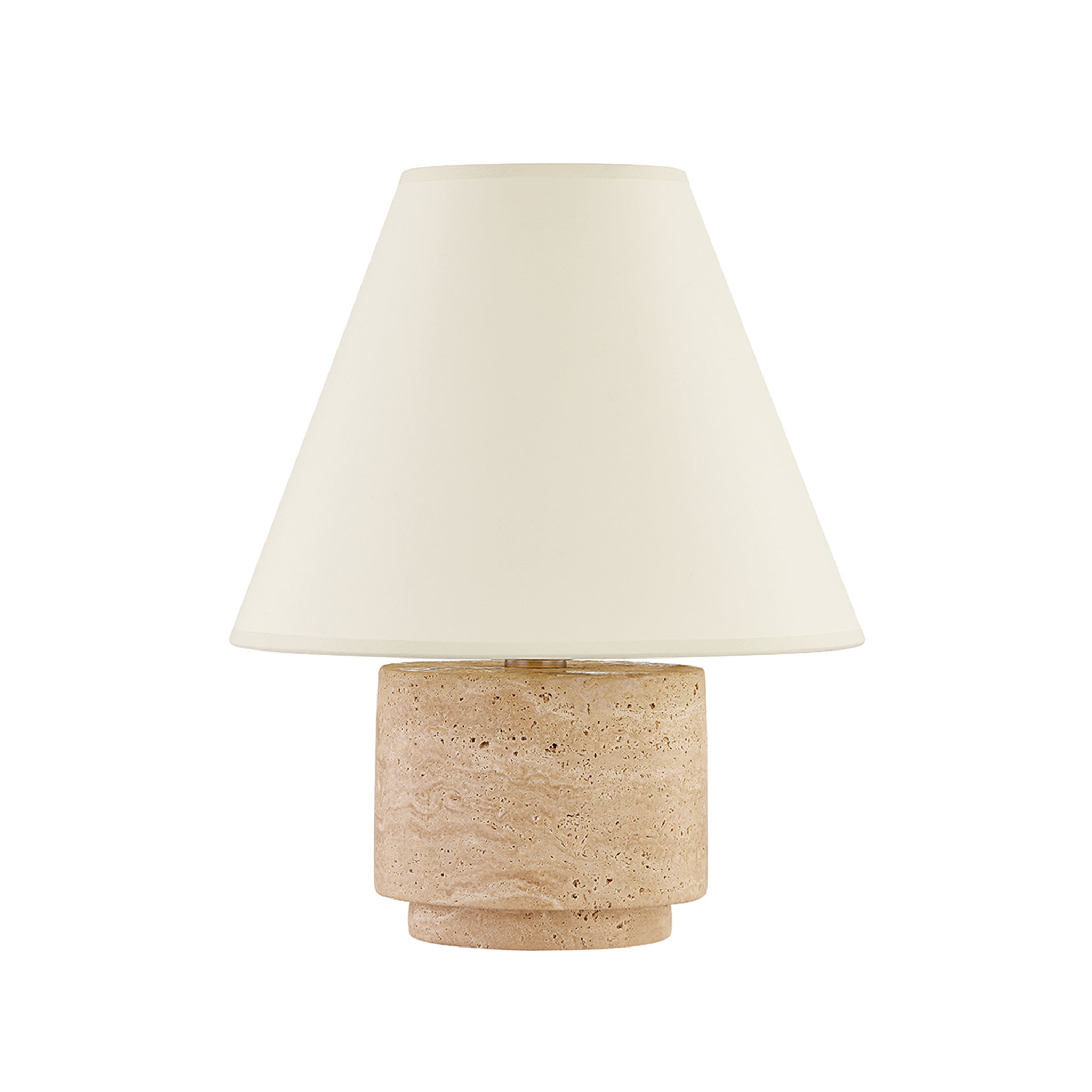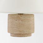 Un abat-jour fuselé en papier encadre magnifiquement la base en travertin naturel de Bronte, dirigeant la lumière vers le bas et autour pour mettre en valeur sa texture et ses motifs organiques. Une touche de laiton patiné confère à cette lampe de table aux tons naturels une touche de sophistication.