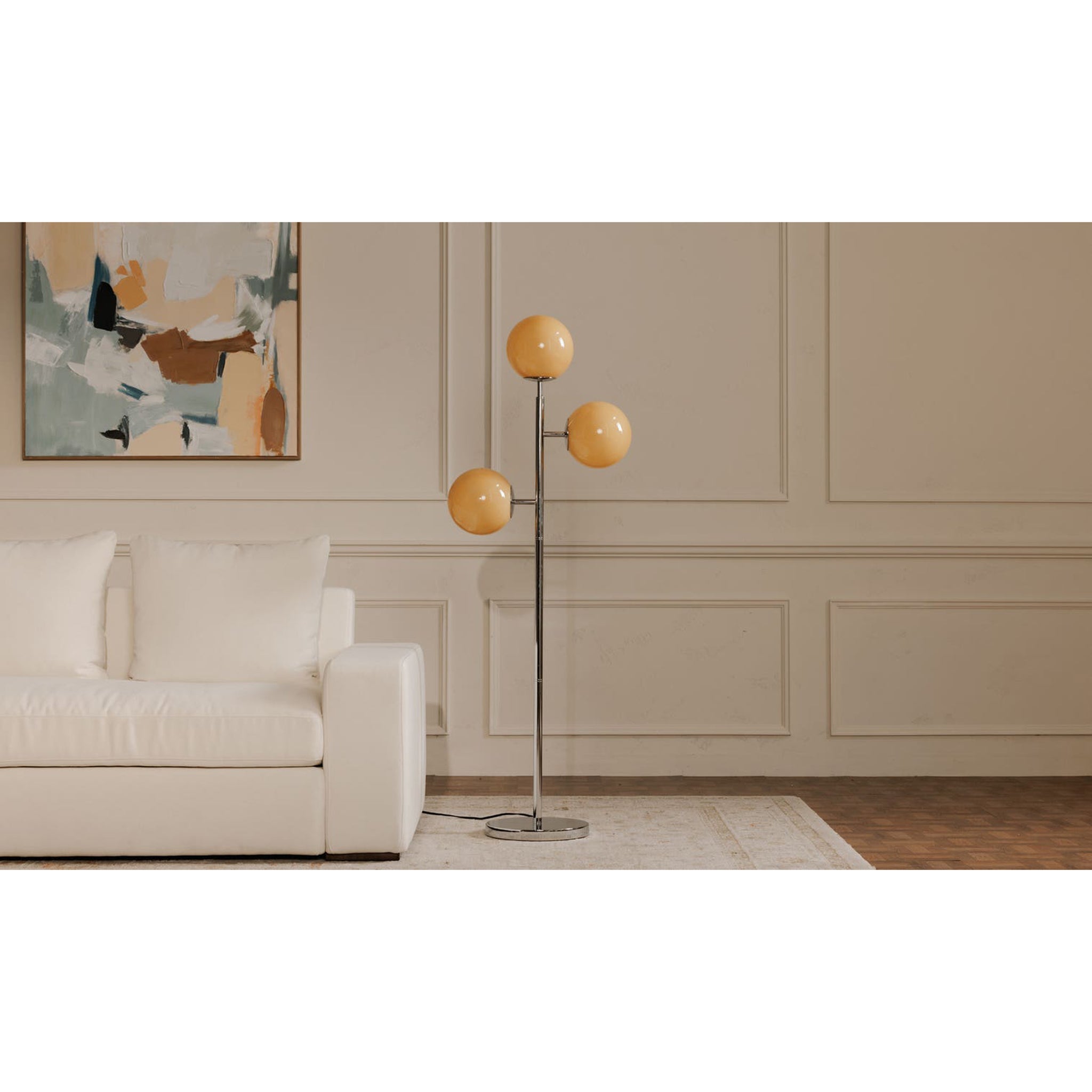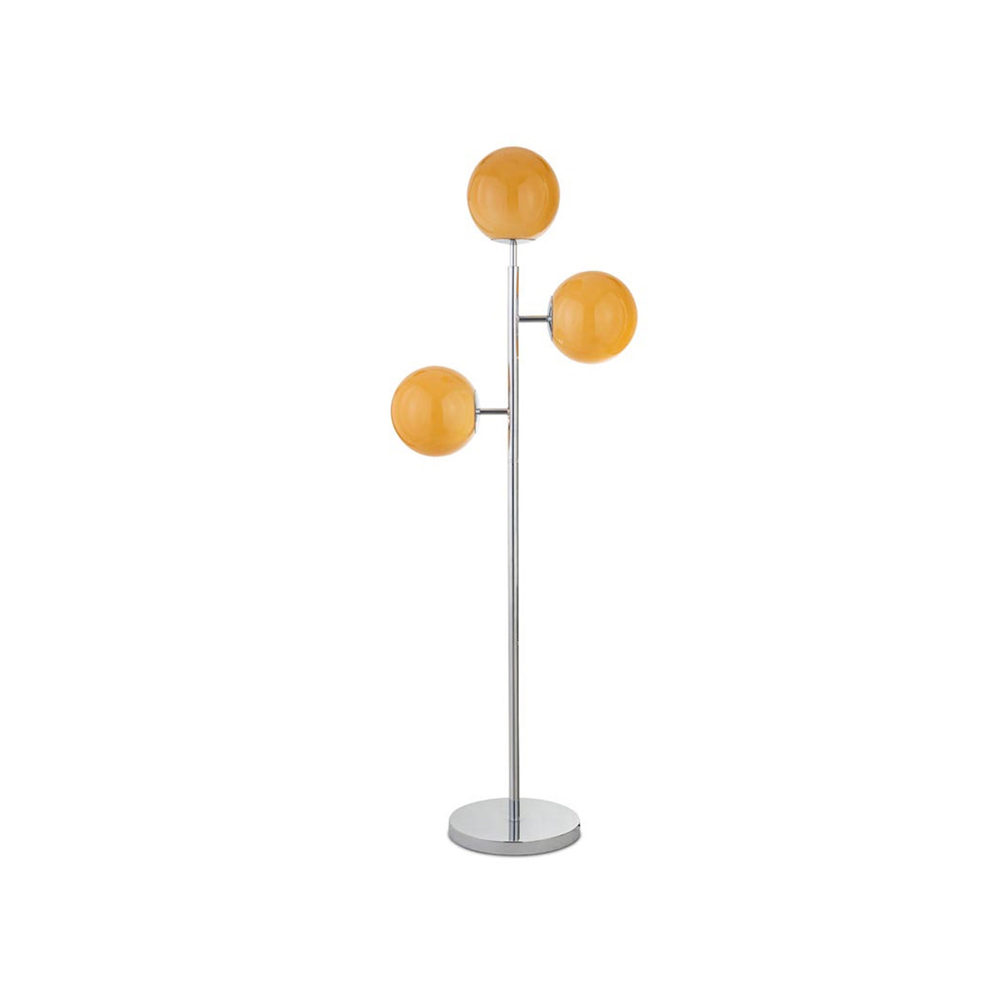 Le lampadaire Ilaria allie avec élégance charme vintage et modernité raffinée. Son abat-jour opaque, baigné d'une teinte ambroisie, diffuse une lumière intime. Orné de détails en argent poli et d'un socle minimaliste avec trois hauteurs de globe différentes, il incarne une essence nostalgique, rendue avec une finesse contemporaine – un éclairage tamisé, fruit d'un savoir-faire artisanal.