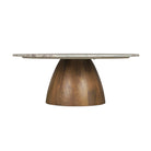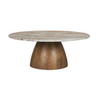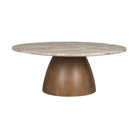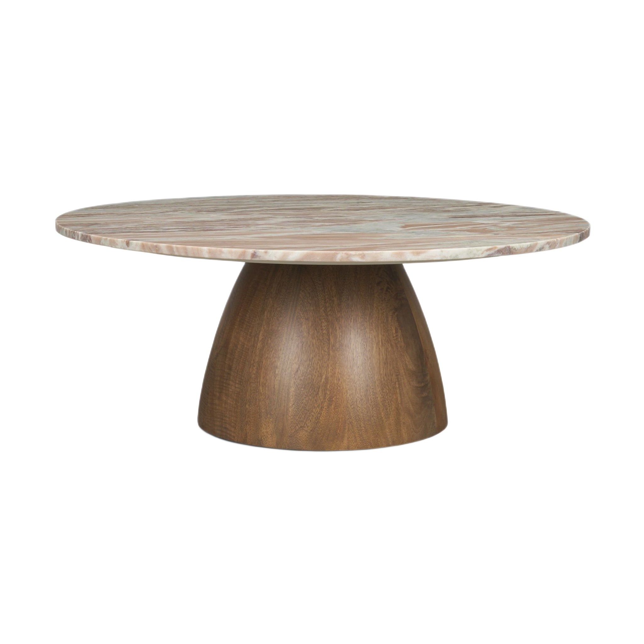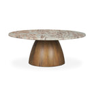 La table basse Alice présente un plateau rond en marbre rose et brun et un pied central en bois massif brun moyen.