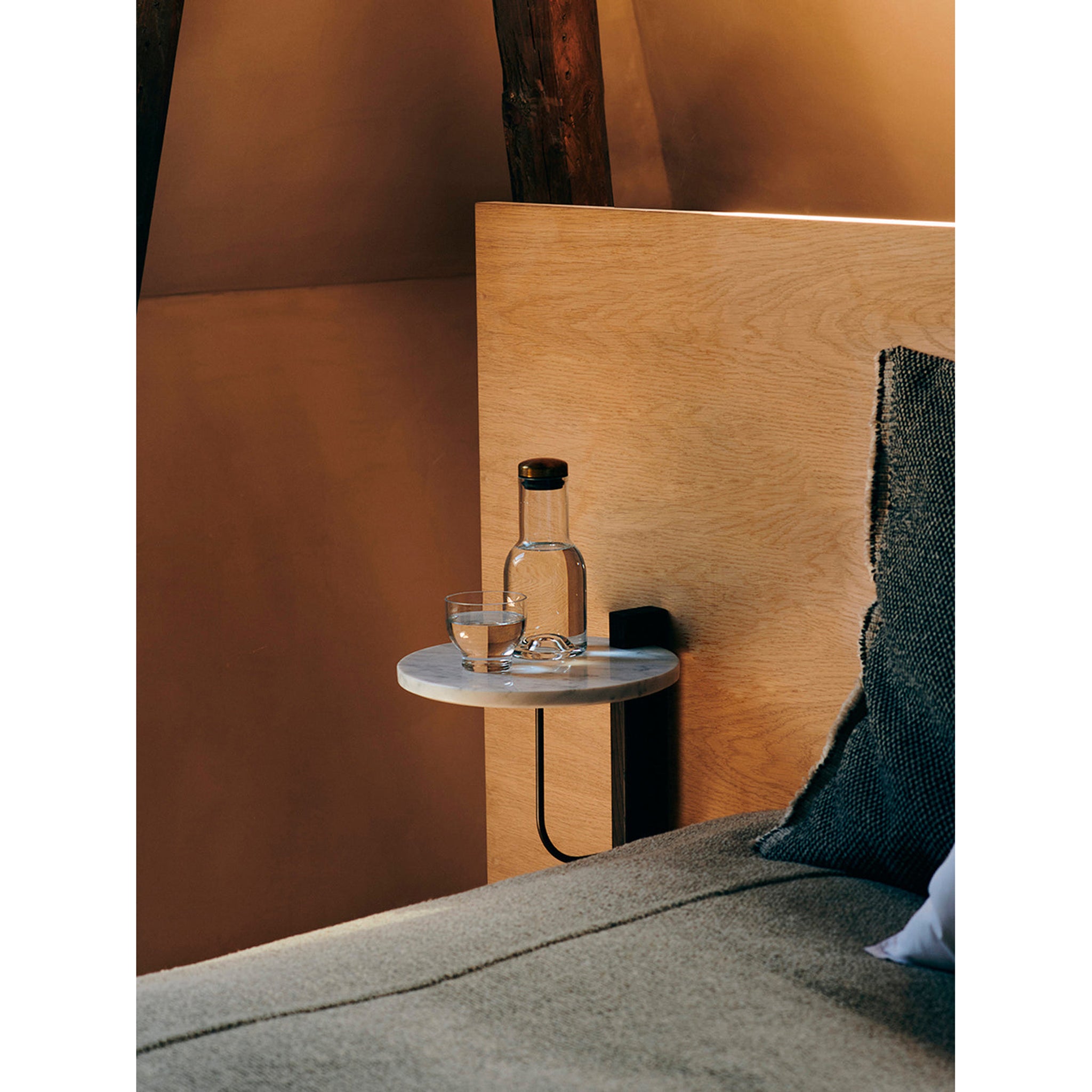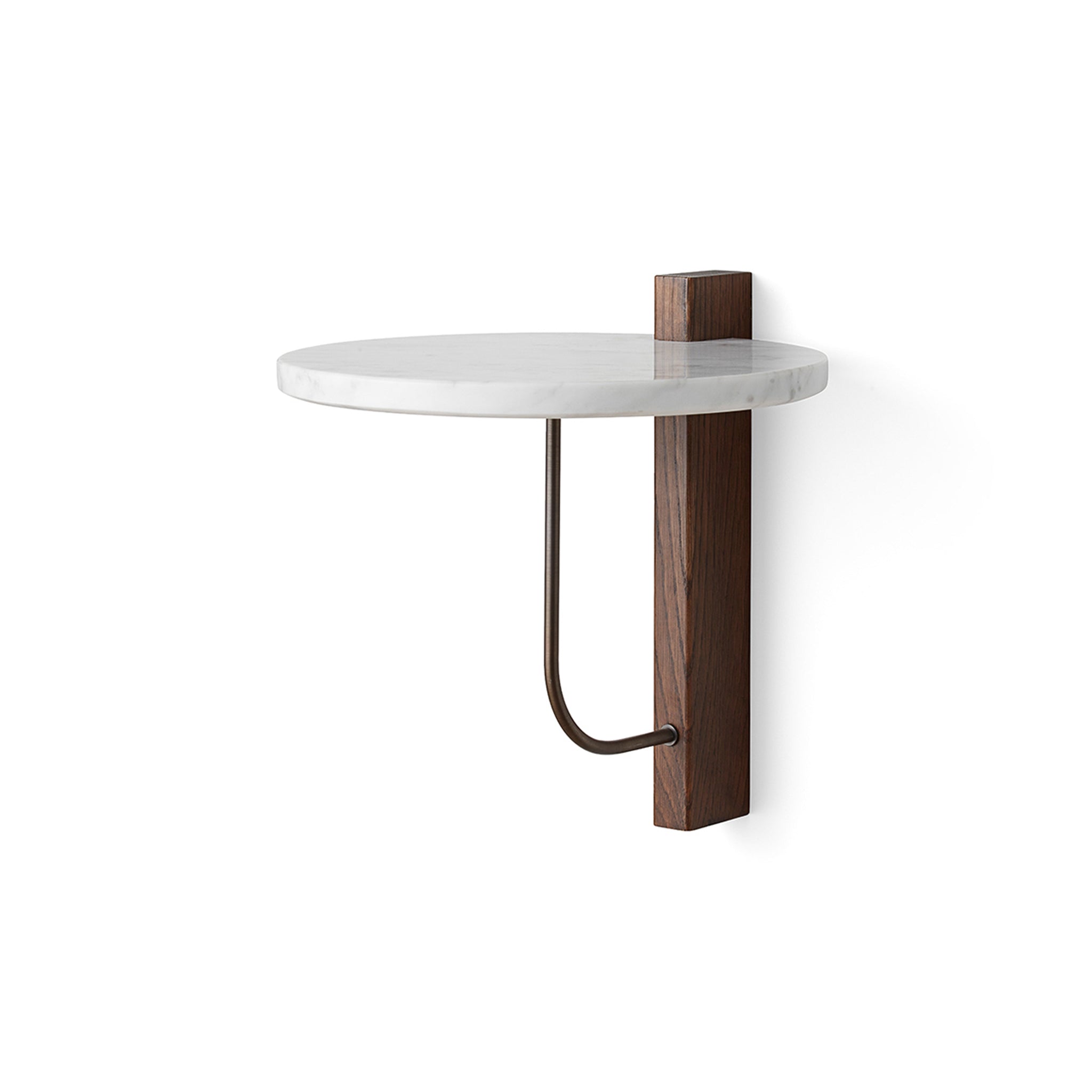 L'étagère Corbel, de style moderniste, est un podium mural qui associe des matériaux contrastés pour un effet saisissant. Créée par le studio de design Krøyer-Sætter-Lassen, cette étagère polyvalente en marbre, chêne teinté foncé et acier plaqué tire son nom et son esthétique des consoles architecturales porteuses traditionnellement réalisées en pierre ou en bois.
