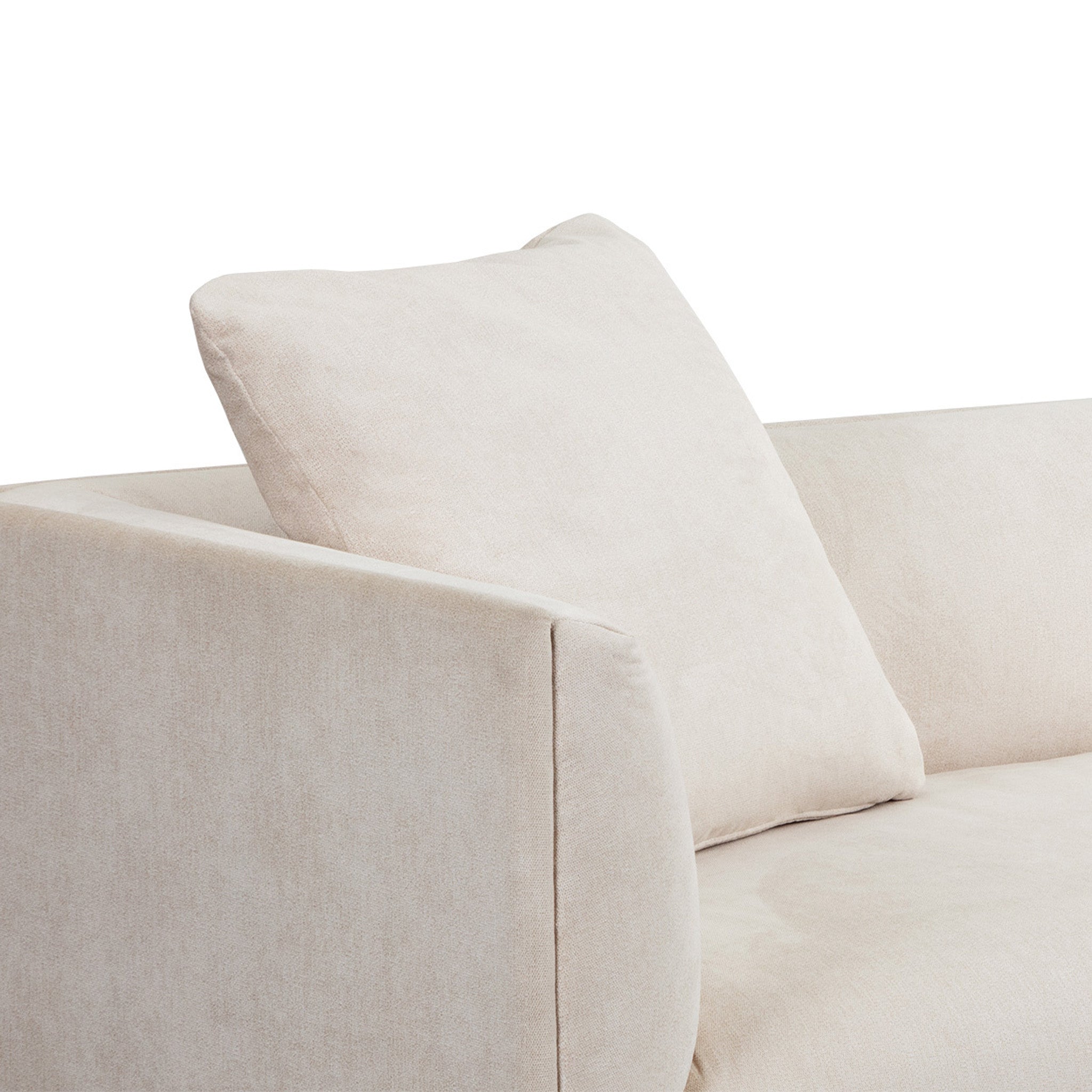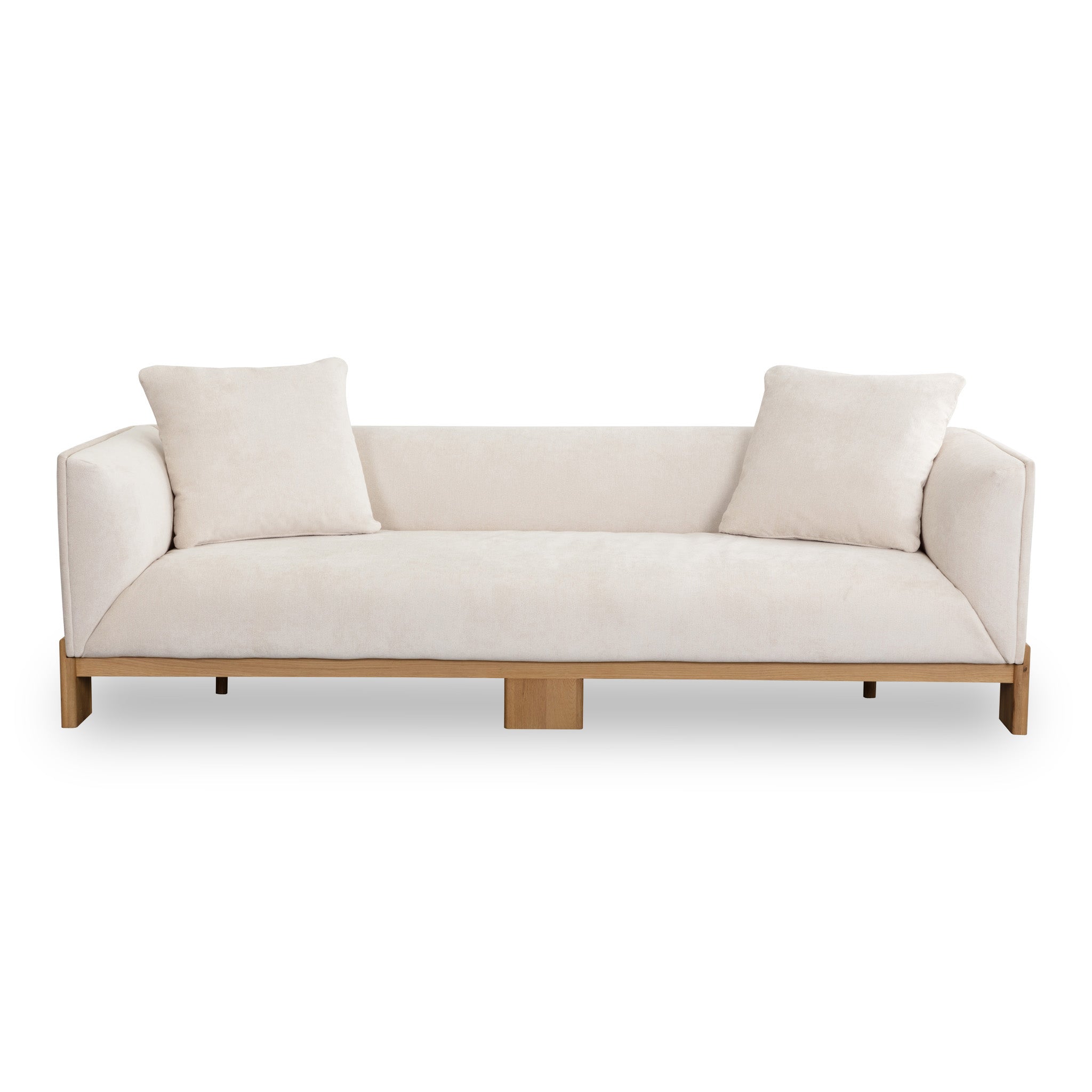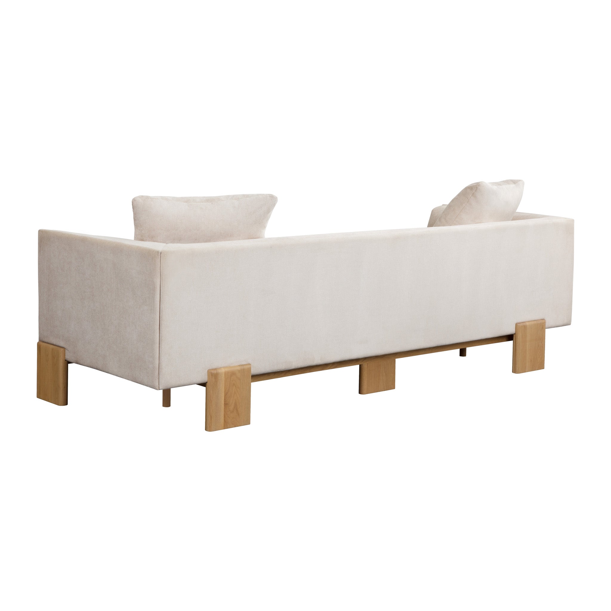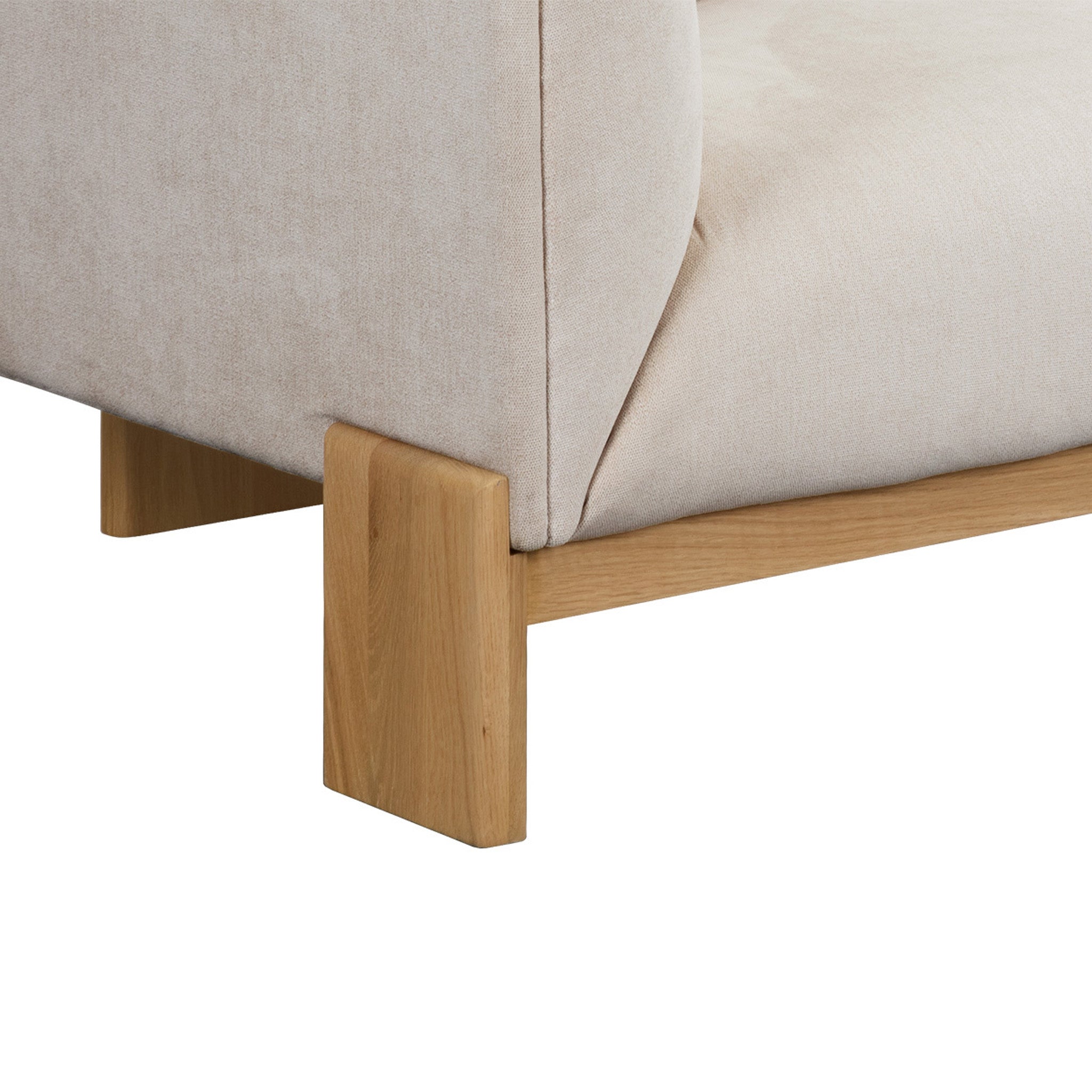 Le canapé Cruz se distingue par son profil raffiné, caractérisé par des lignes épurées et des accents organiques. Son assise confortable est revêtue d'un tissu performant en mousseline de coton. Un piètement rustique en chêne, avec des pieds apparents, apporte une touche d'élégance. Le tissu performant est hydrofuge, résistant et facile d'entretien. Le bois étant un matériau organique et poreux, chaque pièce présente des variations naturelles de texture, ainsi que de fines indentations et fissures. Les pièces en bois présentent également des différences de couleur et de veinage, et des nœuds et loupes visibles qui contribuent au caractère unique de chaque meuble.