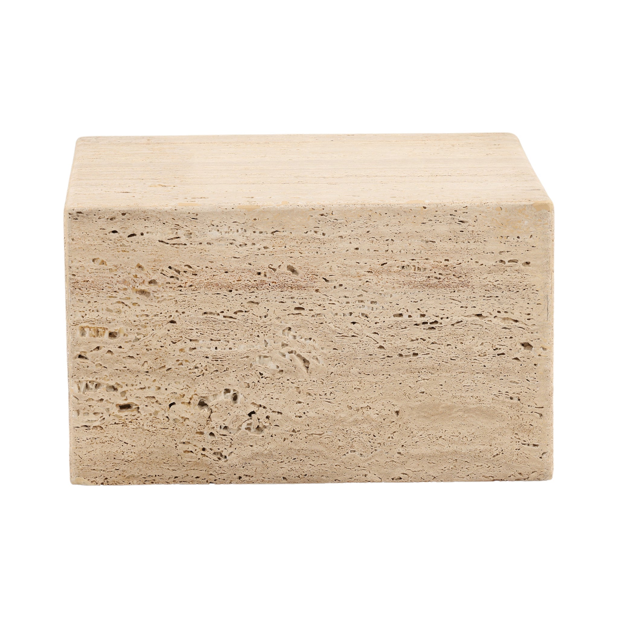 Taillé dans un seul bloc de travertin naturel, ce cube sculptural s'impose comme une pièce maîtresse à la fois puissante et inspirante. Sa forme géométrique simple contraste magnifiquement avec la texture brute et poreuse de la pierre, chaque pièce révélant des veinures uniques et des cavités naturelles qui racontent son histoire.