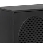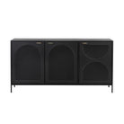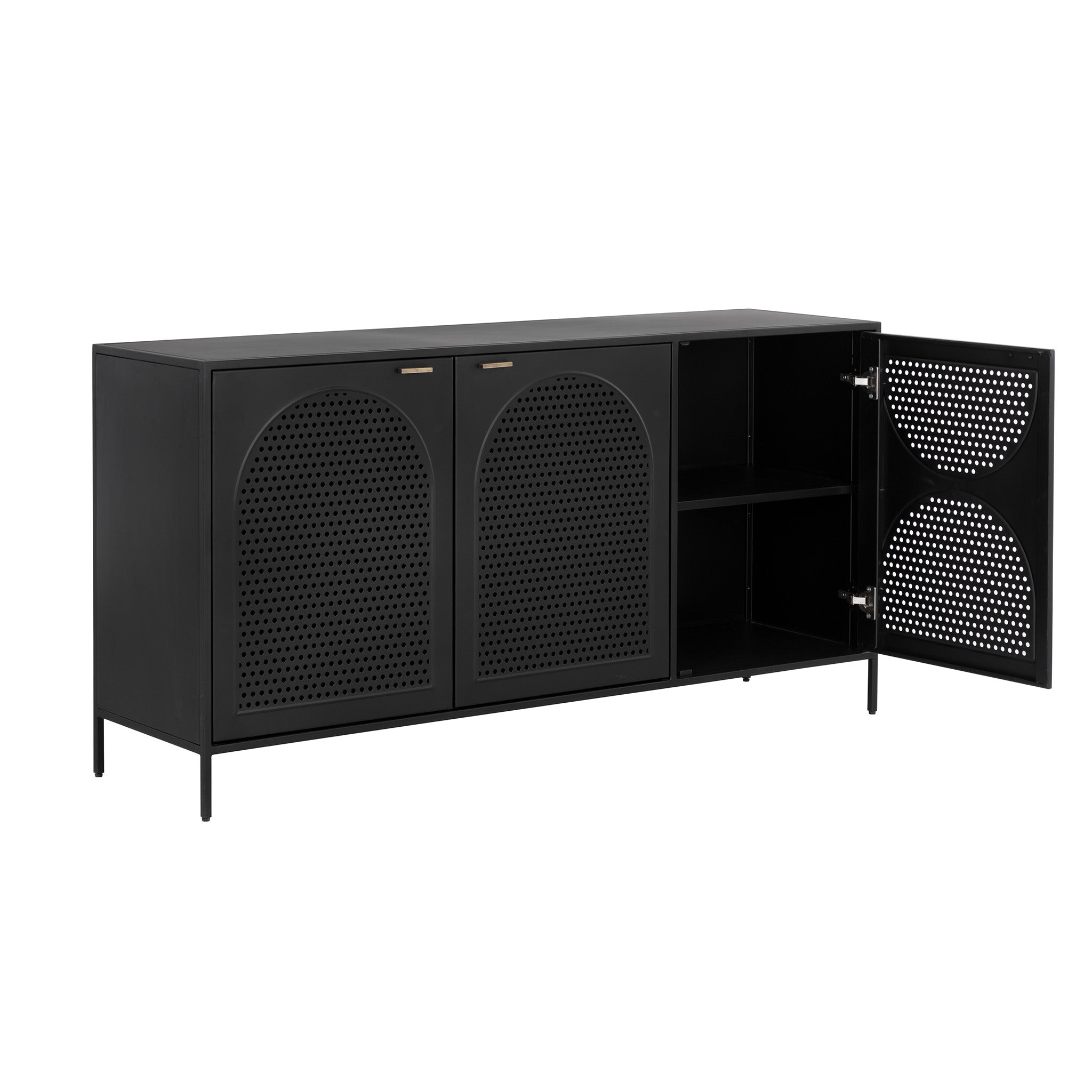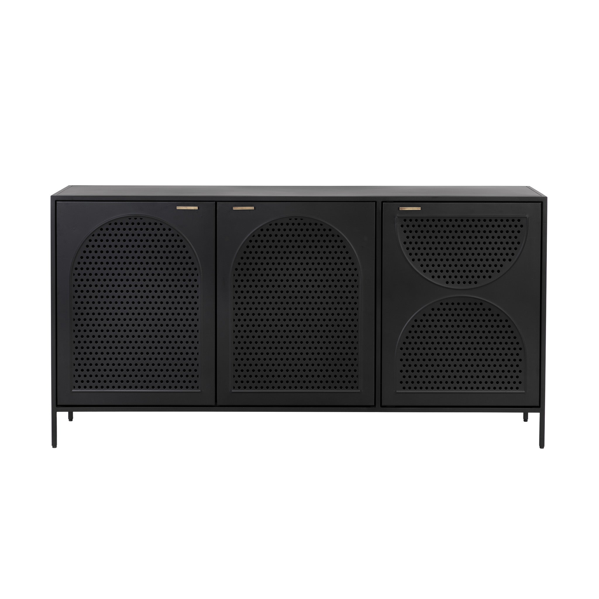Un buffet intemporel aux lignes épurées. Sa structure est en métal noir et ses poignées en laiton. Il comprend des étagères ouvertes et trois placards en métal perforé arqué. Il s'accorde parfaitement avec le meuble TV, le meuble de rangement et la table de chevet Frank. Fabriqué en Inde. Fruit d'un savoir-faire exceptionnel, ce meuble a été réalisé par des artisans locaux qualifiés. De par la nature des matériaux utilisés, il présente des imperfections uniques telles que des marques et des variations de couleur, ce qui en fait une pièce véritablement unique.