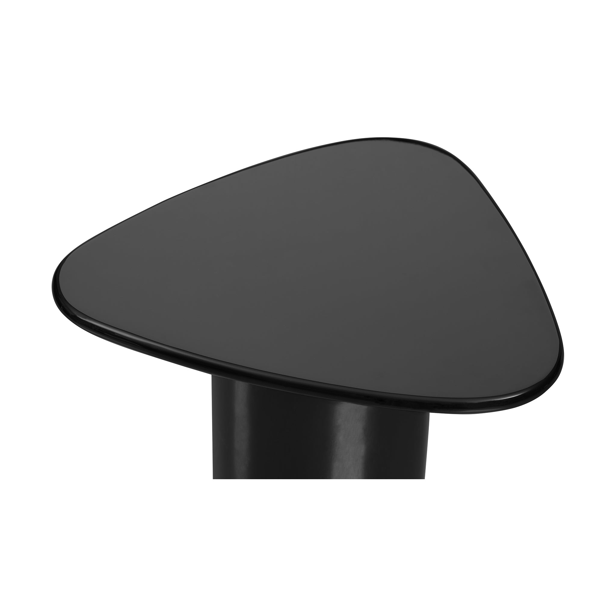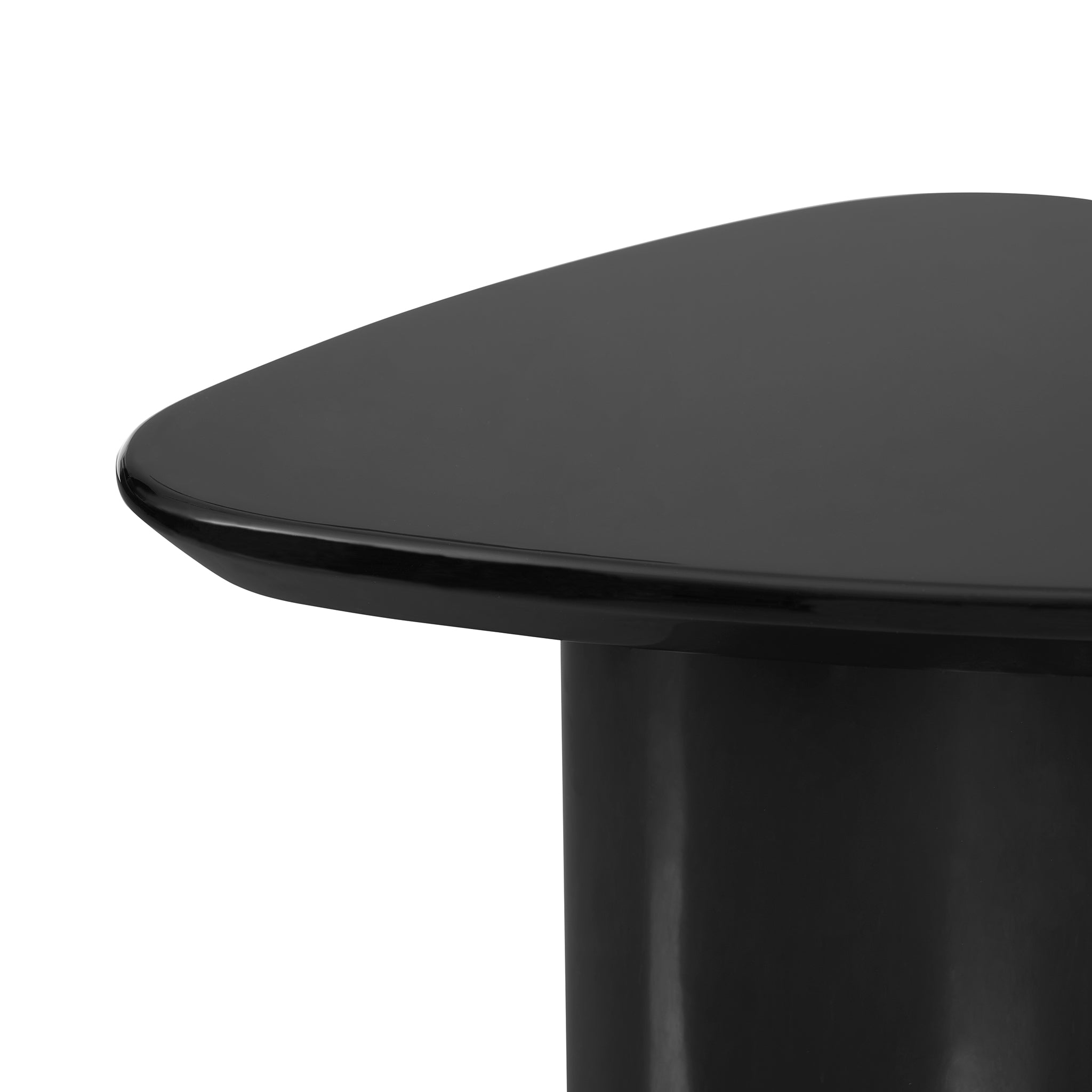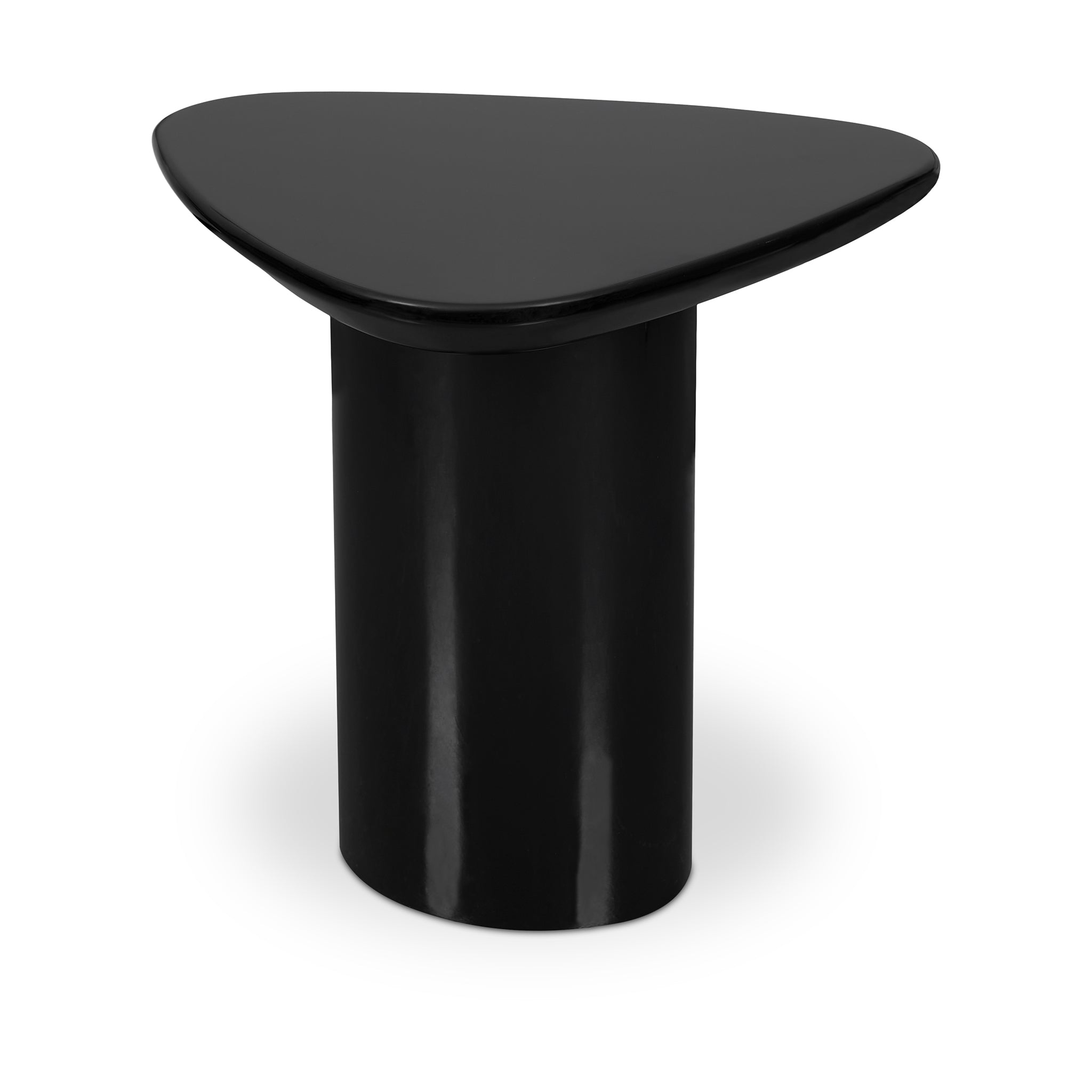 La table d'appoint Julian présente une forme triangulaire arrondie et un piétement ovale, créant une silhouette sculpturale à l'élégance moderne. Sa finition blanc ivoire et noir brillant reflète la lumière et illumine l'espace.