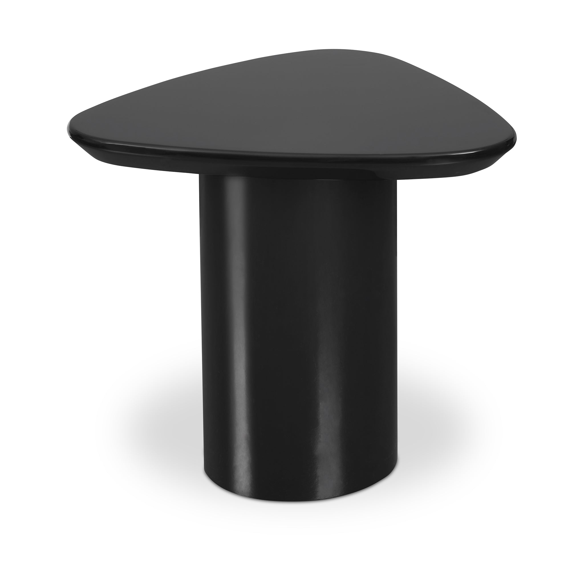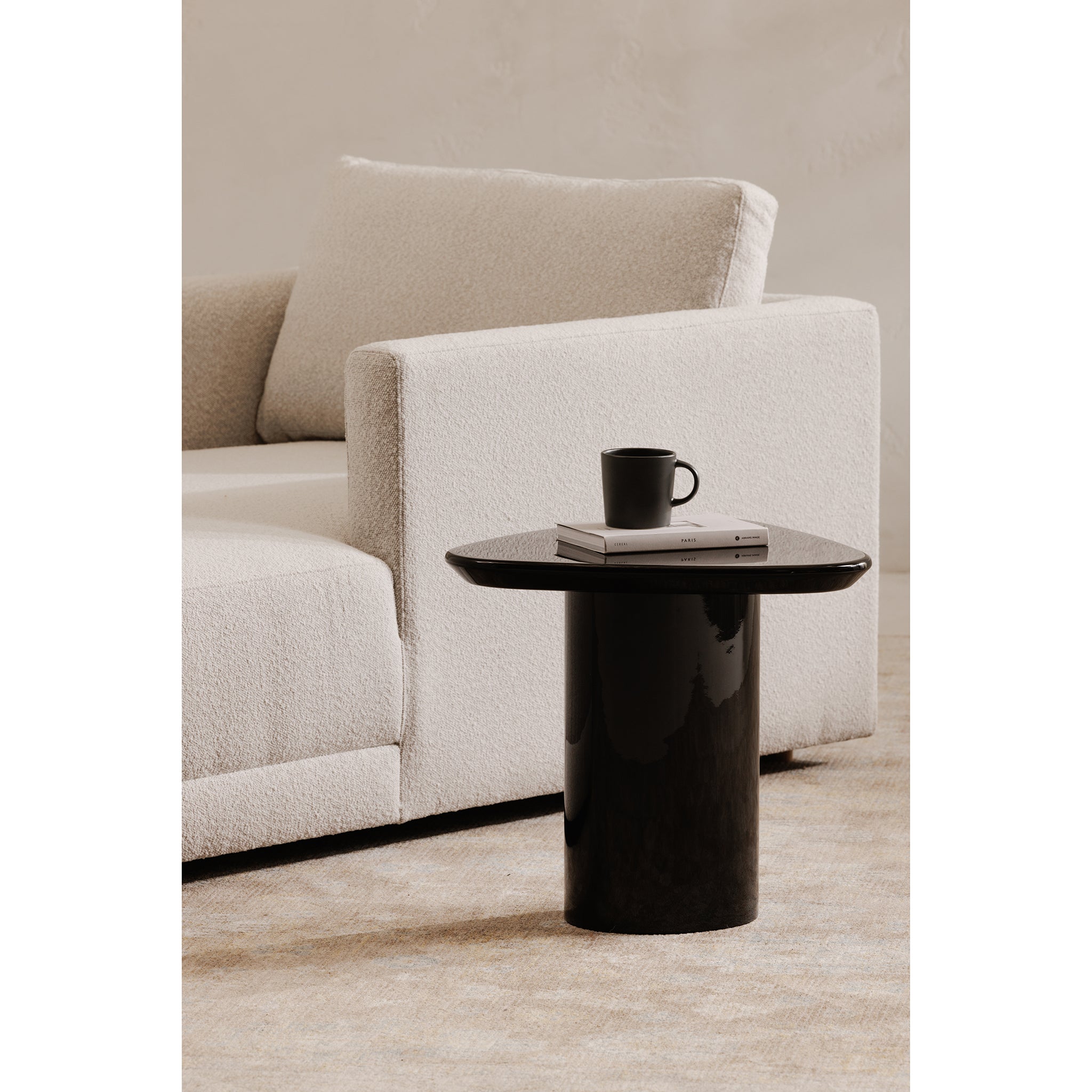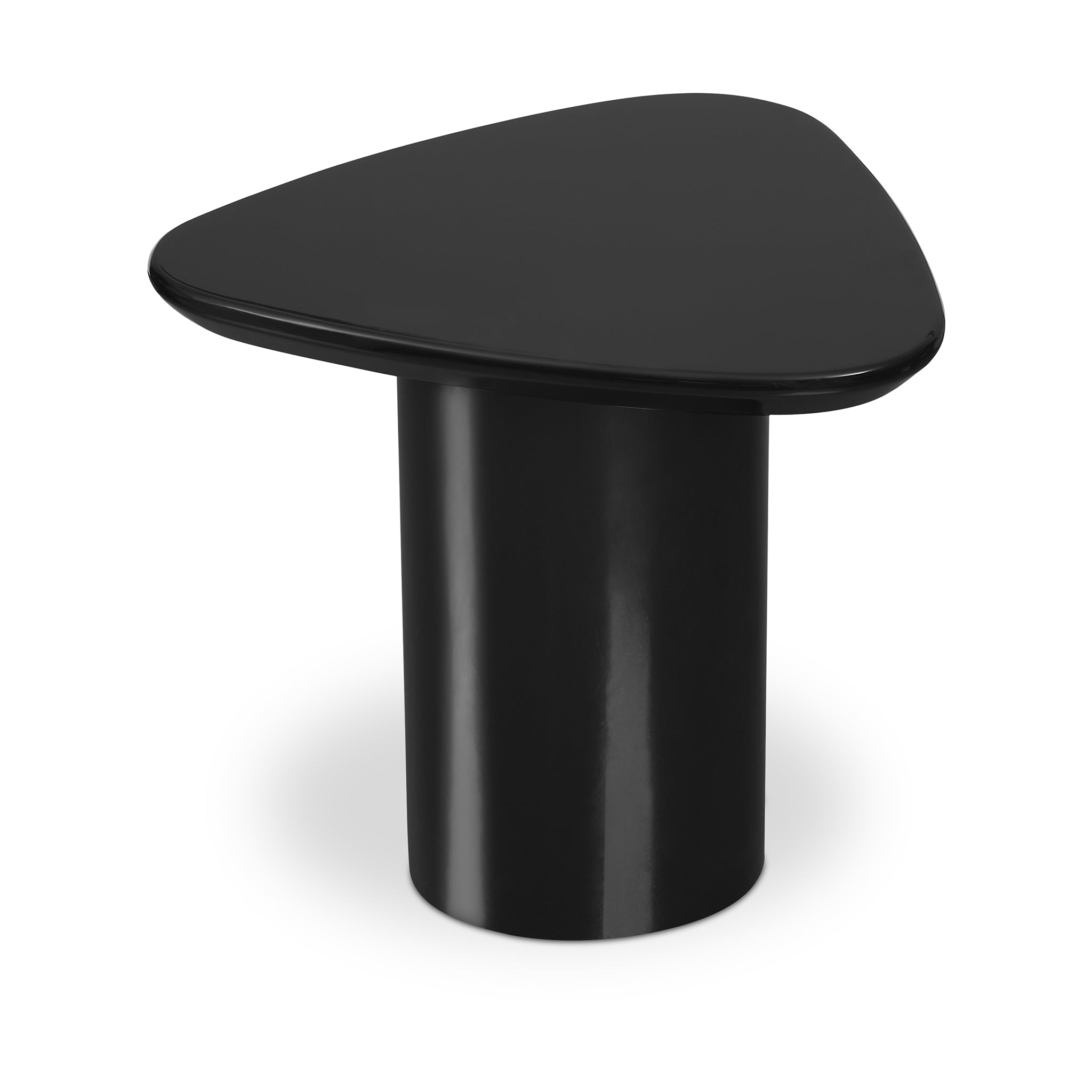 La table d'appoint Julian présente une forme triangulaire arrondie et un piétement ovale, créant une silhouette sculpturale à l'élégance moderne. Sa finition blanc ivoire et noir brillant reflète la lumière et illumine l'espace.