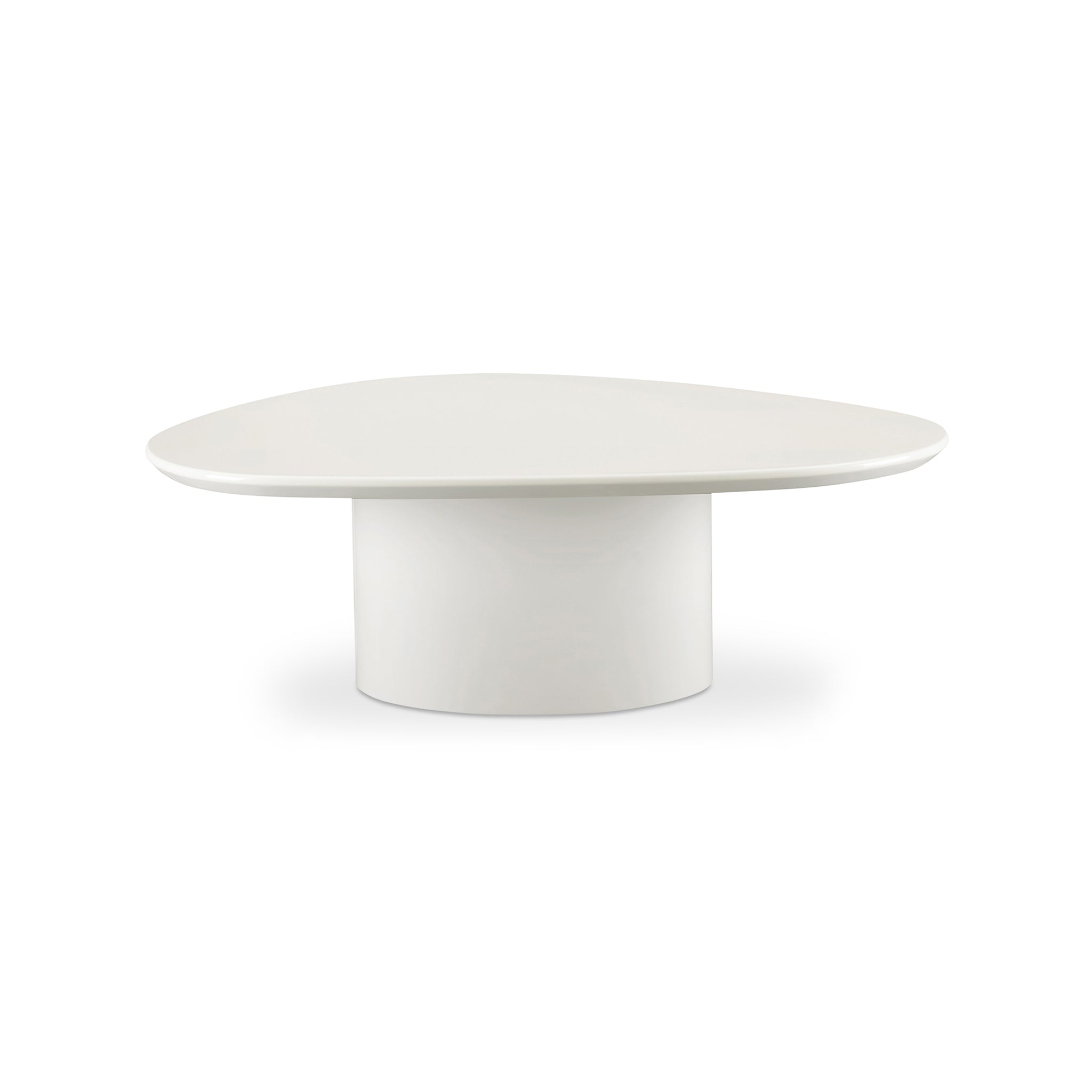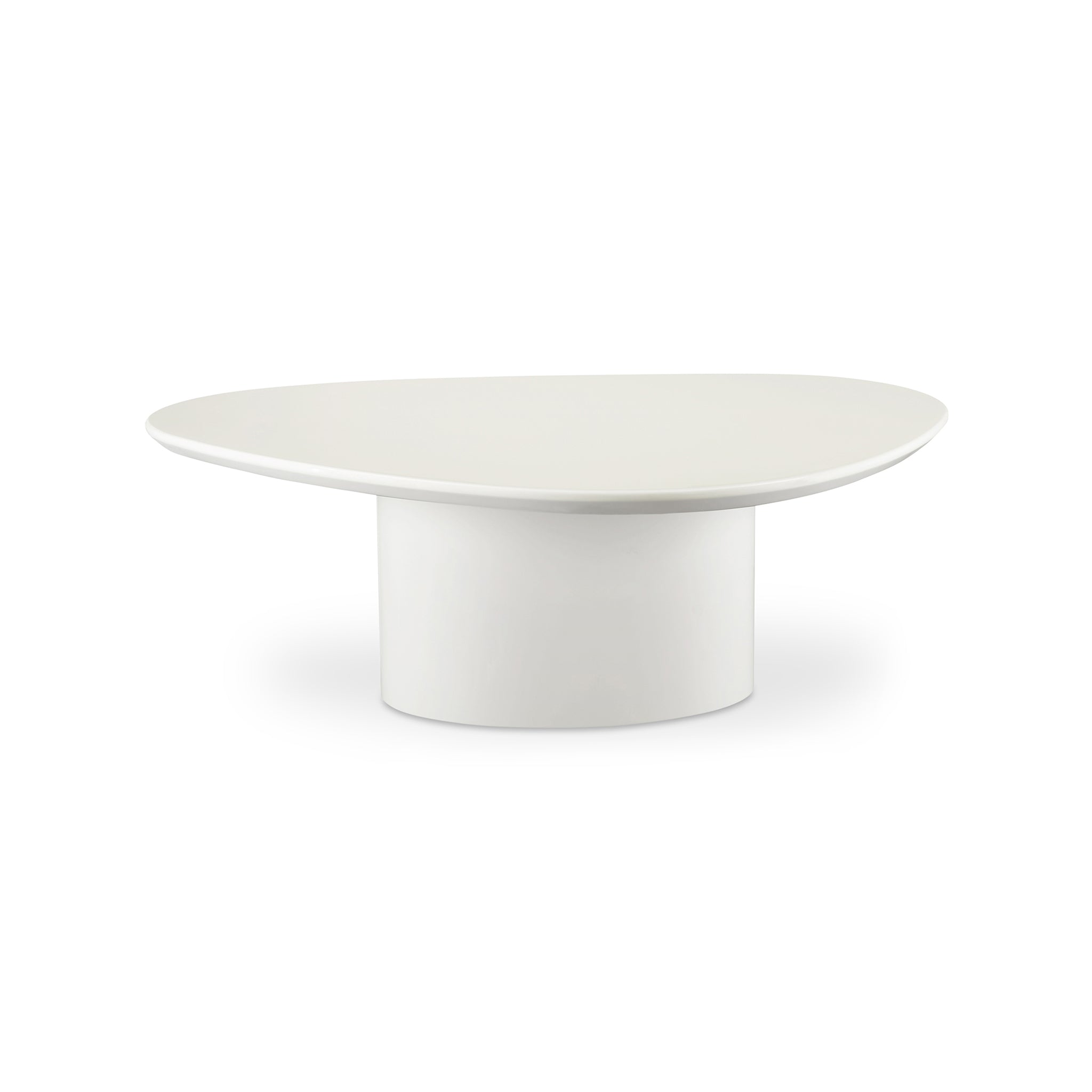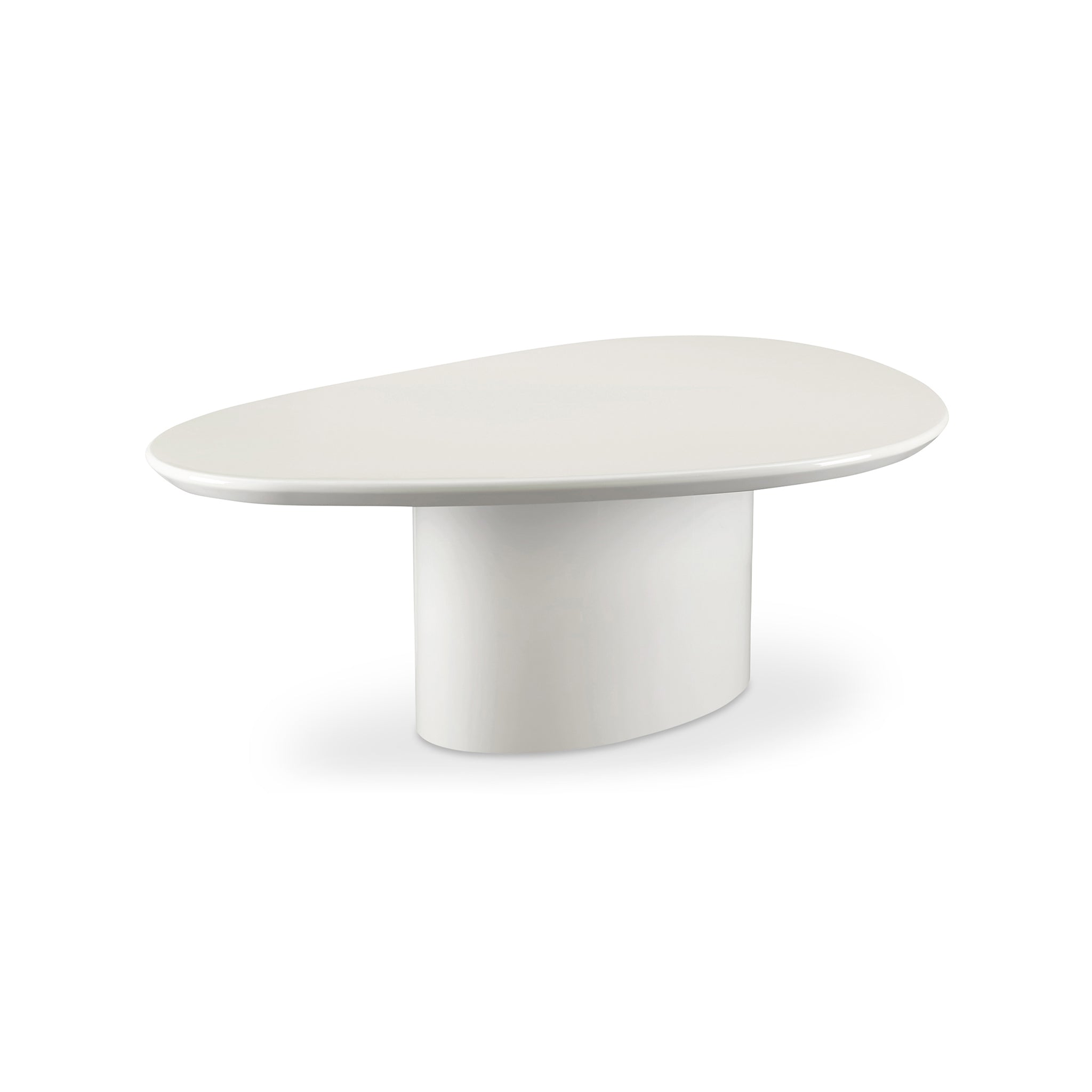 La table basse Lane présente une forme triangulaire arrondie et un piètement ovale, créant une silhouette sculpturale à la sophistication moderne. Sa surface, blanc ivoire et noir brillant, reflète la lumière et illumine l'espace.