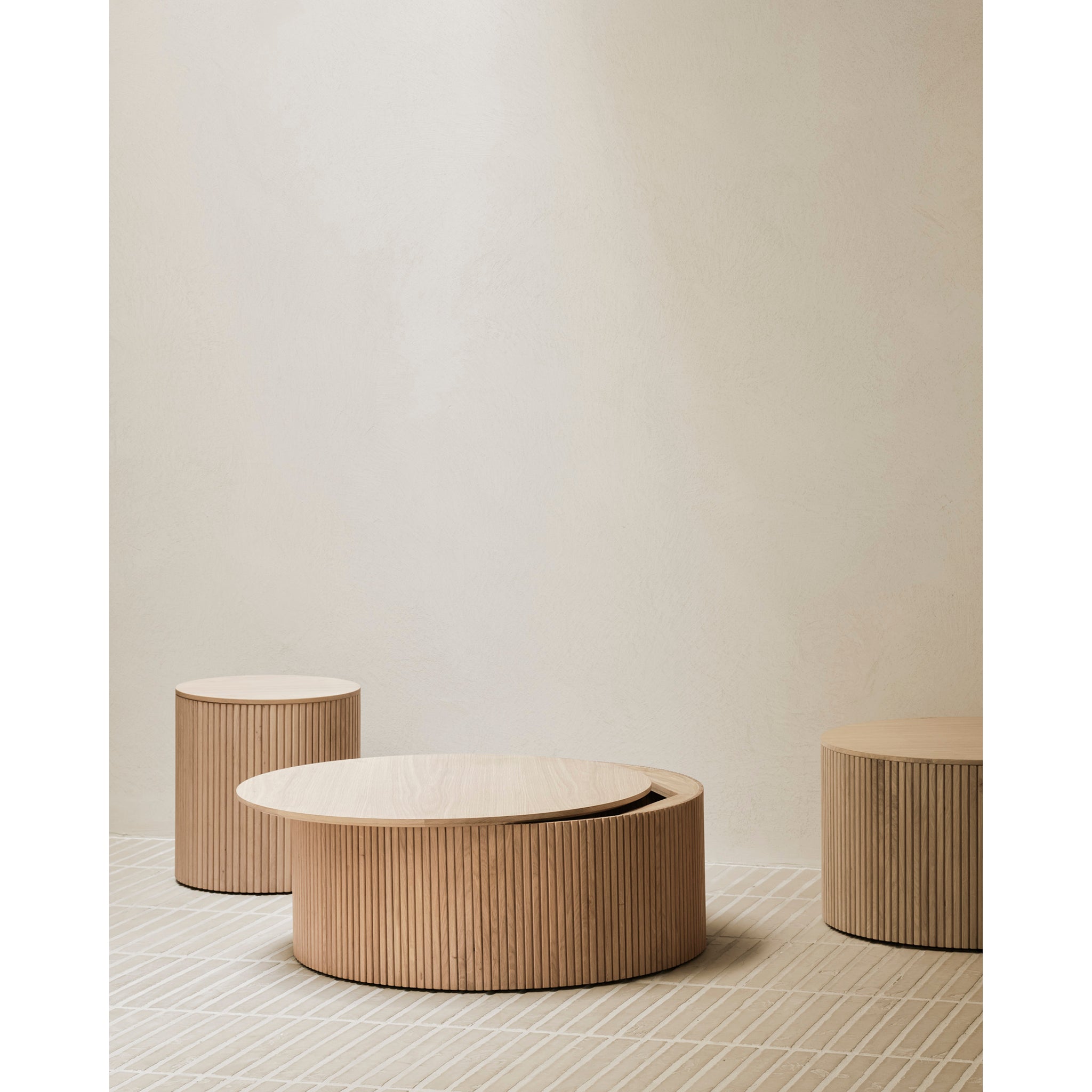 Conçu par Jacques Deneef, le Roller Max est un meuble multifonctionnel ingénieux qui combine table basse et rangement. Son plateau, dissimulé sous une structure en bois empilé, se retire facilement pour ranger journaux, jouets, coussins et plaids du quotidien. La solution idéale pour les petits espaces.