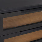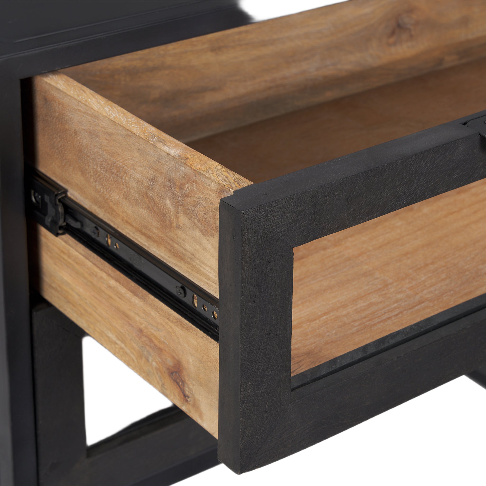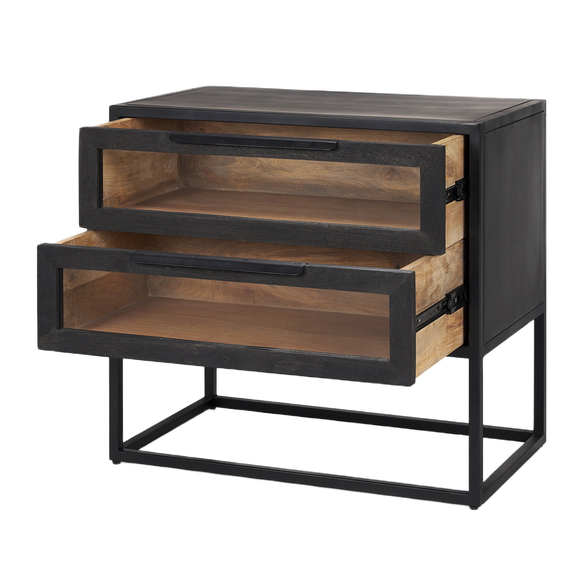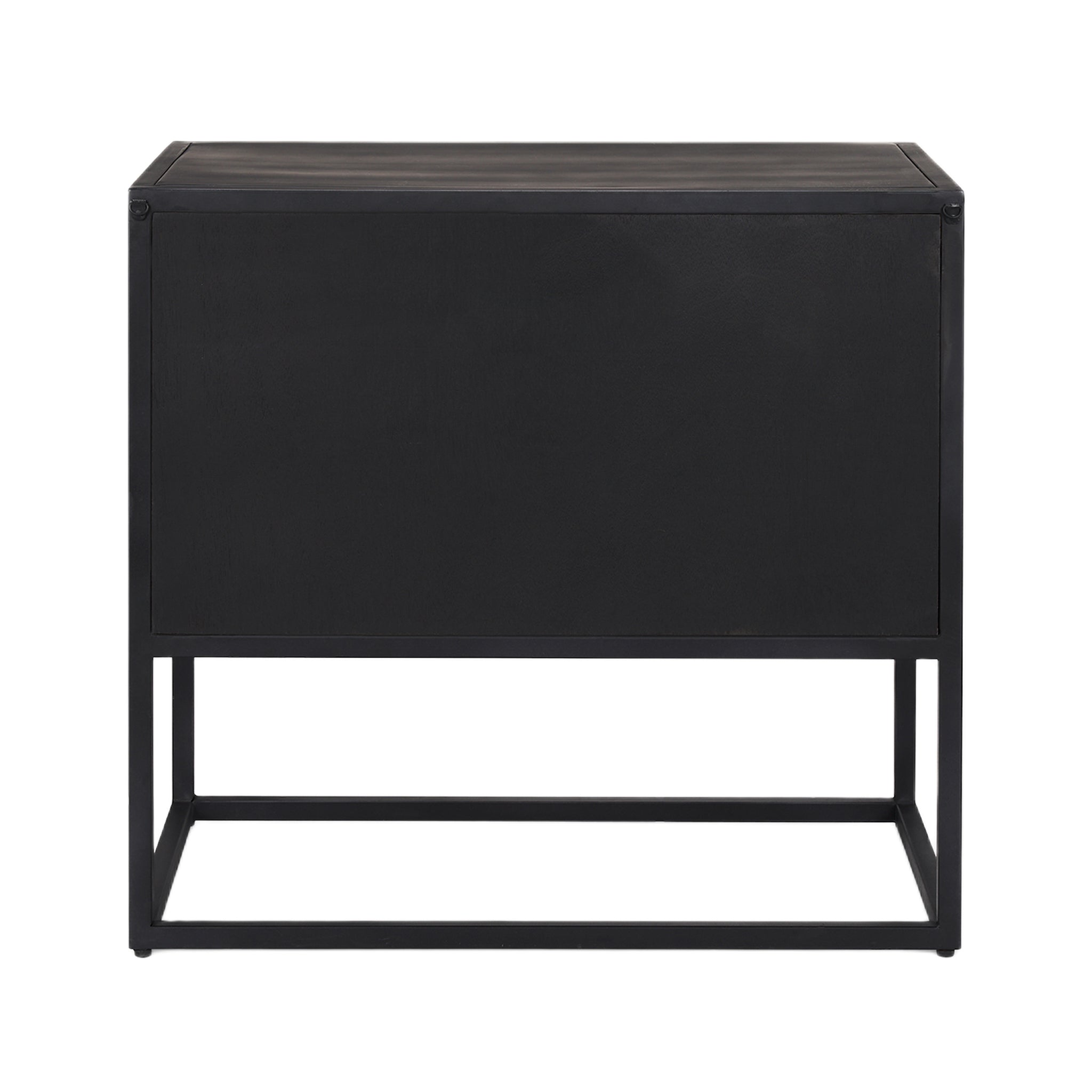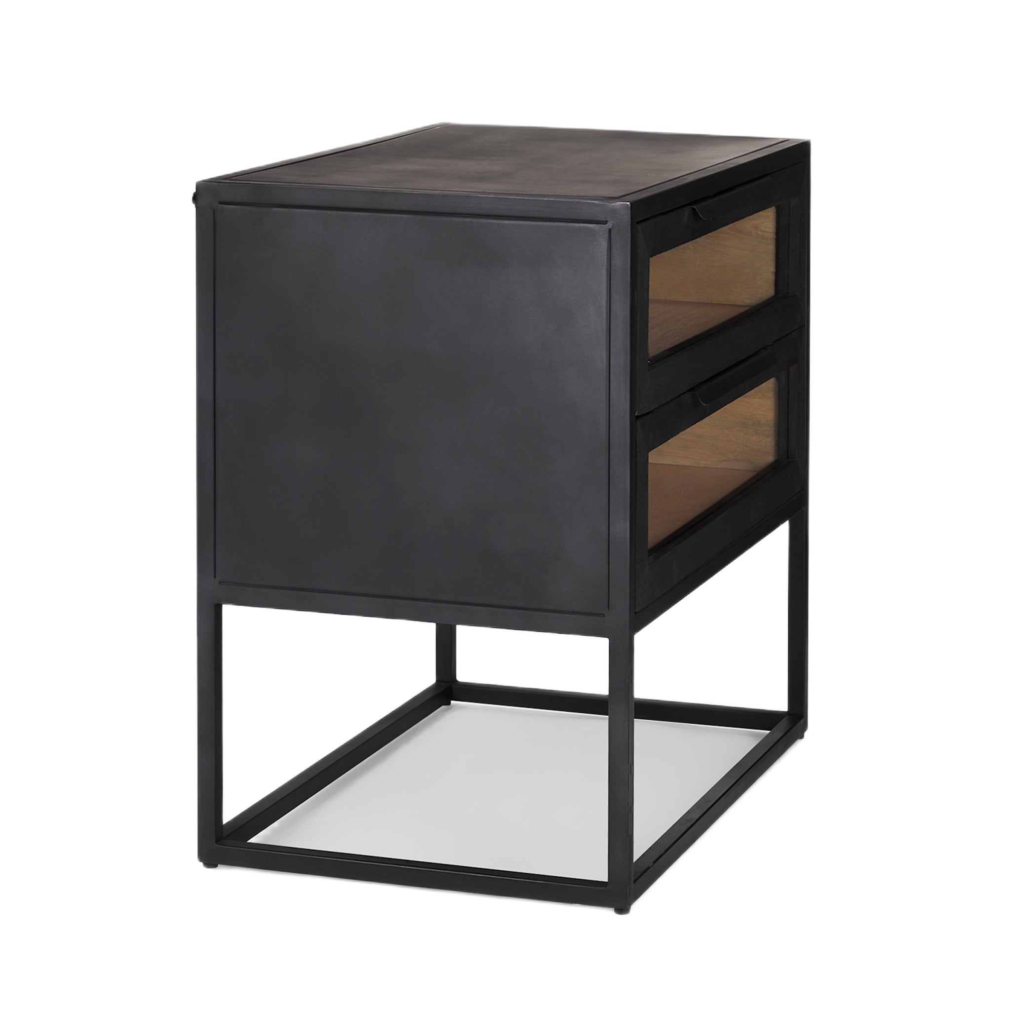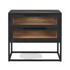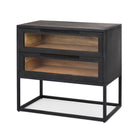 Une table d'appoint audacieuse et contemporaine qui affirme sa personnalité tant par son design massif que par le choix de trois matériaux : une structure et un piètement en fer, des portes et un intérieur en bois de manguier massif et des fenêtres en verre trempé.