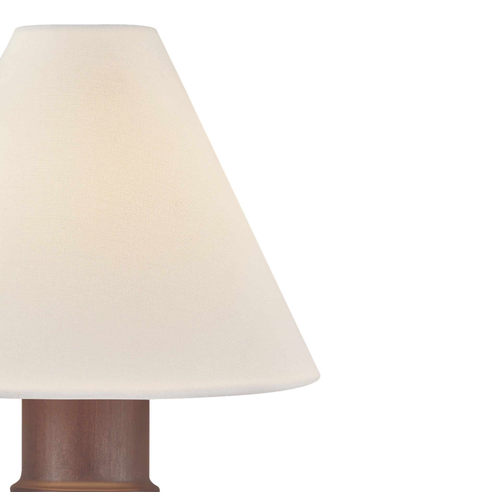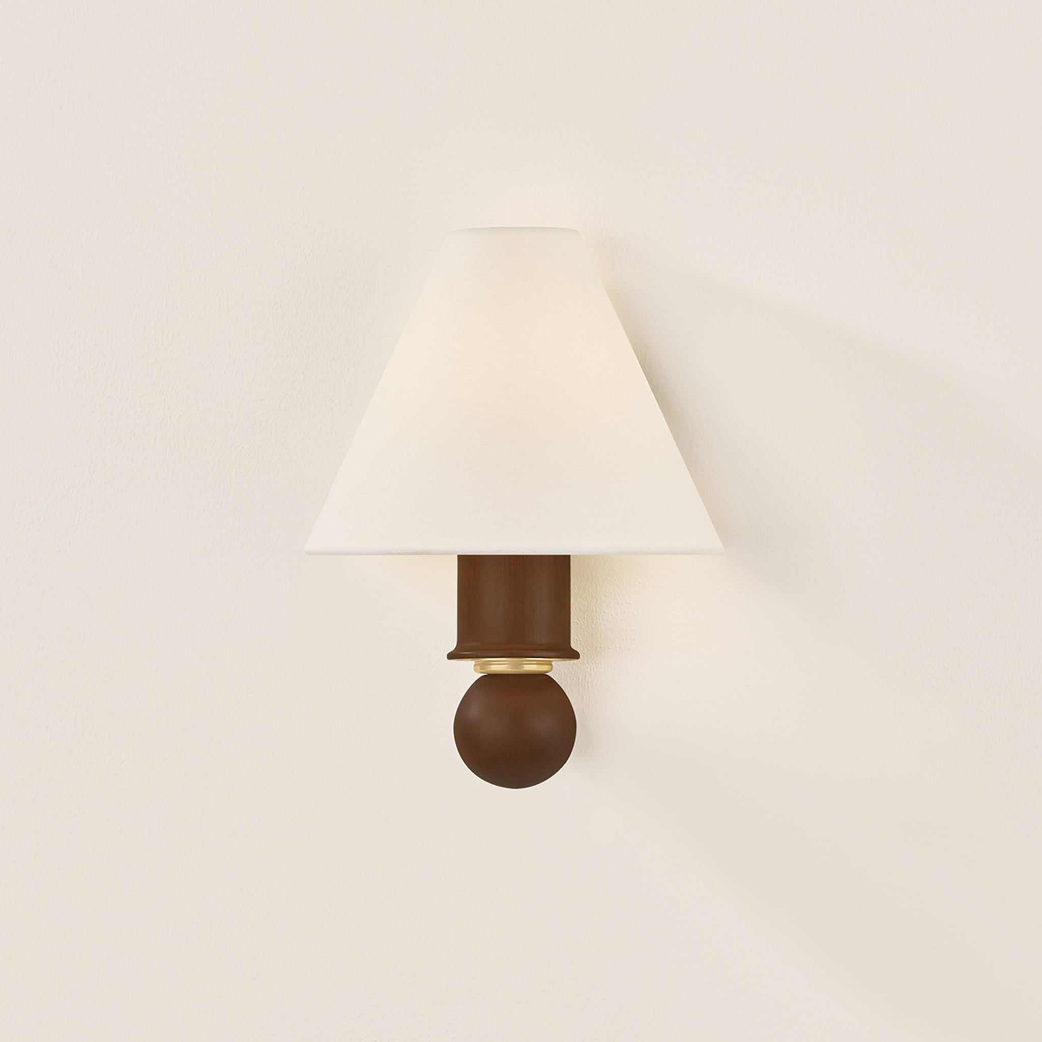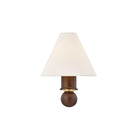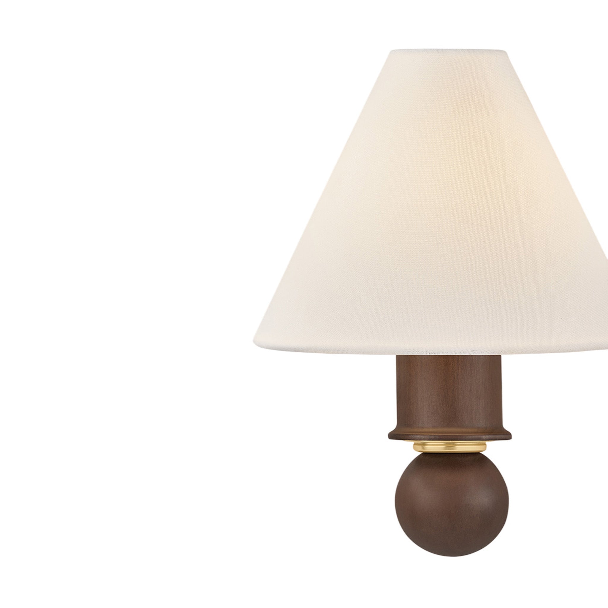 A petite sconce with a large presence, Candice pairs a distinctive turned wood stem with a white linen half-shade. The polished wood evokes a sense of heritage and craftsmanship, enhanced by the decorative shaping. An Aged Brass reflector beneath the shade creates a soft, warm glow, adding to Candice's antique-inspired charm.