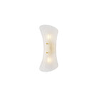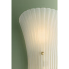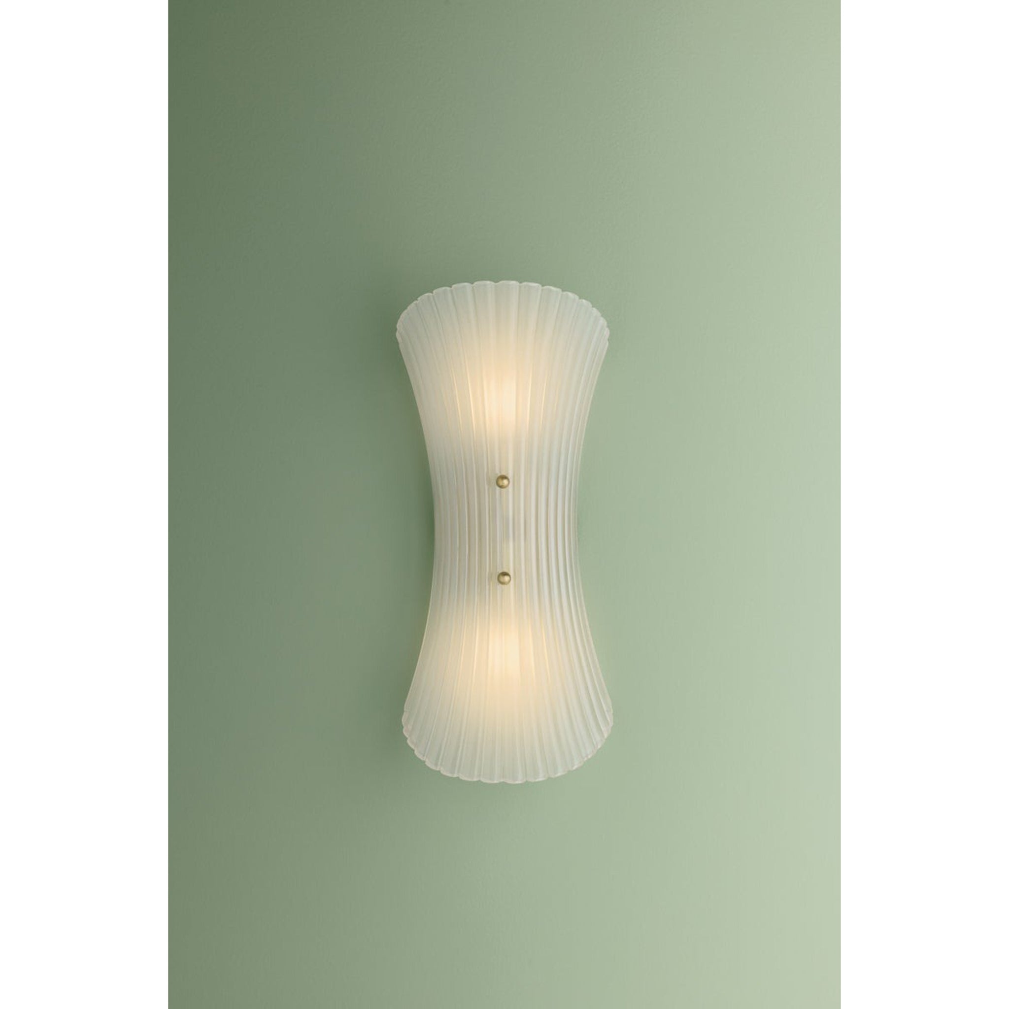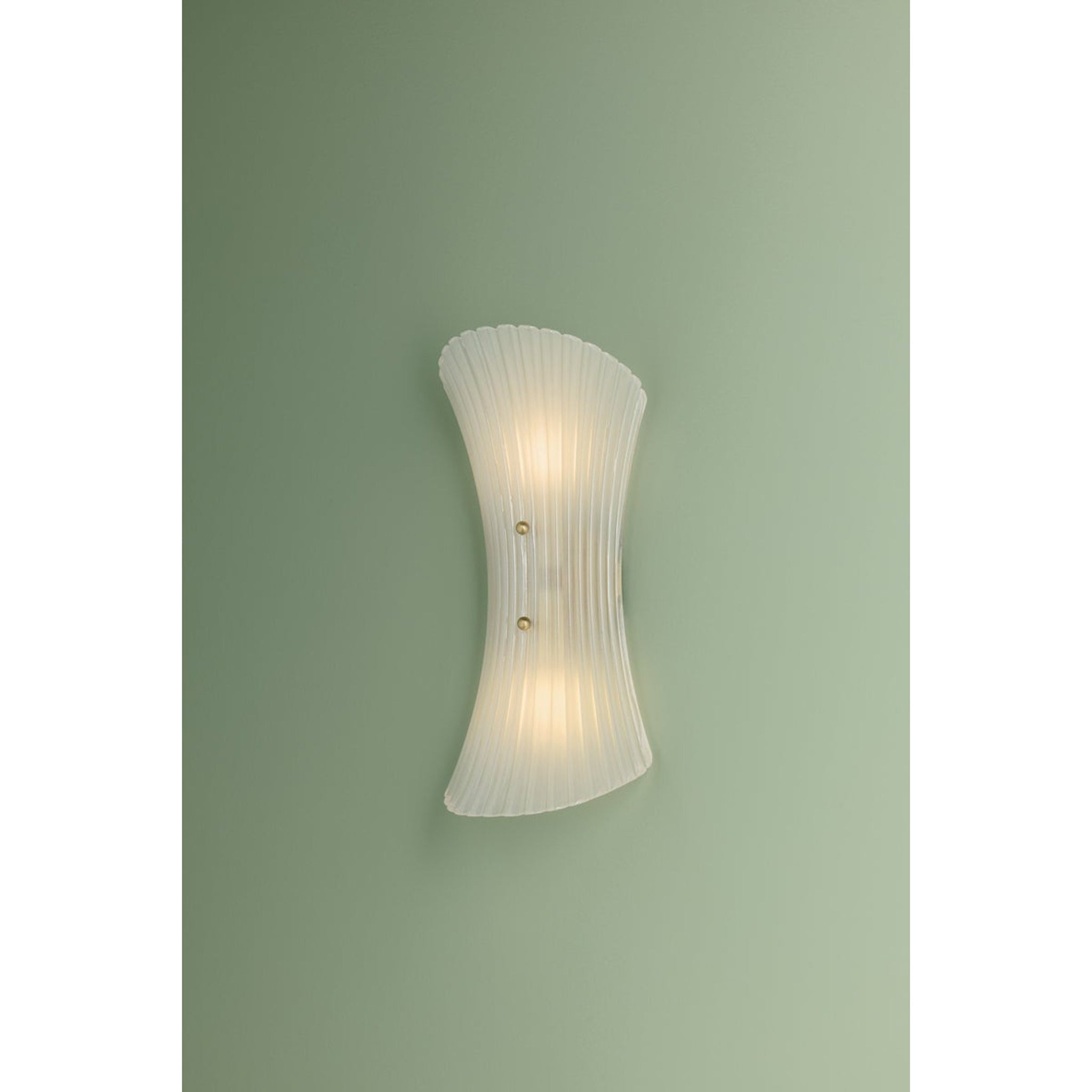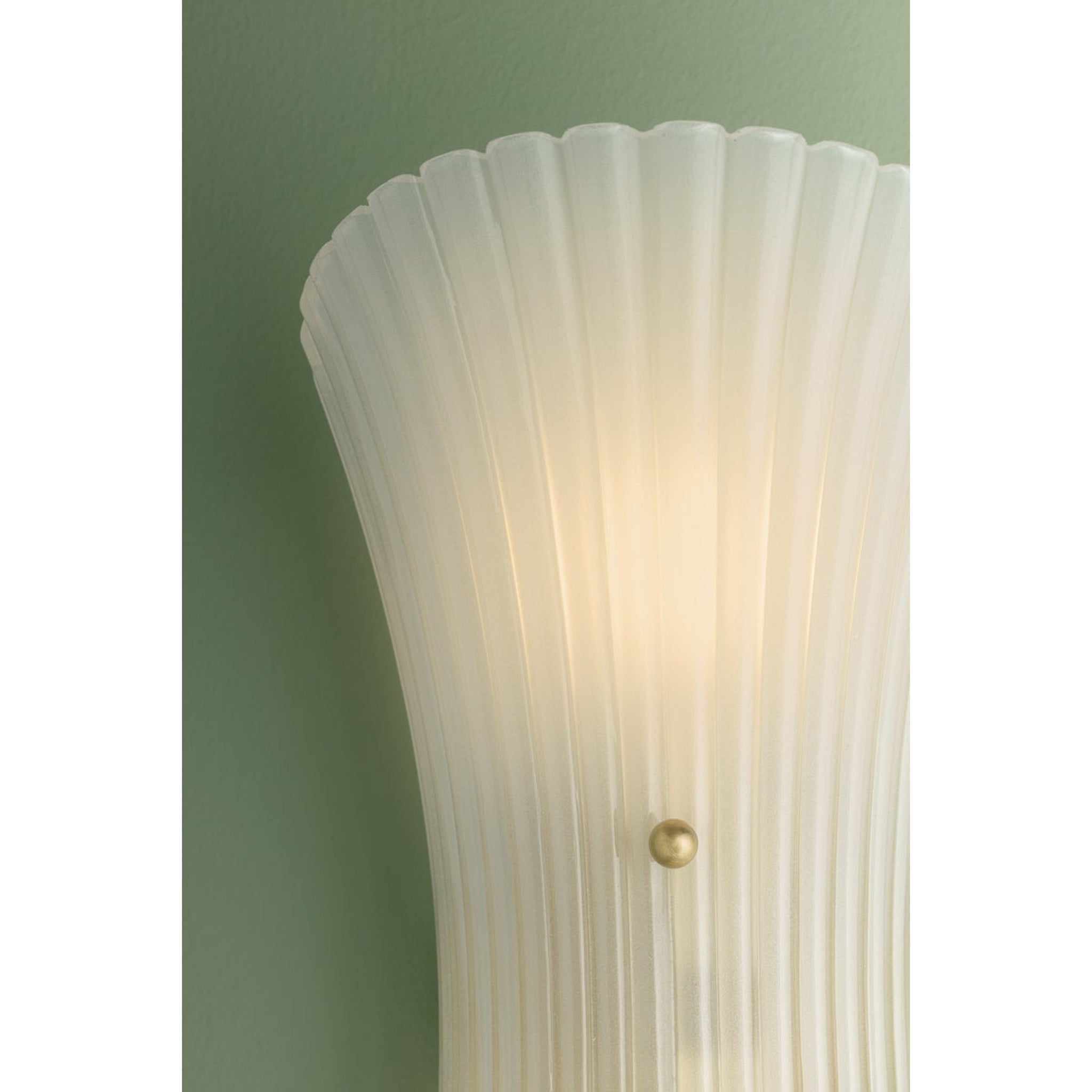 In the vein of mid-century Murano sconces, Esmae's shell-shaped silhouette is a thing of beauty. The etched clear glass shade features fine-resolution ribbing that runs parallel to the form, curving inwards at the center. Two small spherical thumbscrews provide a glimpse of the Aged Brass hardware while keeping the focus on the translucent glass.