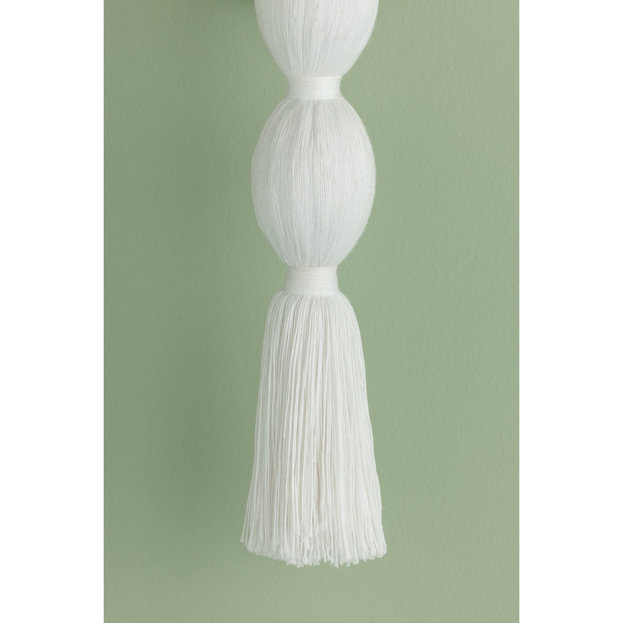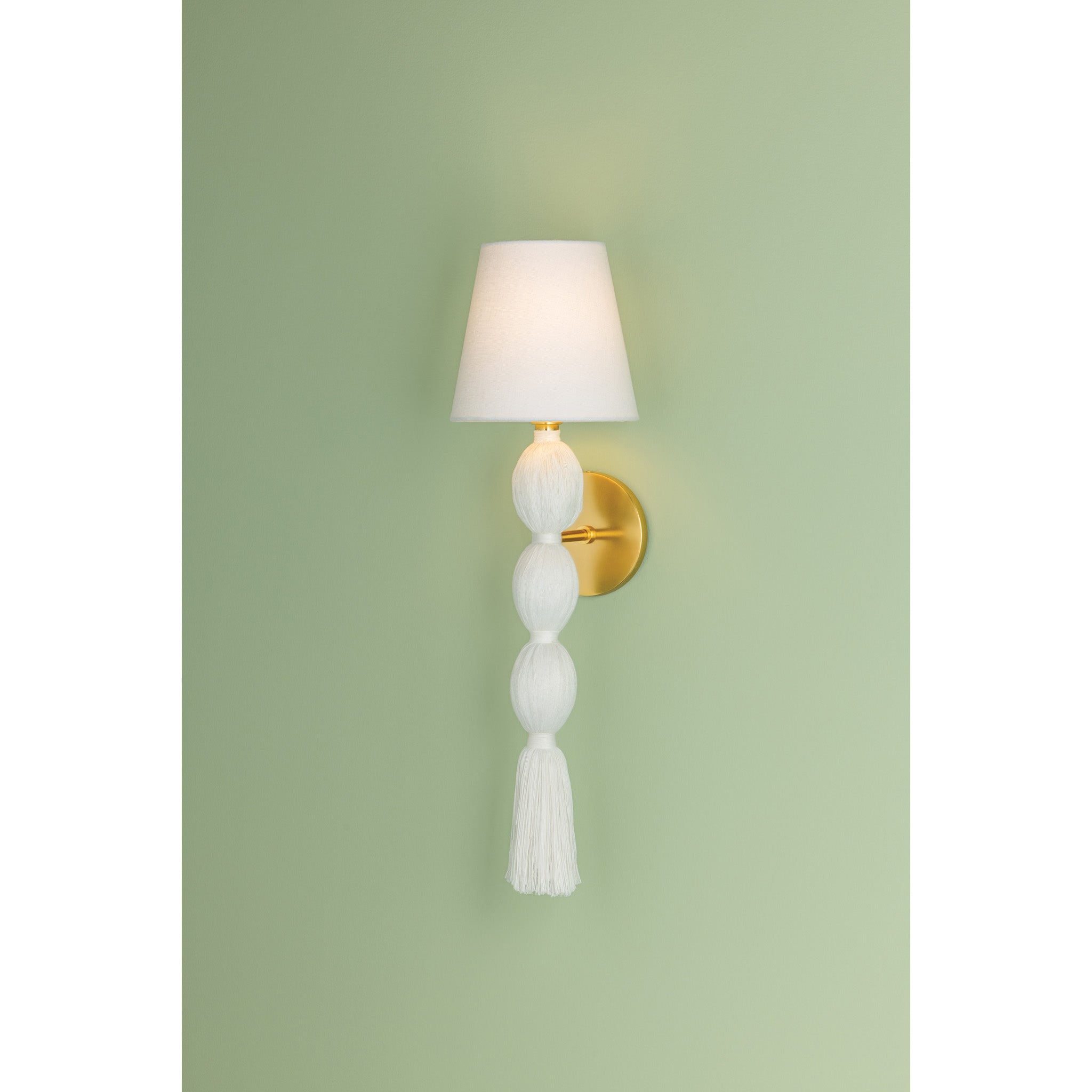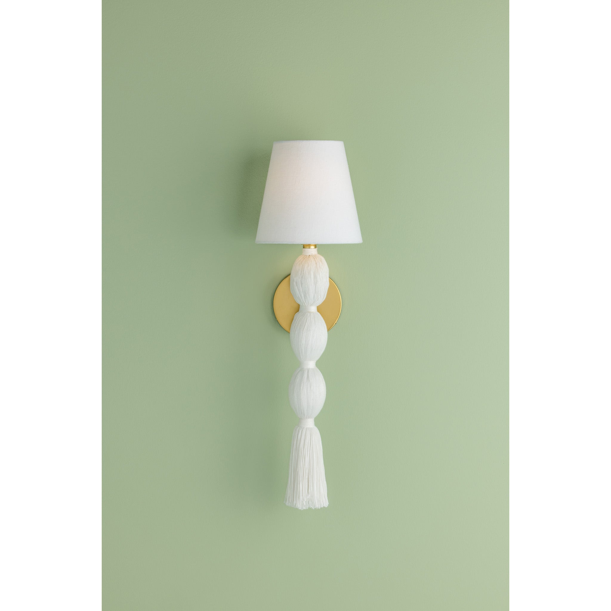 A celebration of authentic handicraft, the cinched silhouette of Indra resembles an elongated tassel. The cotton string and white linen shade create an all-over light, fresh appearance, accented by Aged Brass hardware at the neck. This single-light sconce serves as an artistic piece for small spaces in need of a spruce.