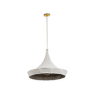 Leveraging the natural draping of its hand-knitted cotton materiality, the Isola pendant balances dramatic proportions with graceful design lines. The handknit weave forms of a trumpet shape reminiscent of a flower in bloom. As a warm glow fills the silhouette, light shimmers through the gaps in the weave. Isola is available in two sizes with an Aged Brass finish.