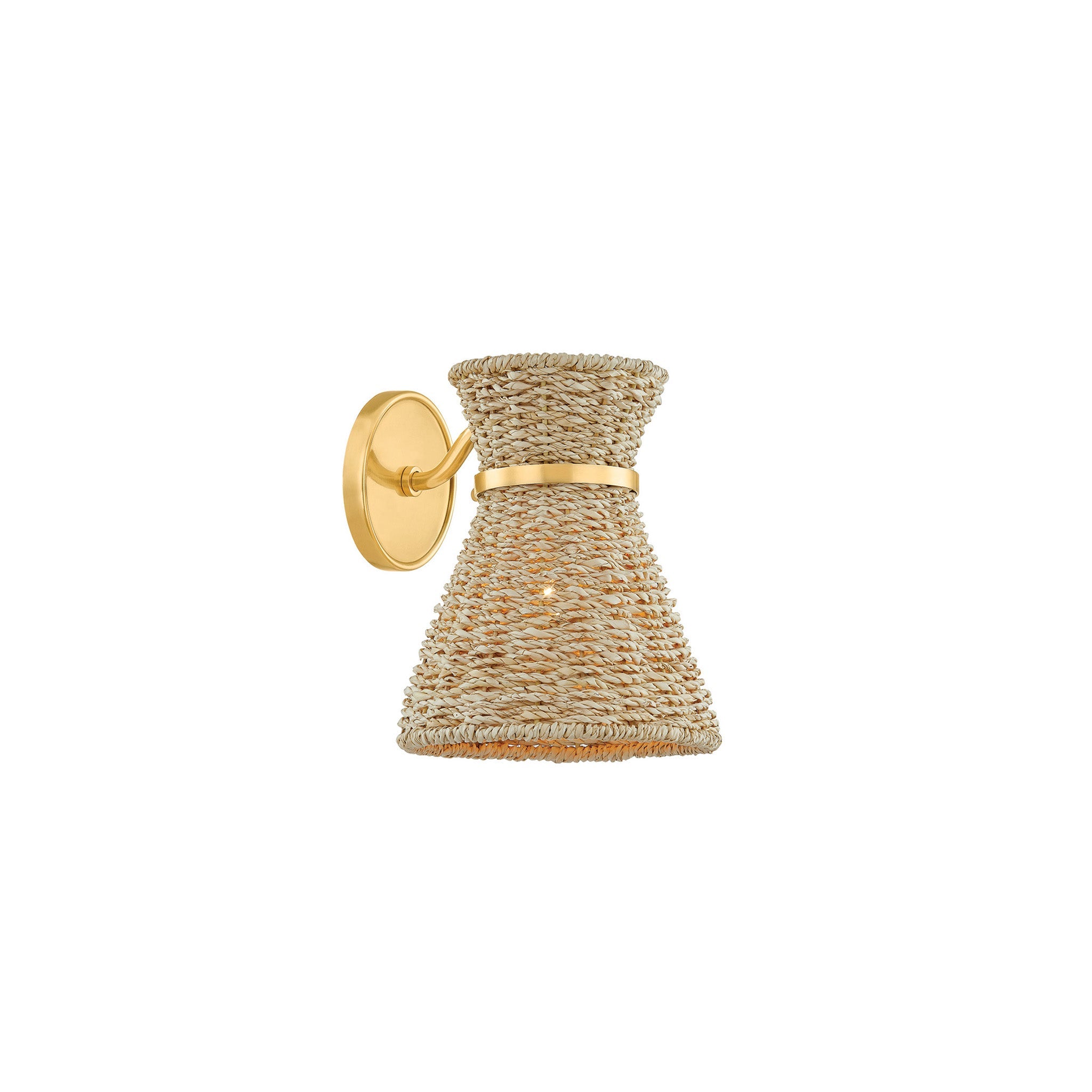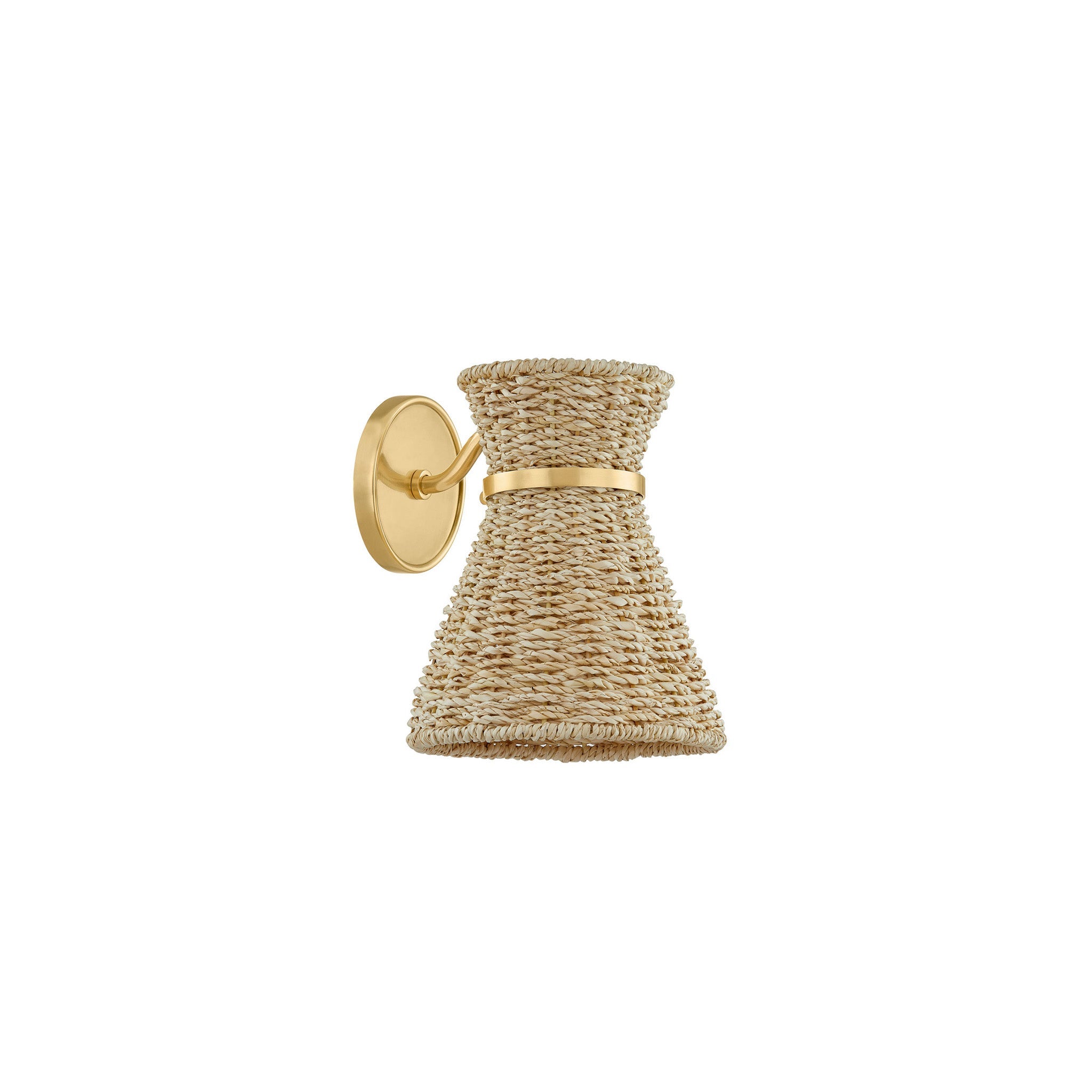 Juxtaposing natural seagrass with metal, the Jamie sconce brings a fresh dose of style to any wall. The shade has been handwoven, giving it the look and charm of traditional basketry. An Aged Brass arm wraps the top of the shade, creating a waist-like cinch that adds interest to Jamie's simplistic silhouette.