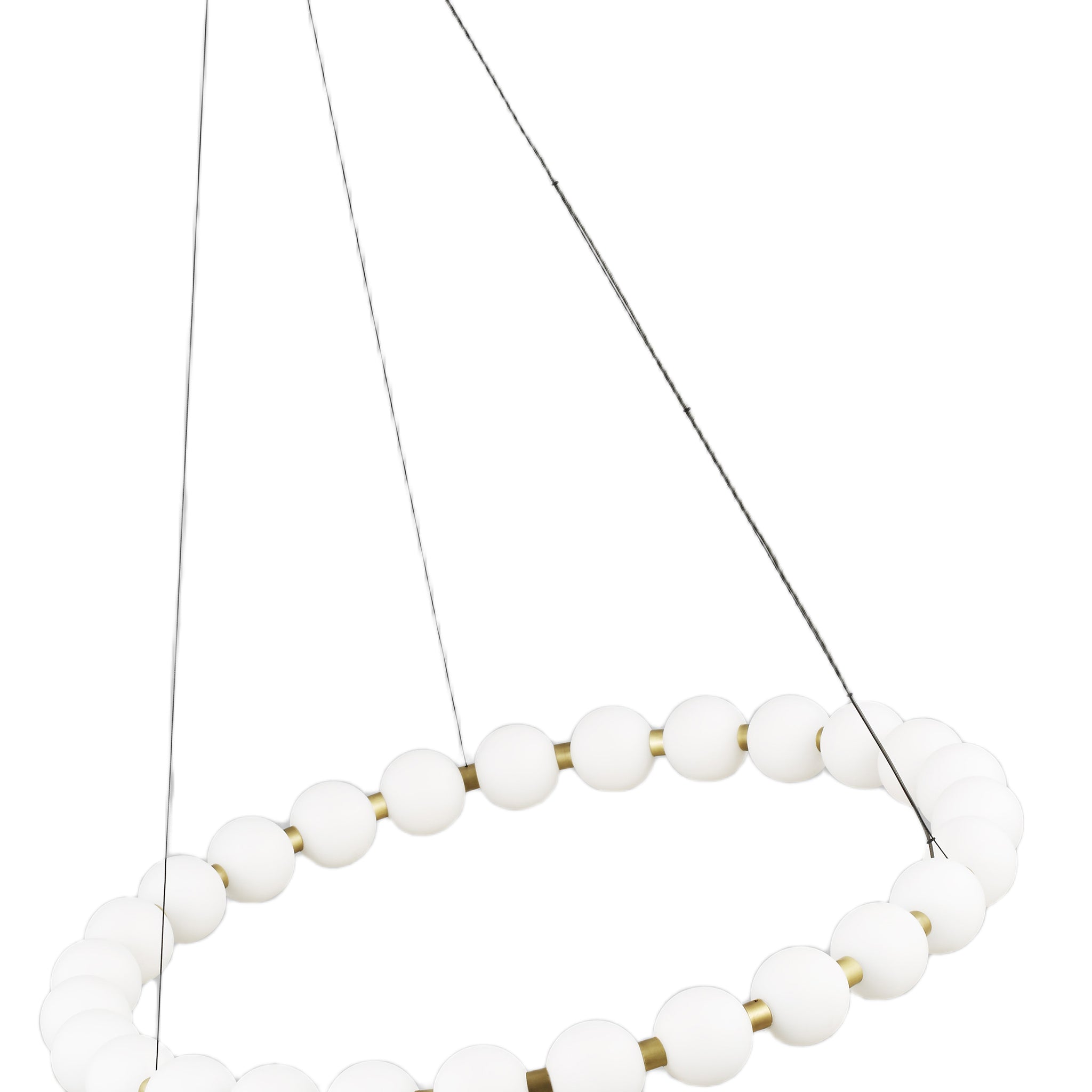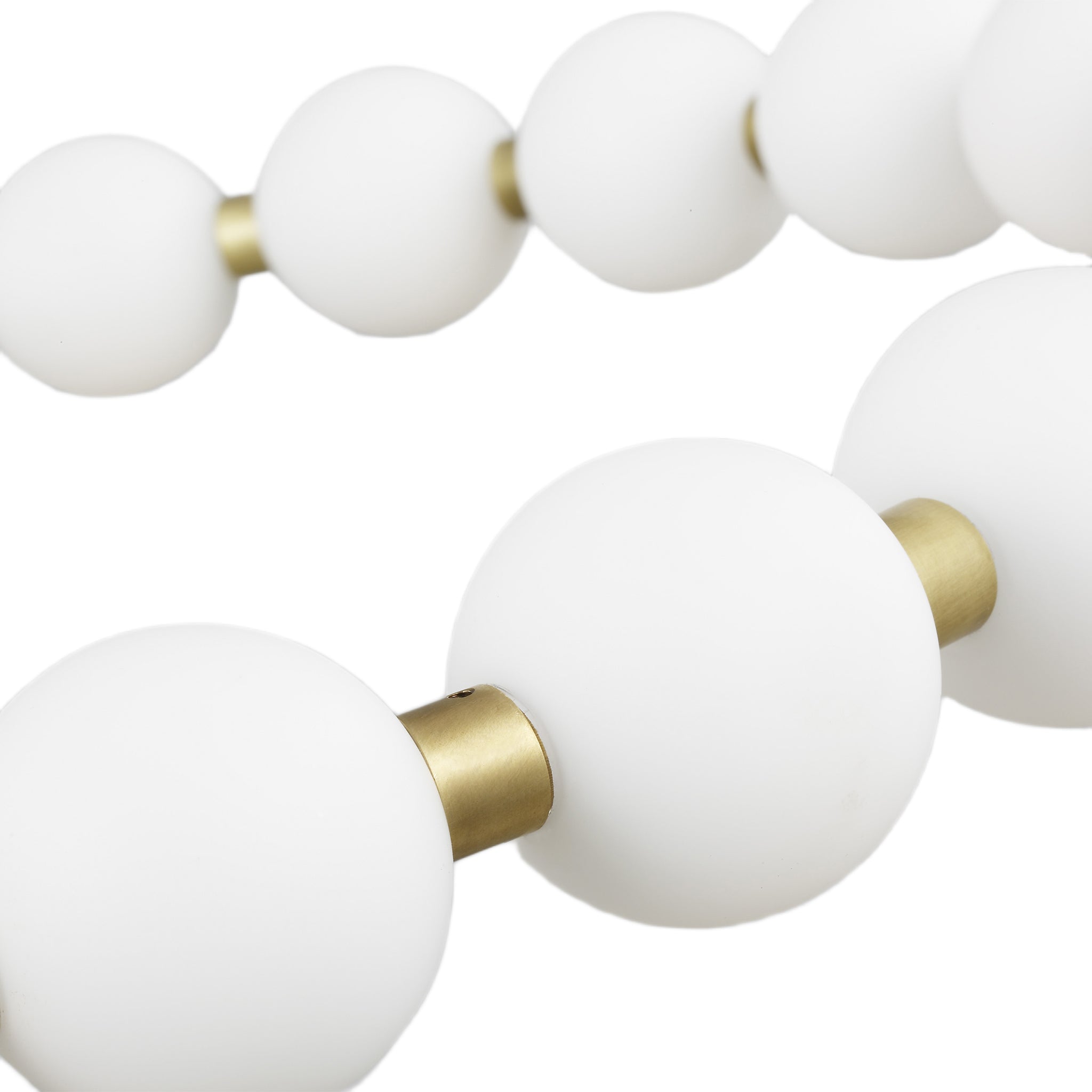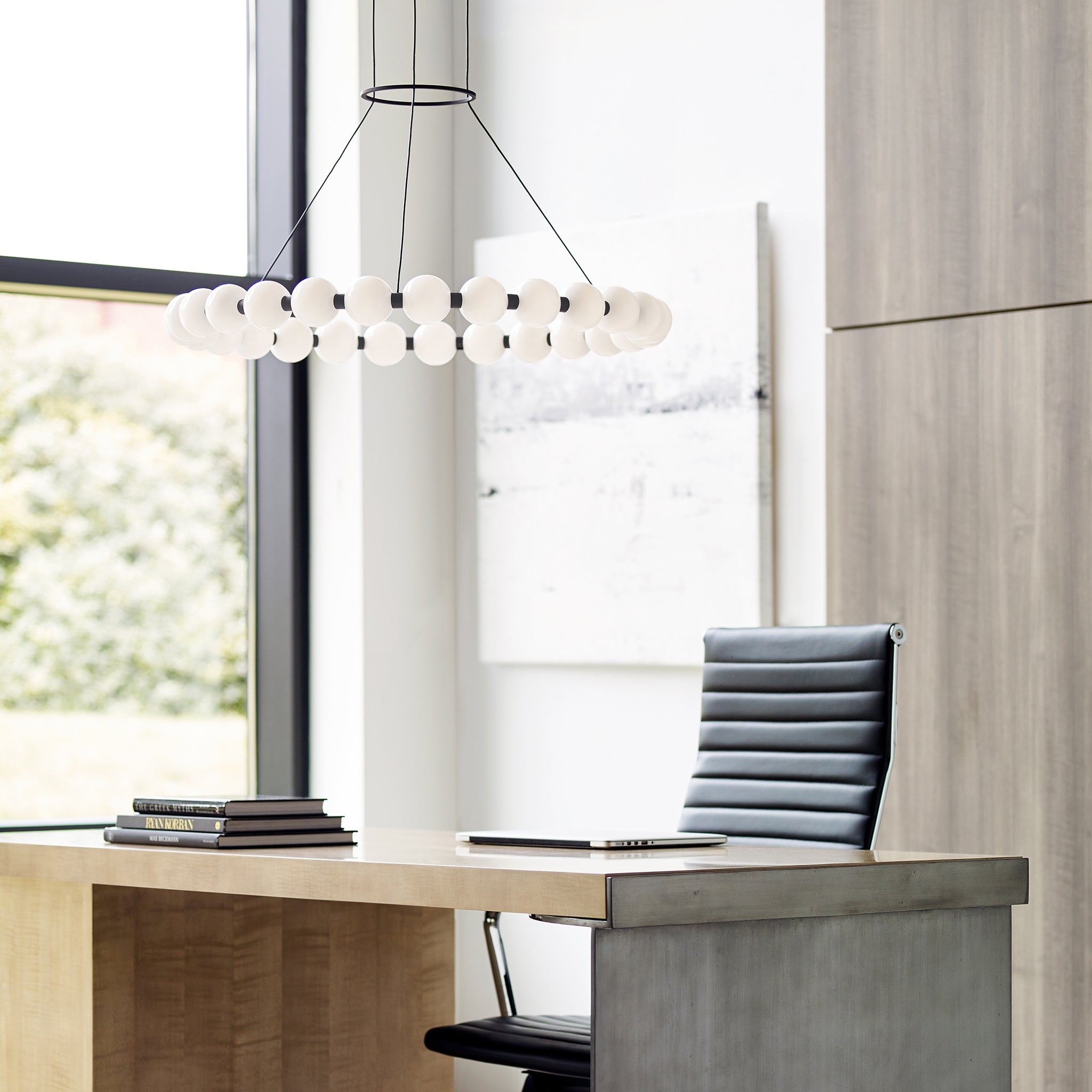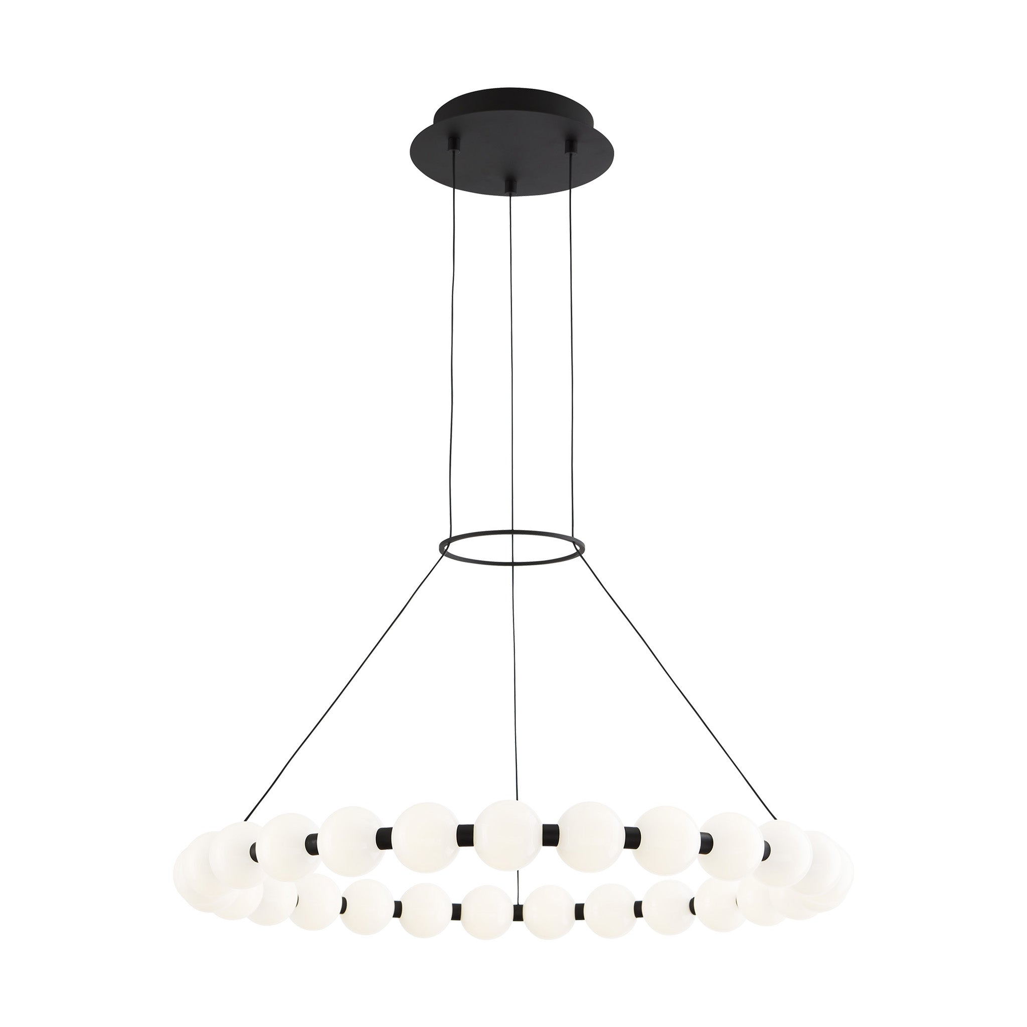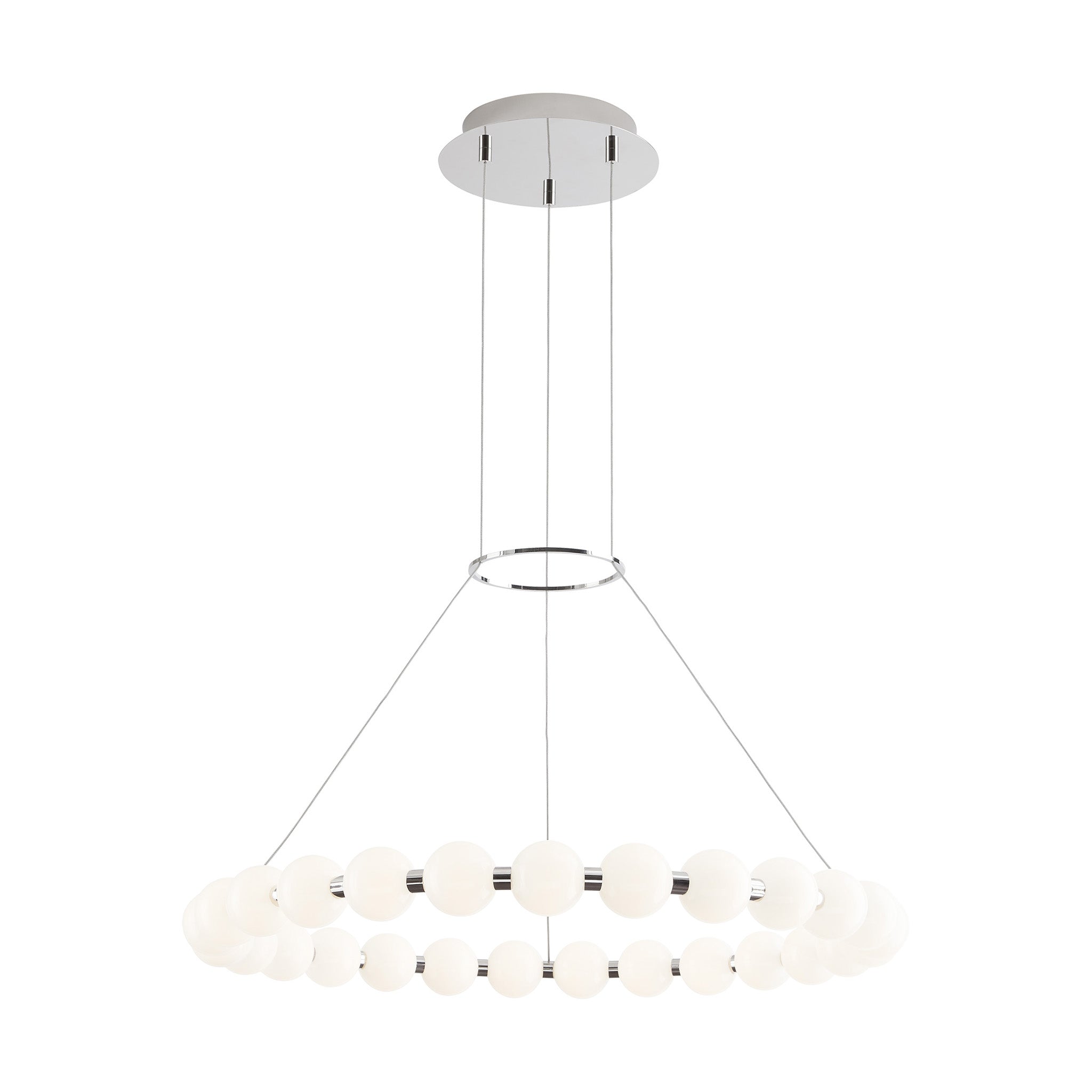 The Orbet 30 Chandelier by Sean Lavin is a modern upgrade to the classic ring design. Milk-glass orbs provide a soft diffused aesthetic for the integrated LEDs and are accented with metal spacers for a touch of contrast. This fixture is the perfect design for dining room, foyers, hospitality and more.