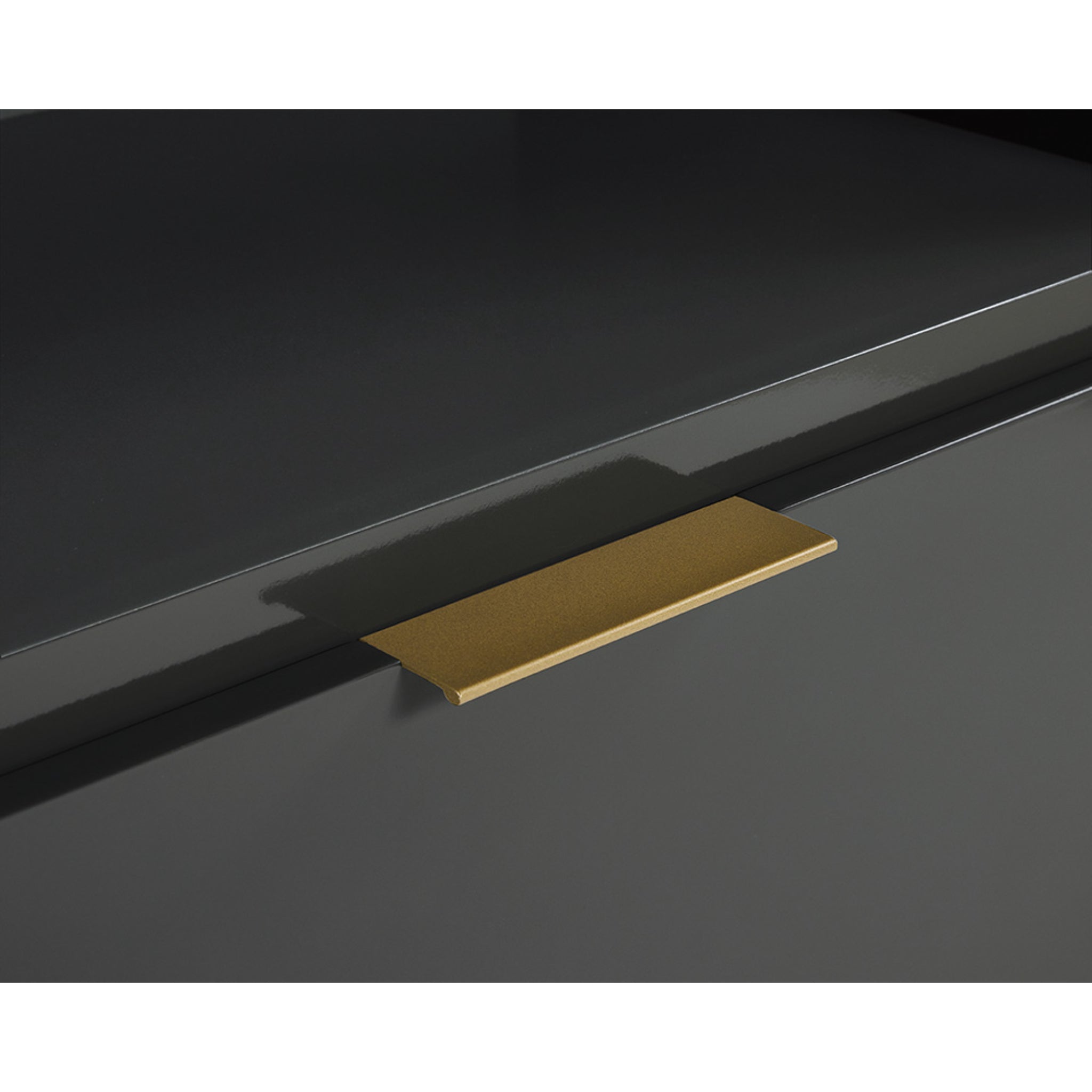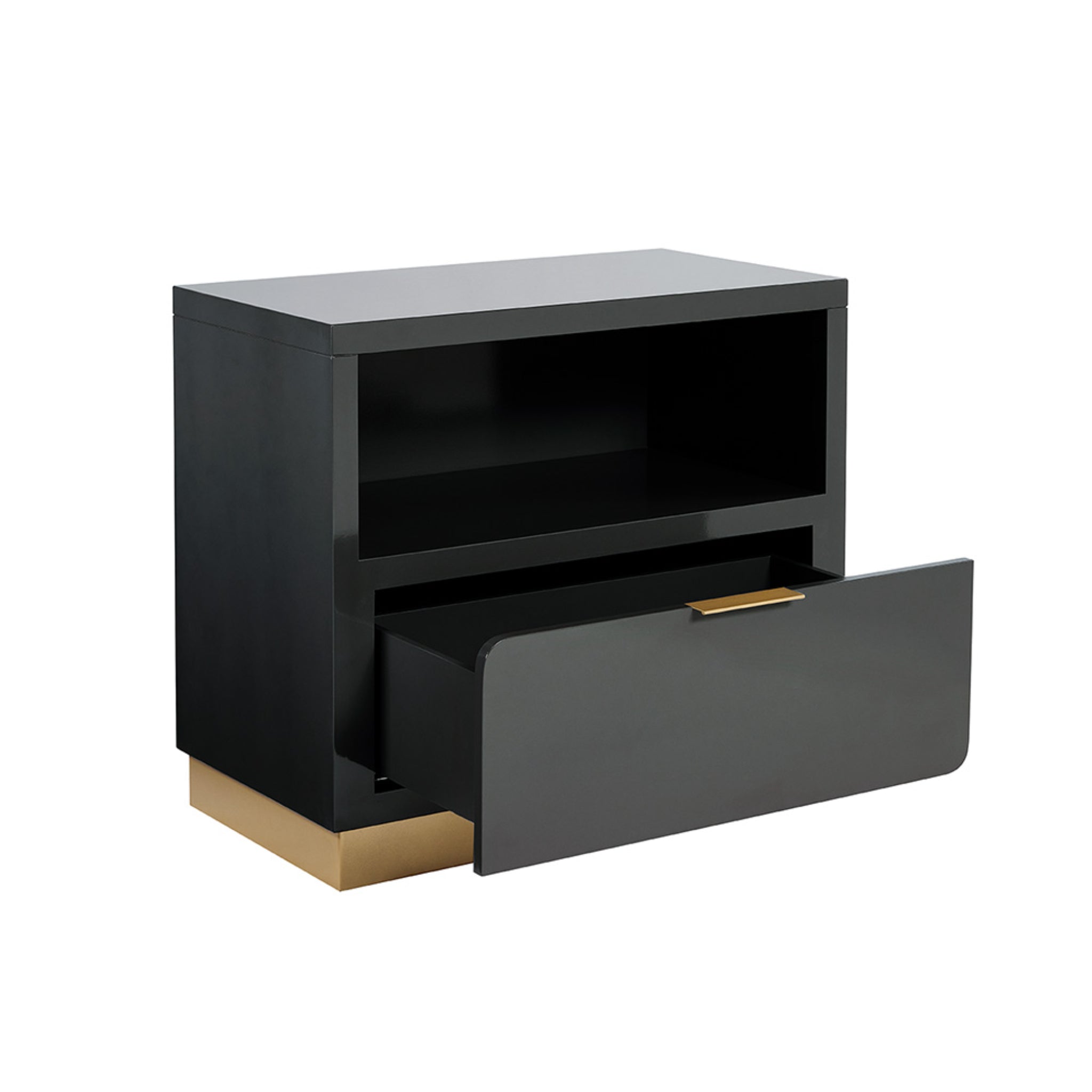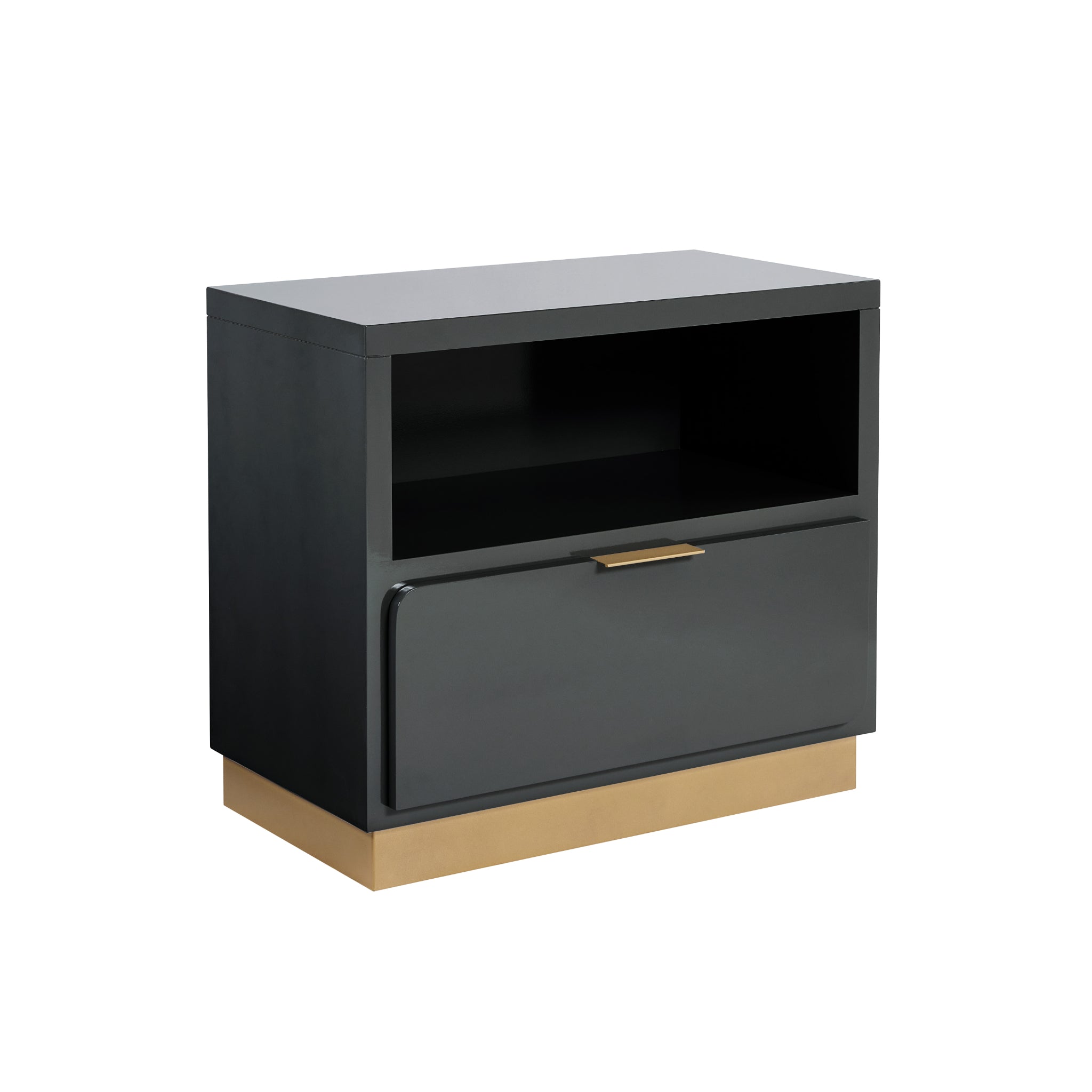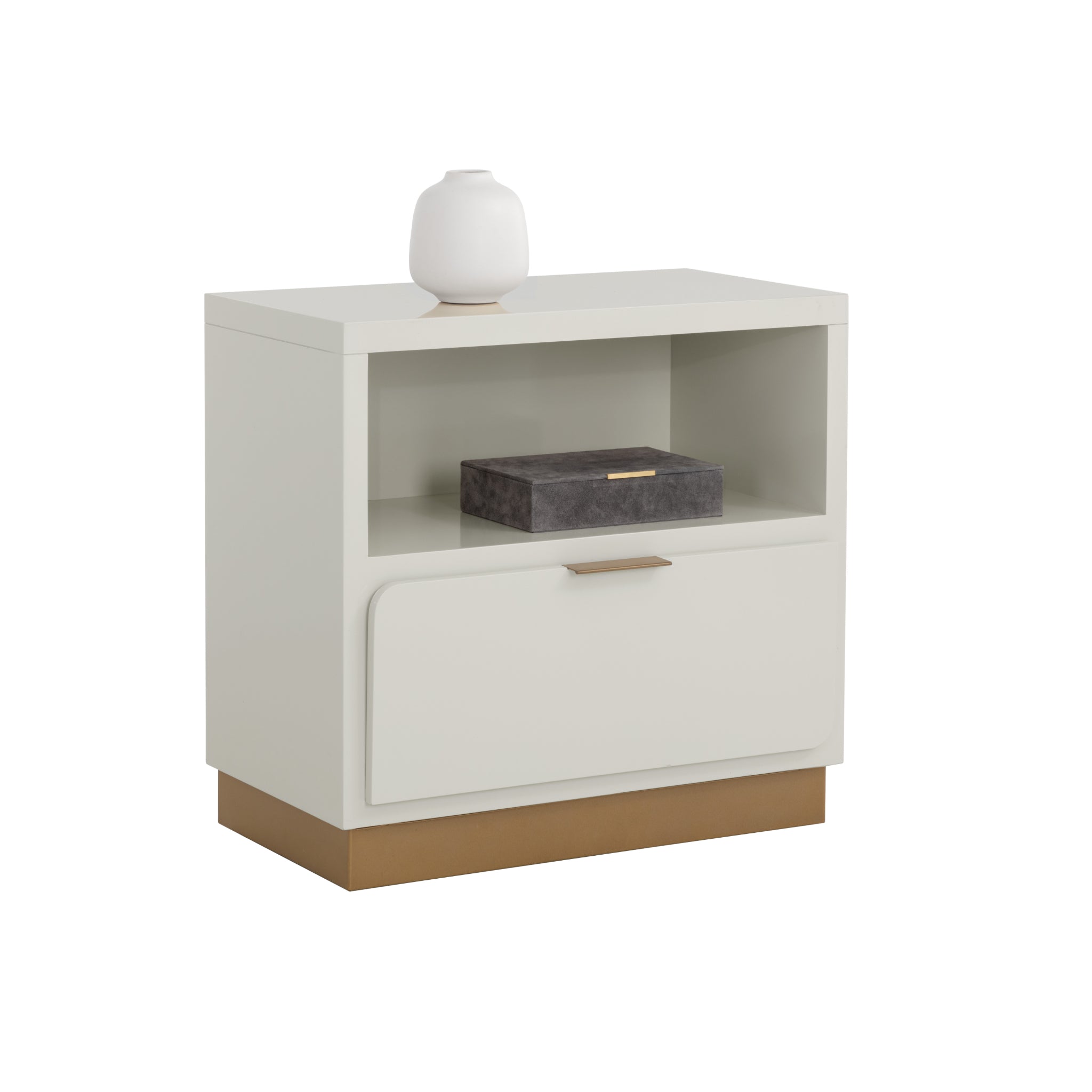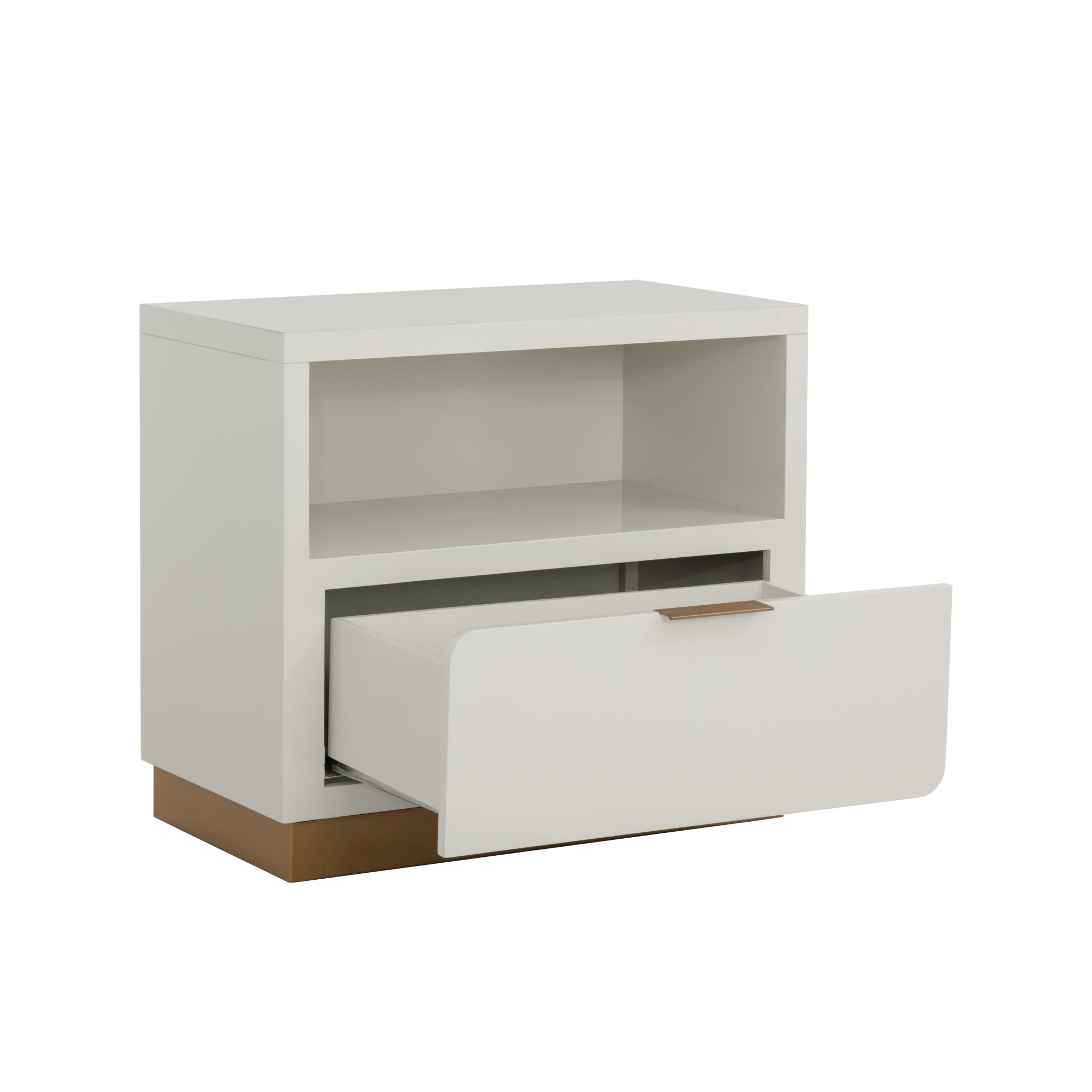Créez une chambre à coucher empreinte de luxe avec cette table de chevet contemporaine au design minimaliste et épuré. Fabriquée en bois de peuplier massif, elle est disponible en finitions laquées gris brillant et crème. Elle est dotée d'un tiroir et de poignées en acier bronze rustique.