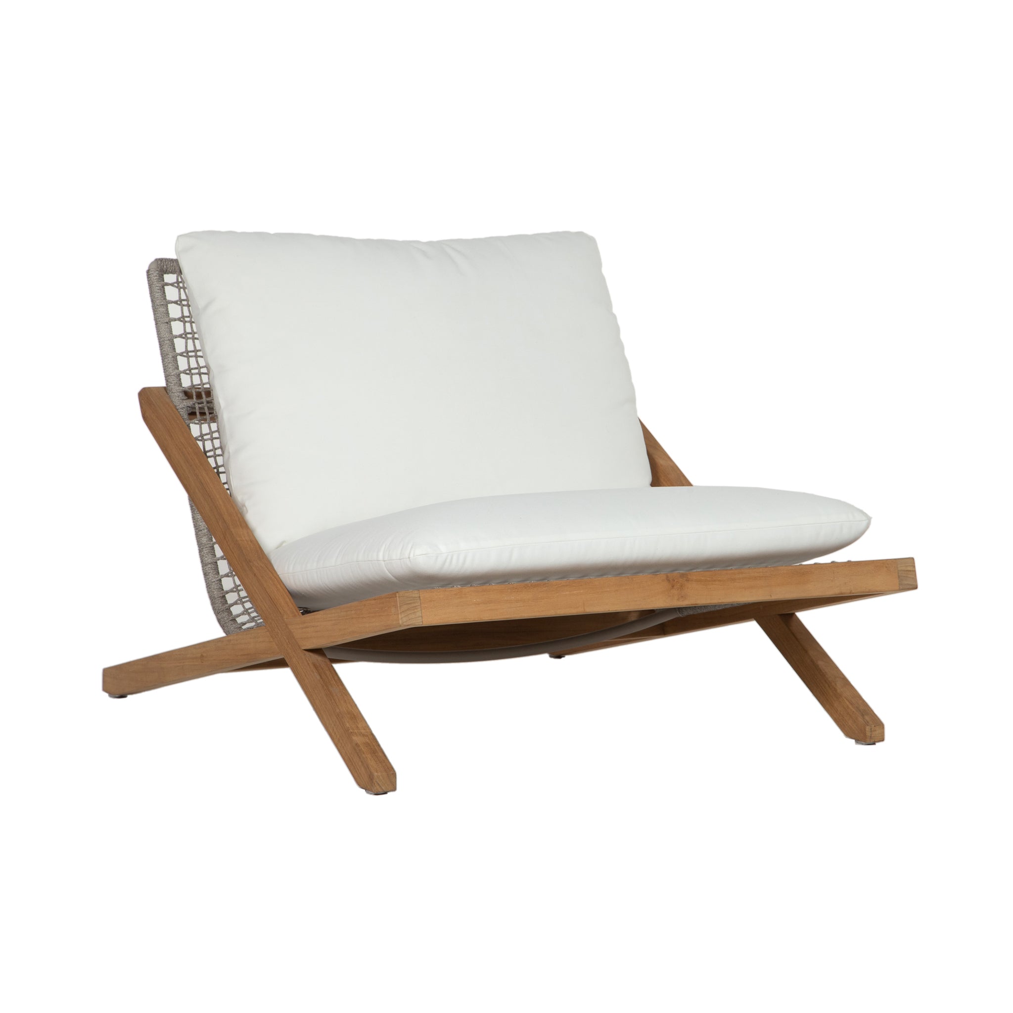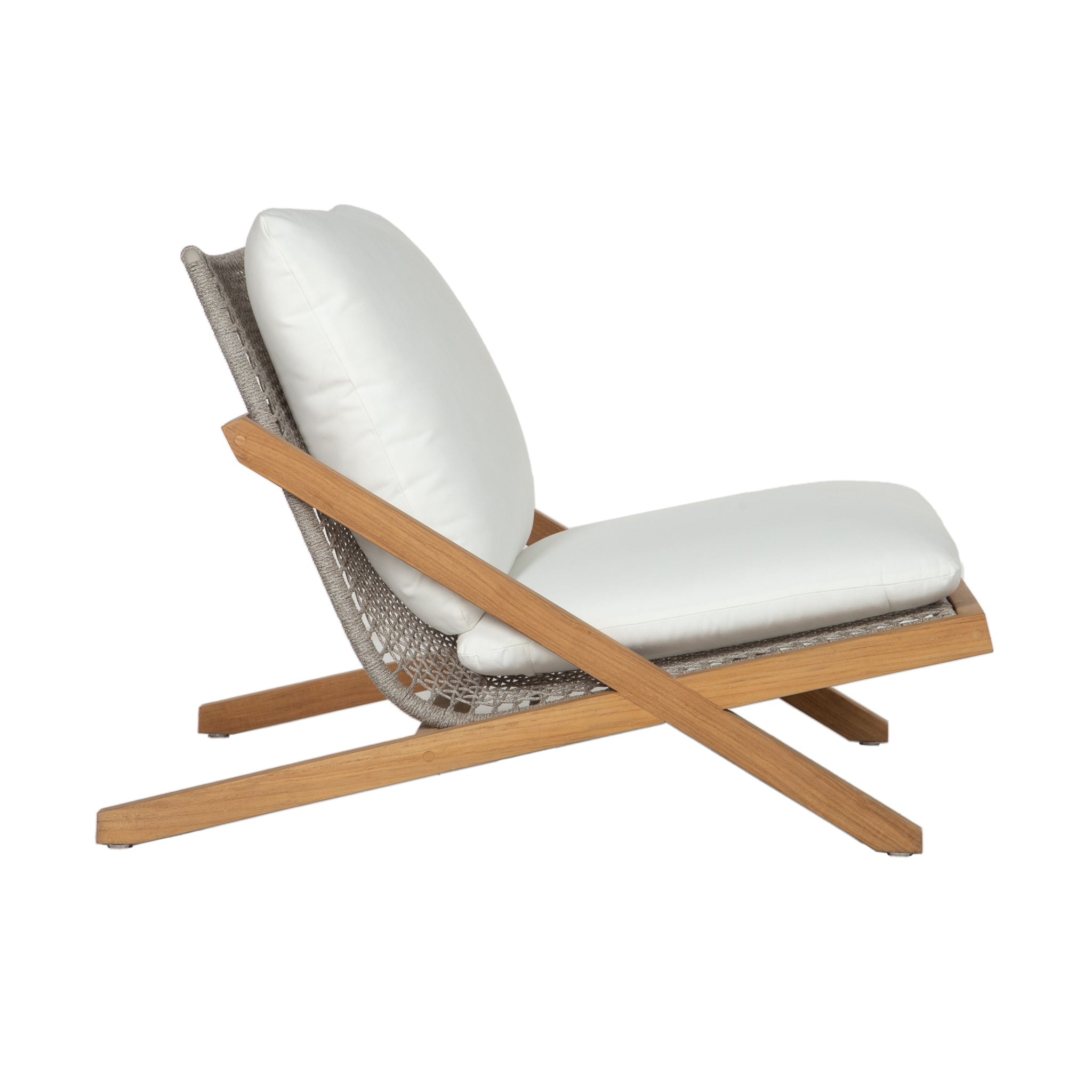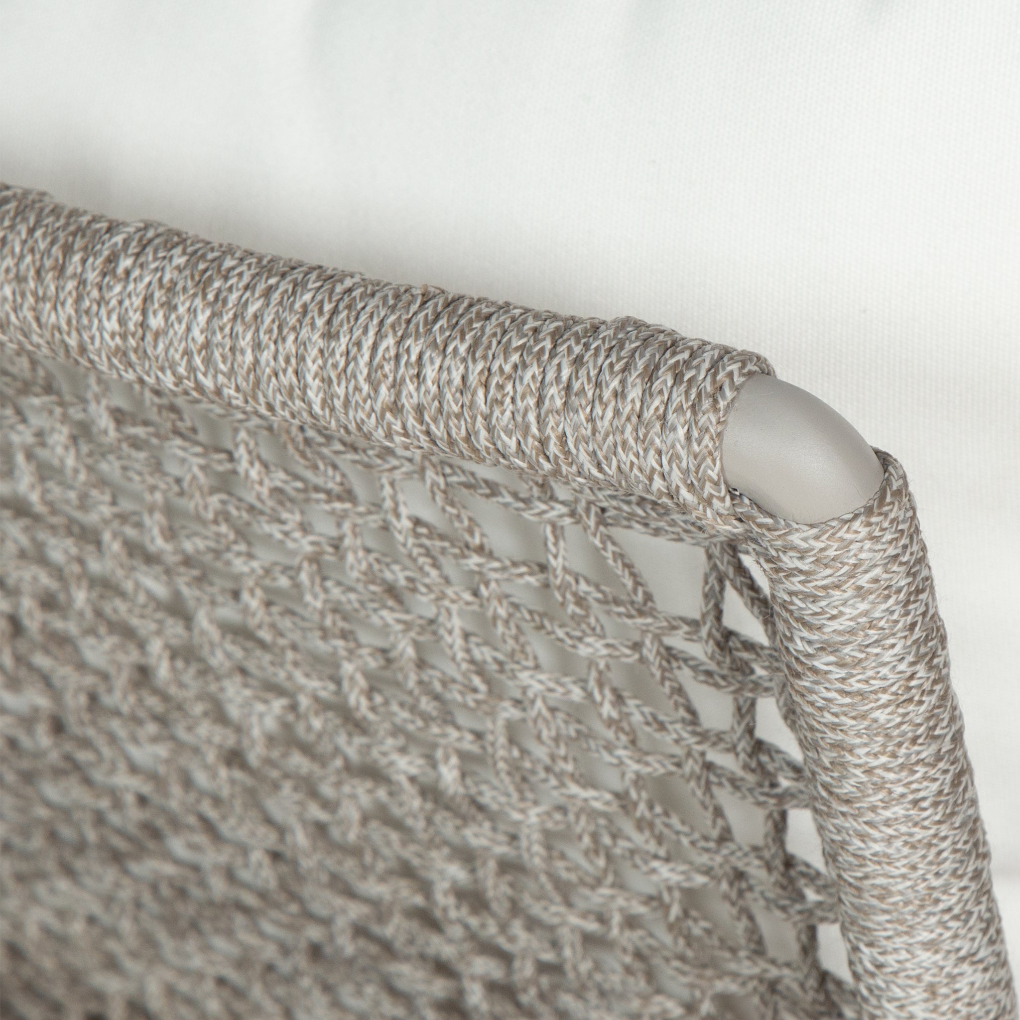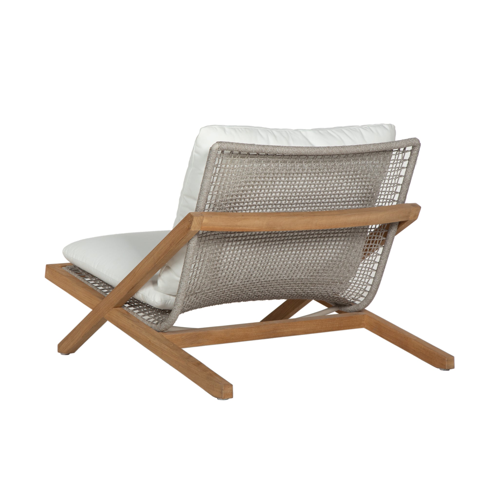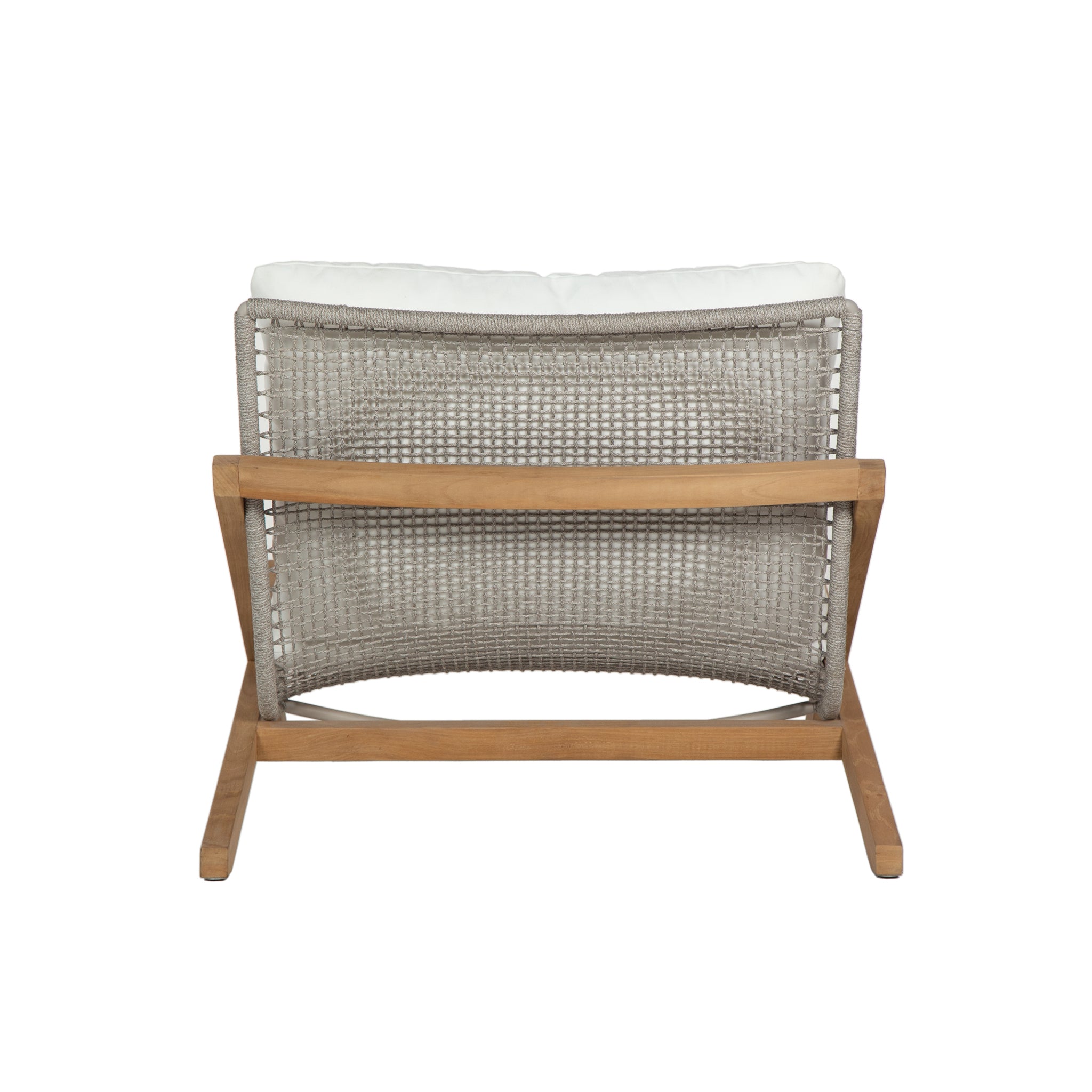 Matériaux : Bois de teck massif, aluminium thermolaqué, tressage gris sur cadre en aluminium taupe