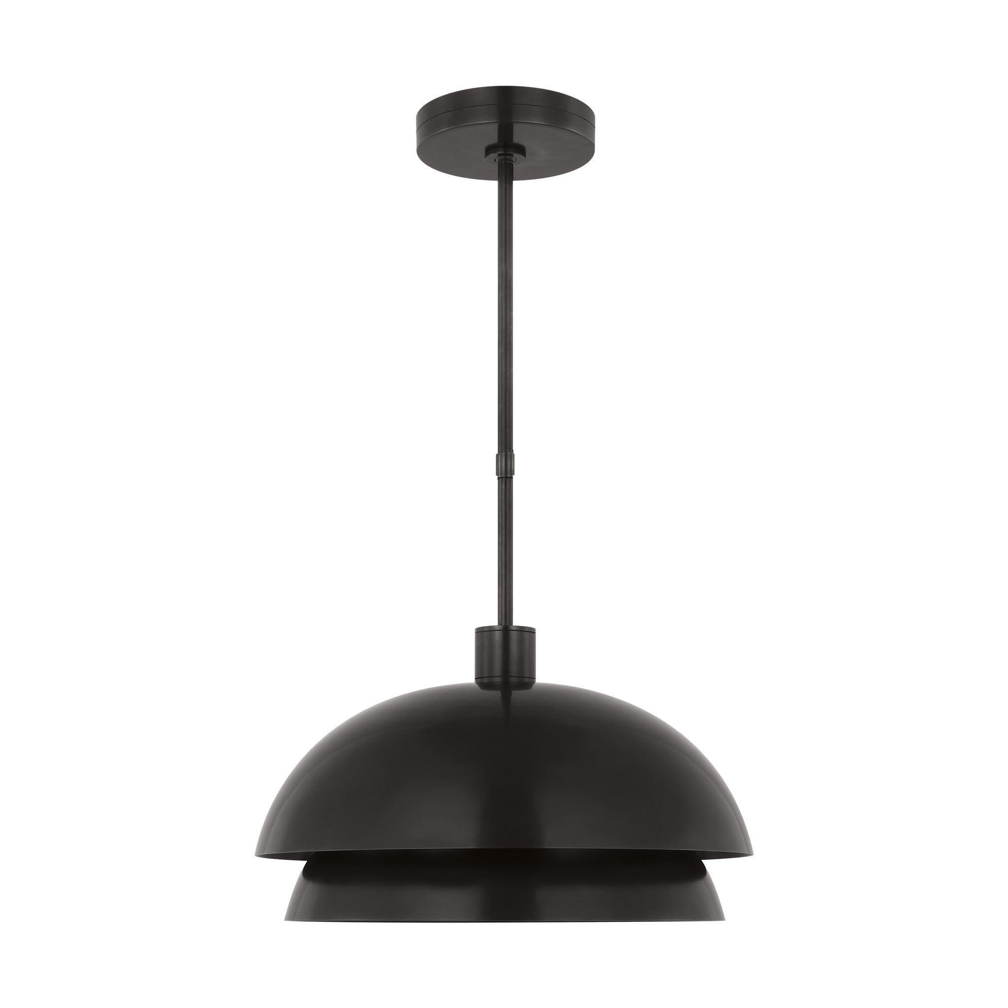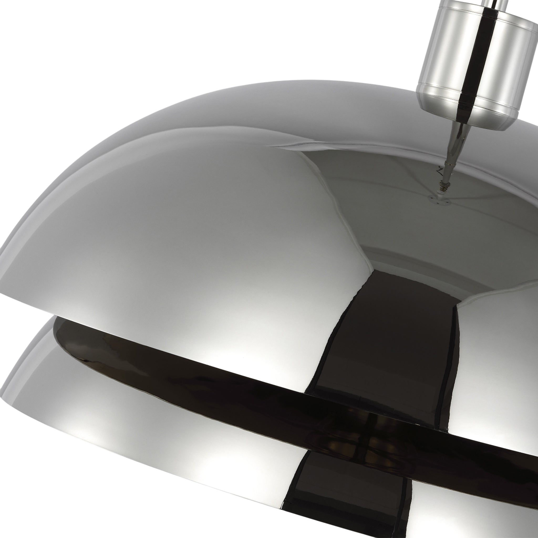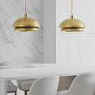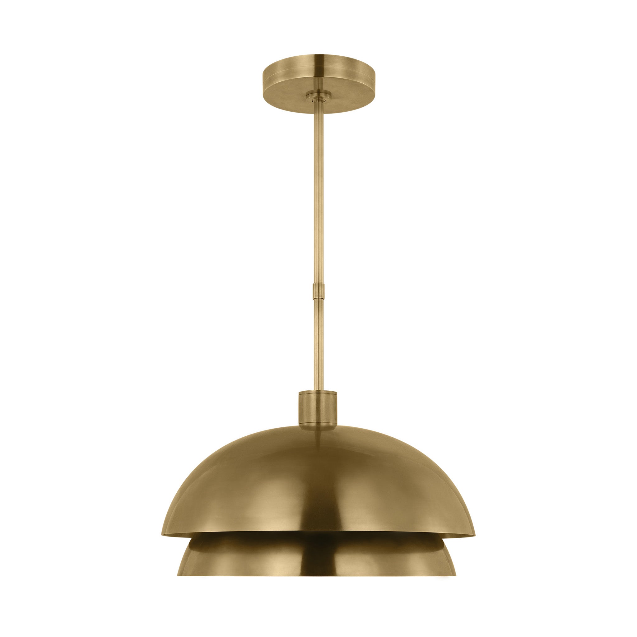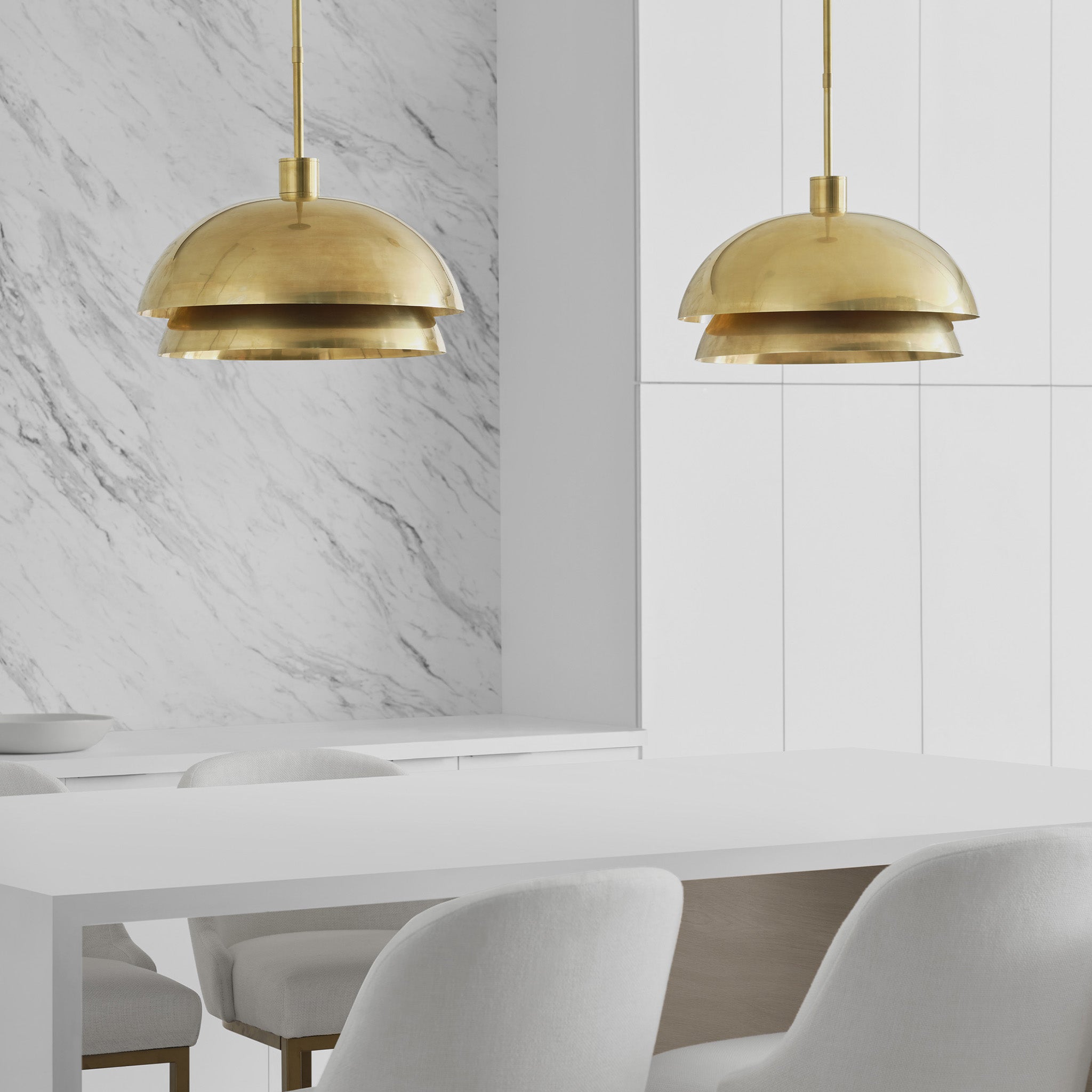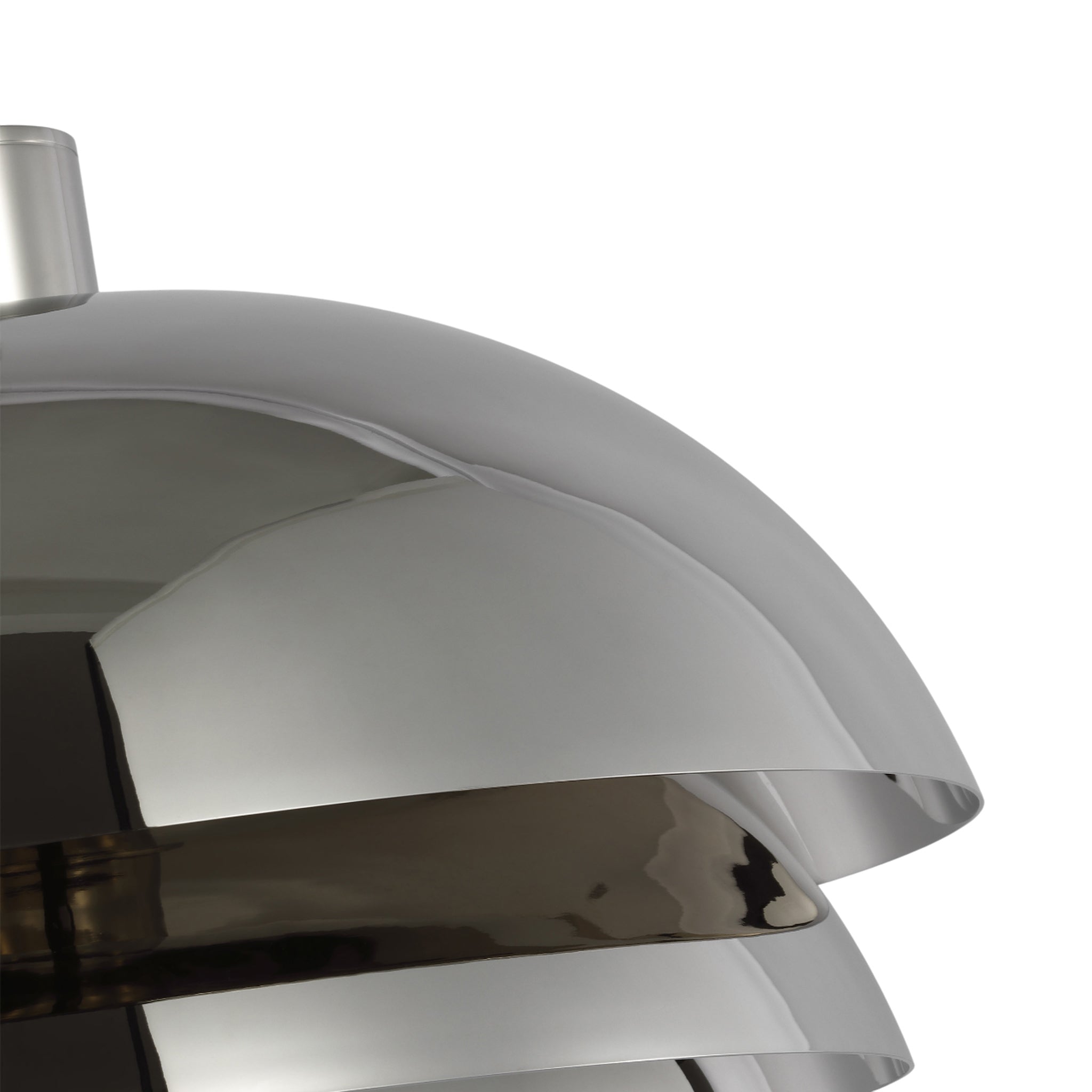 "The Shanti by Sean Lavin is a statement-making piece you’ll want to set the tone in your foyer, living room, or dining room. The design presents a fresh visual you can indulge in from any angle you look at it. Hanging from the end of a simple stem is a set large spun metal-shaped shades. Light sends the piece to another level as the multi-directional bulbs glaze the structure while creating a warm, radiant glow. Integrated LED modules bring the metal to life as they emit a bright and even layer of light through the top and bottom of the piece.