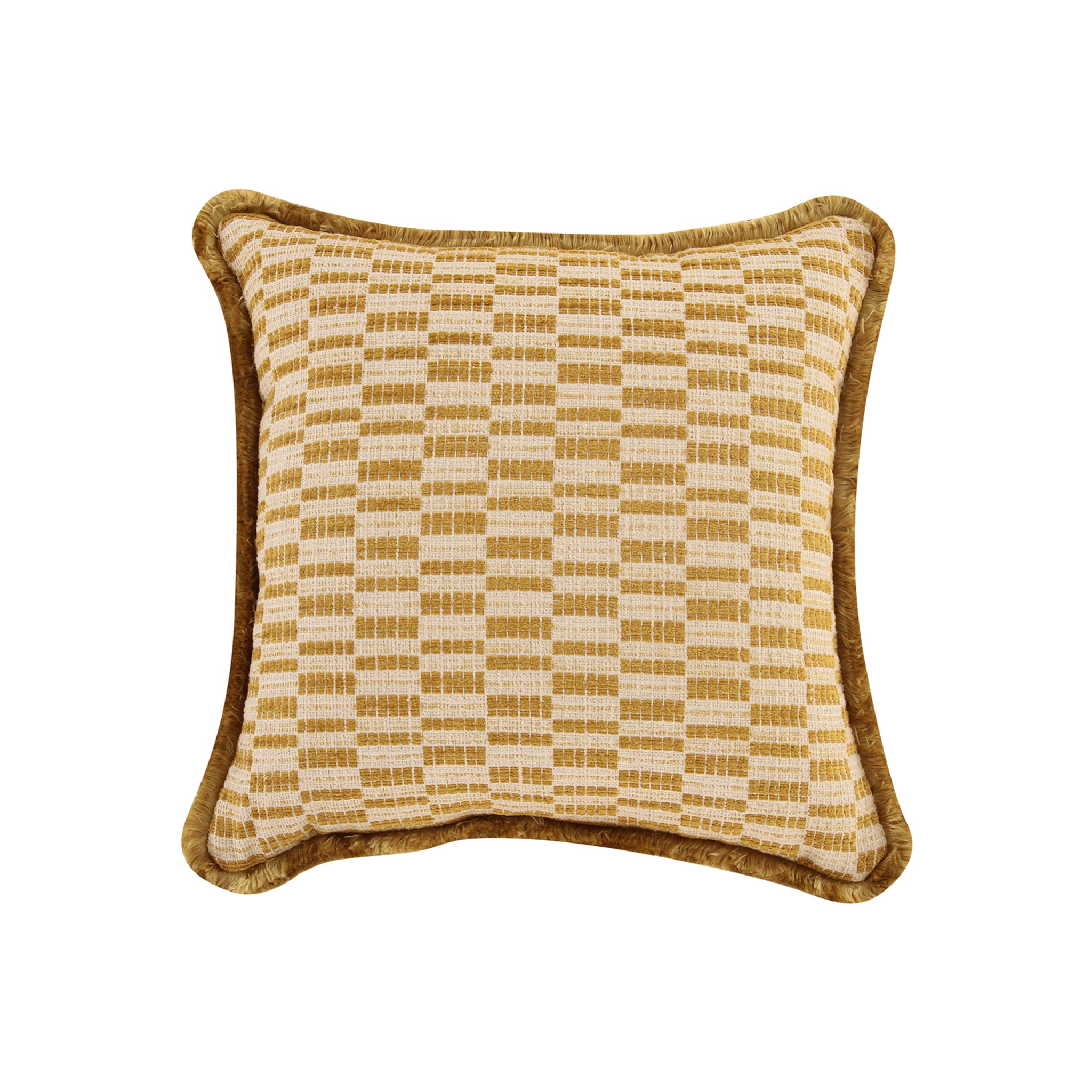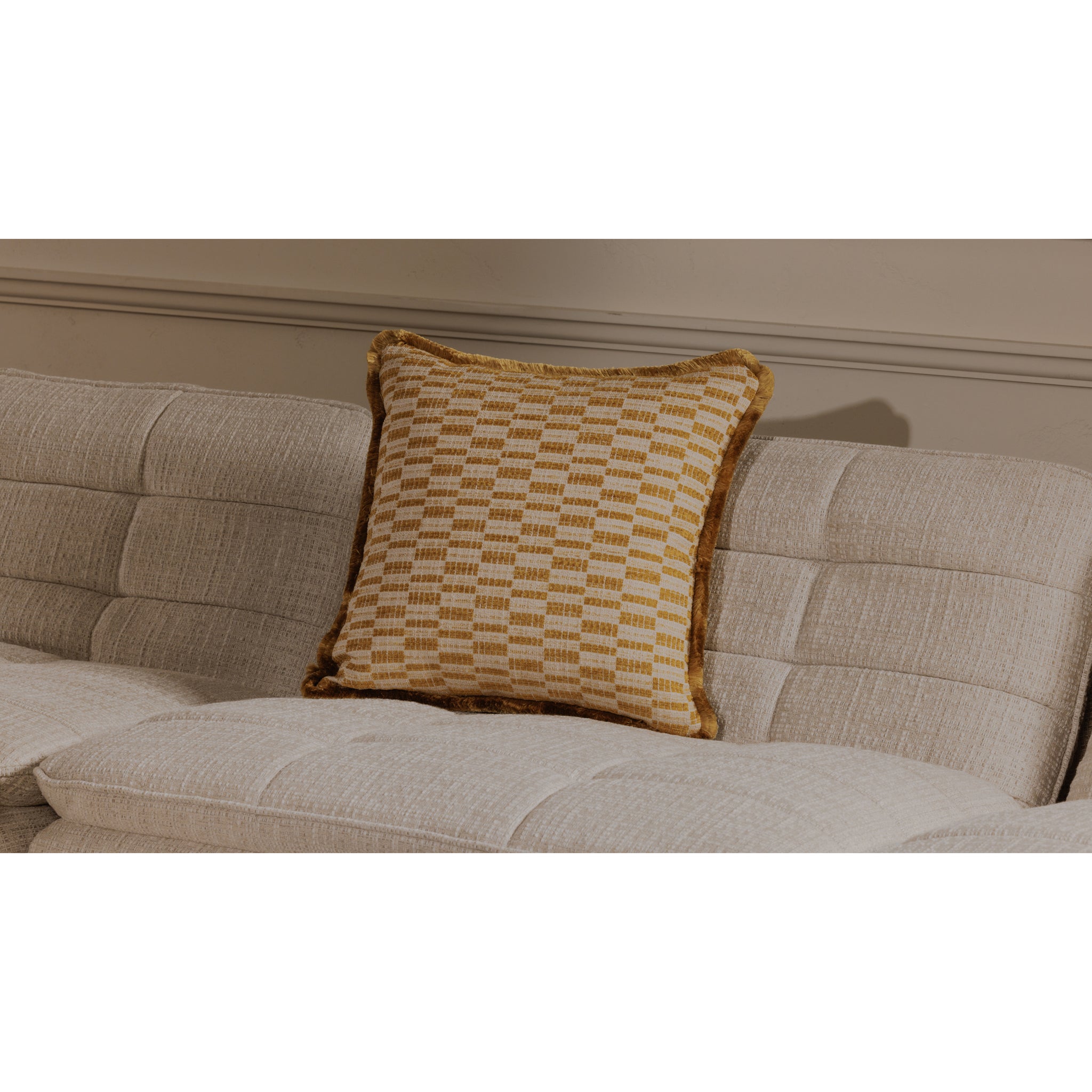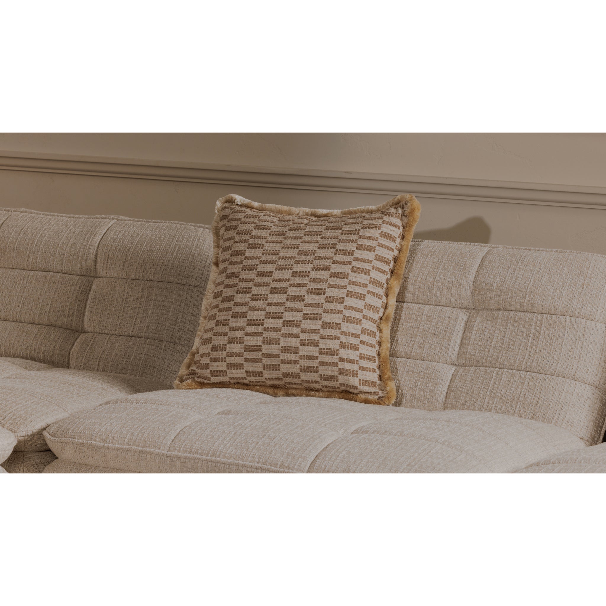 Le coussin Lionel allie charme vintage et modernité avec son imprimé géométrique audacieux d'un taupe éclatant. Soigneusement confectionné avec une bordure à franges dense, cet accessoire d'inspiration Art déco offre un confort optimal et un caractère durable.