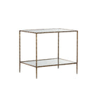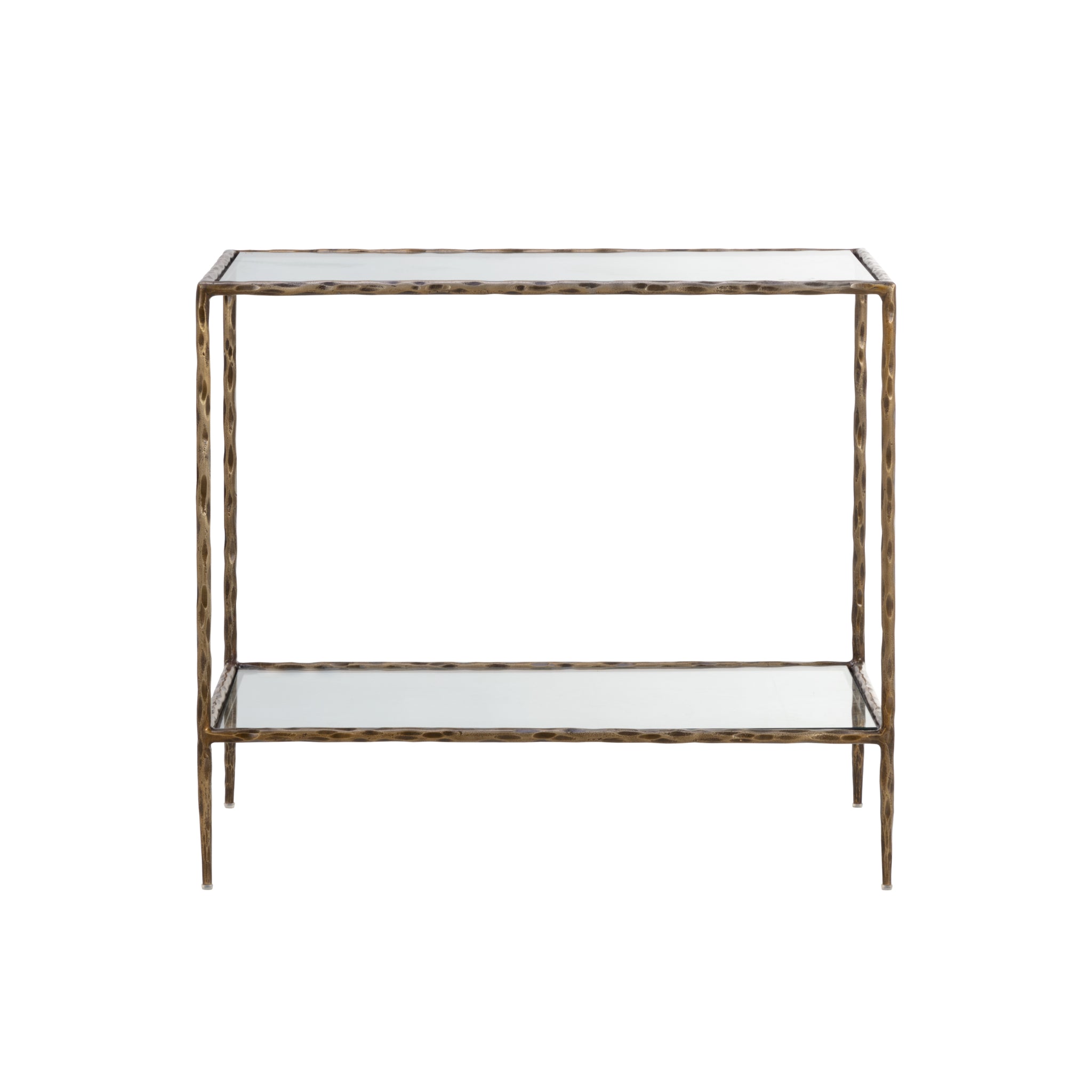 La table de chevet Monde met en valeur la beauté rustique du métal martelé à la main. Fabriquée artisanalement en Inde, elle présente une structure en fer et laiton vieilli, un plateau et une étagère en verre trempé. Fruit d'un savoir-faire raffiné, cette création est le résultat du talent d'artisans locaux.