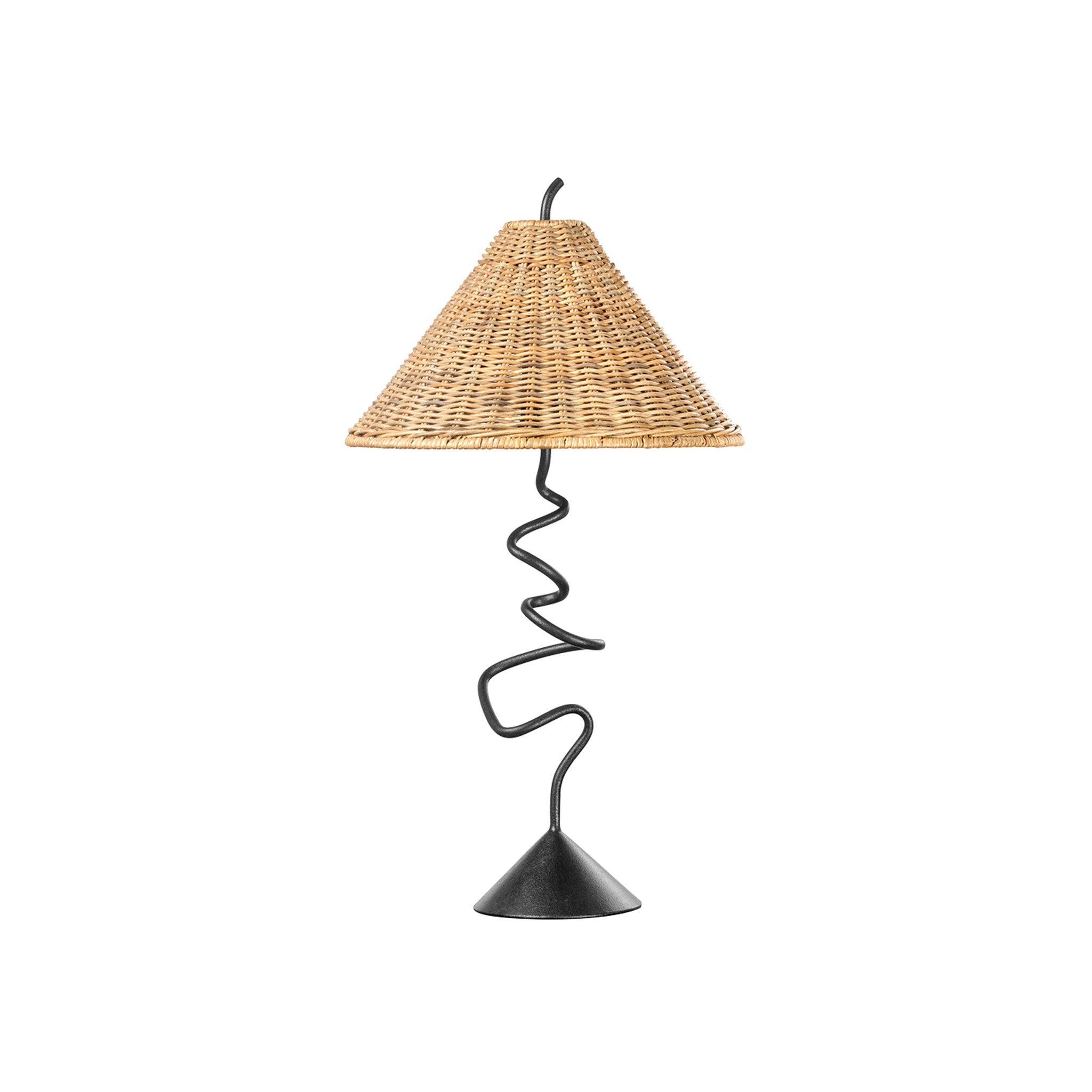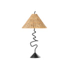 Une fine tige en fer forgé serpente depuis la base métallique jusqu'à l'abat-jour fuselé en rotin naturel, créant une forme fantaisiste à la fois sérieuse et sculpturale. Placez cette lampe partout dans votre maison pour une touche ludique et artistique.